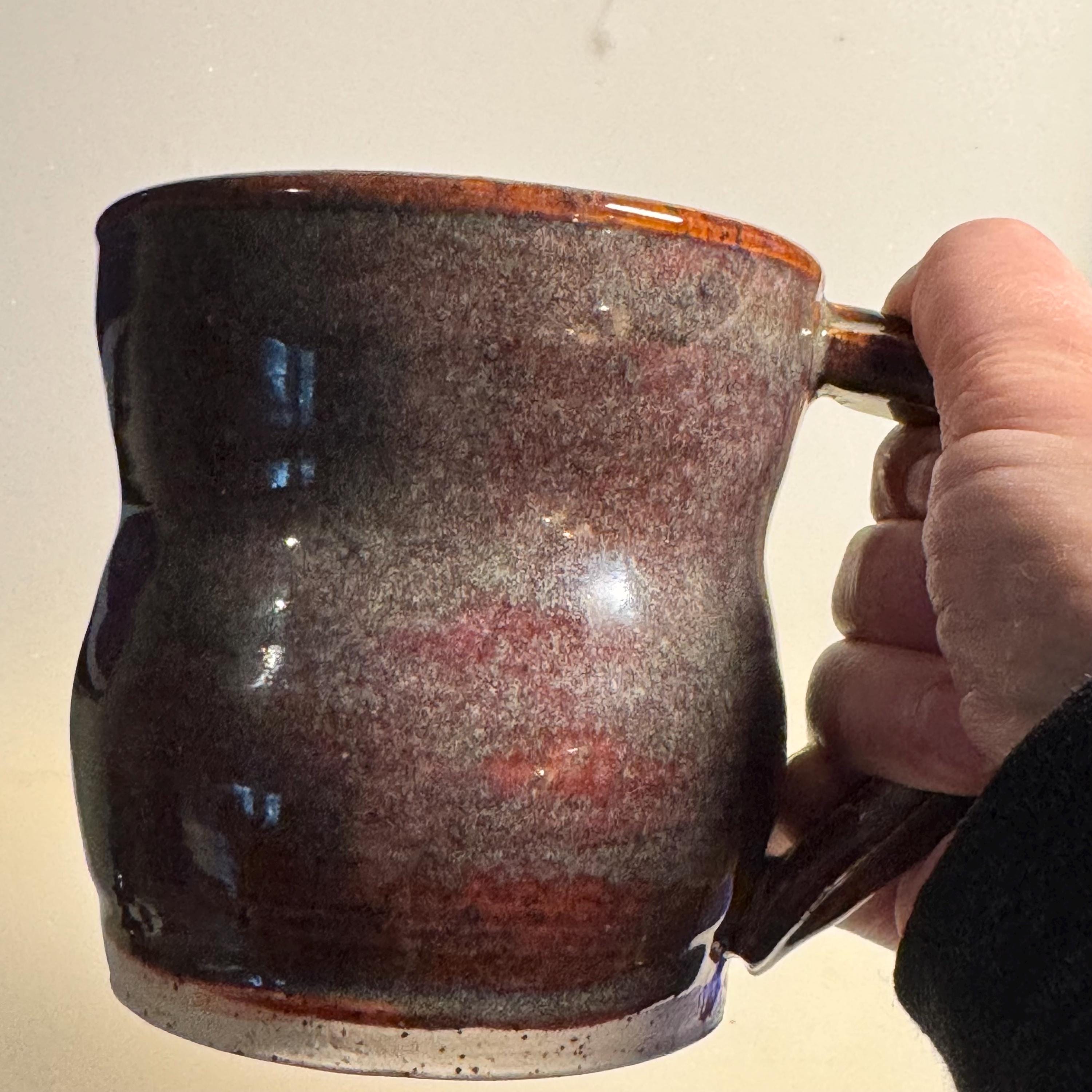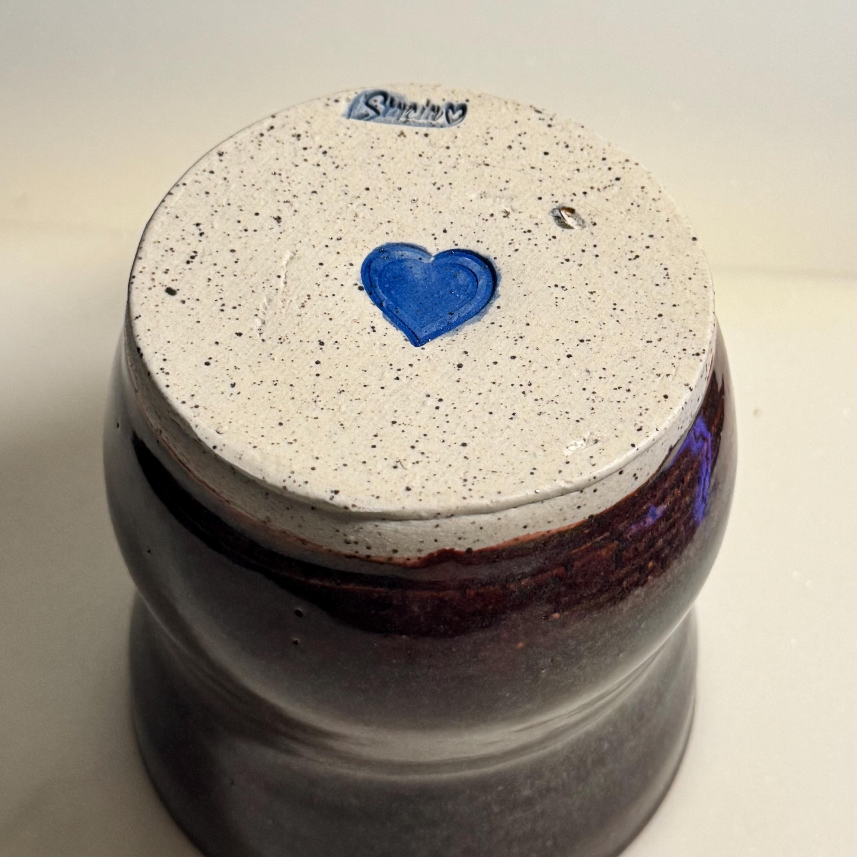 Details: Material: Speckled stoneware Glaze: Deep red plum with a blue overlay, glossy finish Dimensions: 4 inches tall, 3.75 inches wide Capacity: 12 ounces