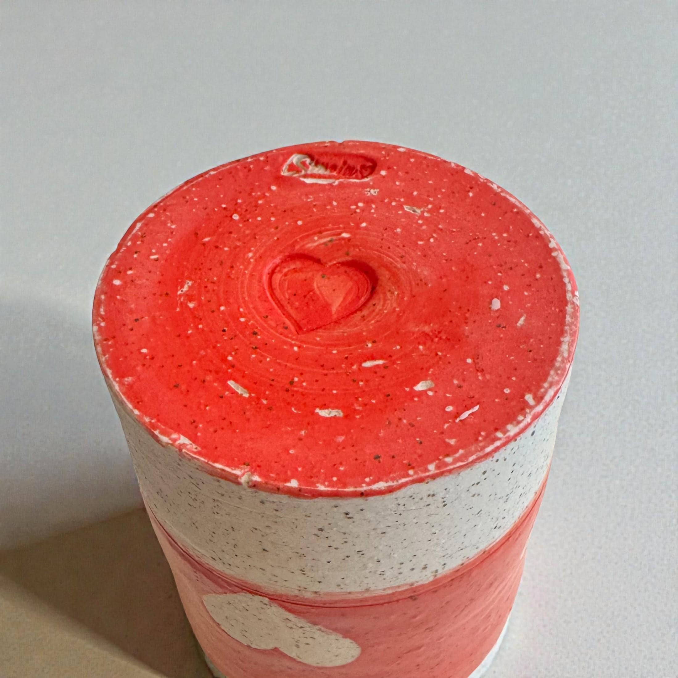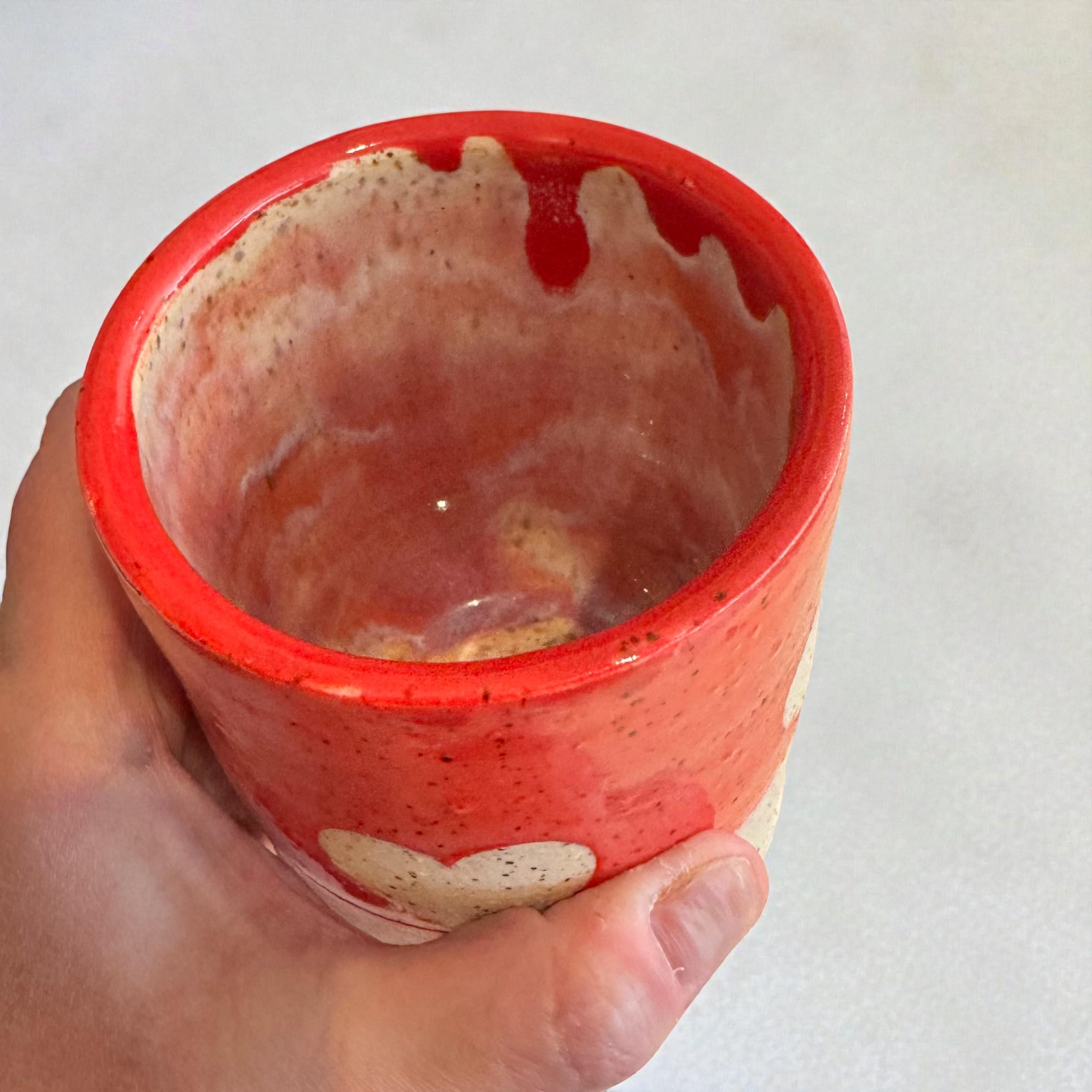This one-of-a-kind ceramic tumbler is wheel-thrown from white speckled stoneware and finished with a warm red and pink glazed band, accented by a raw clay heart motif. The contrast between glossy glaze and exposed clay gives this piece a soft, handmade character that feels both playful and grounded.