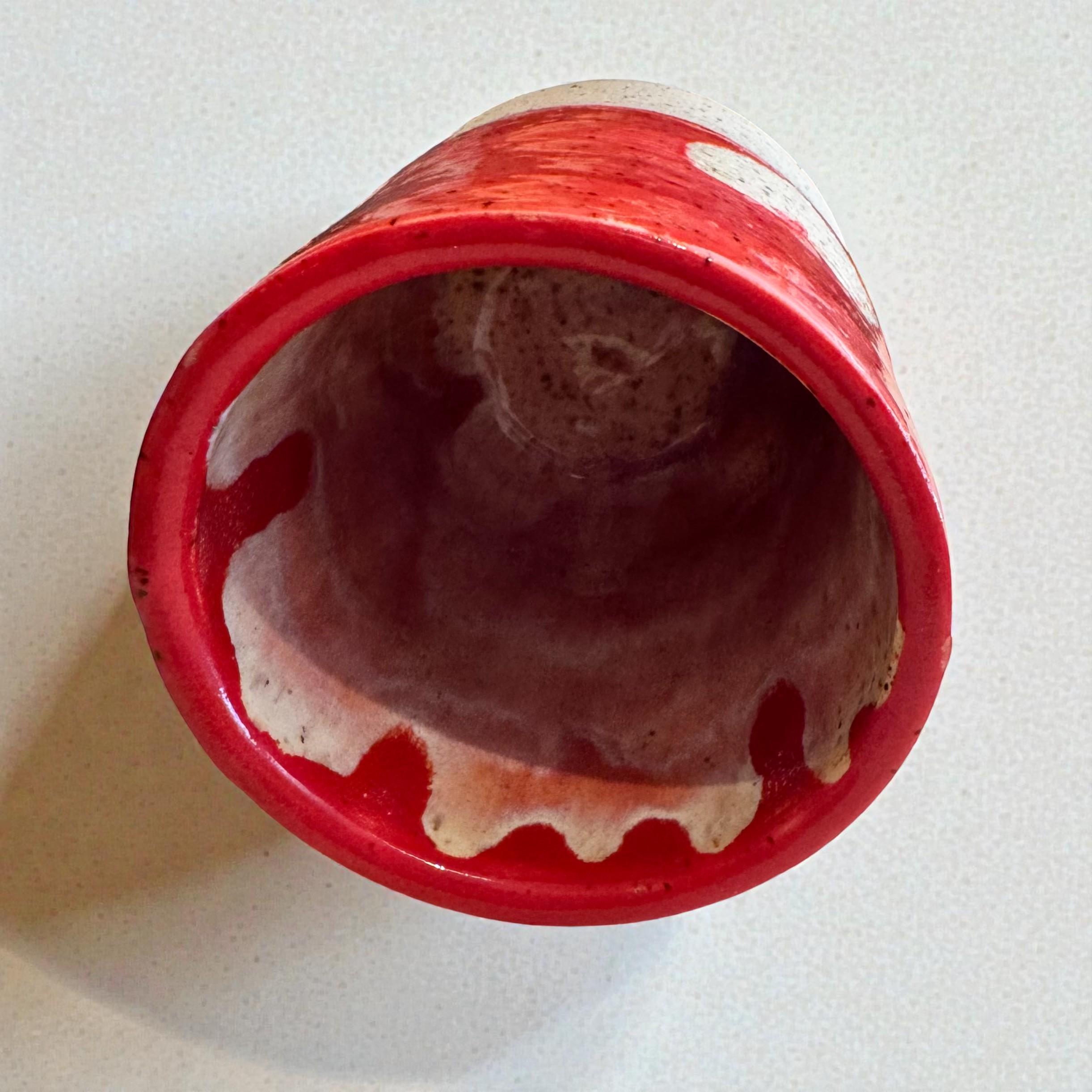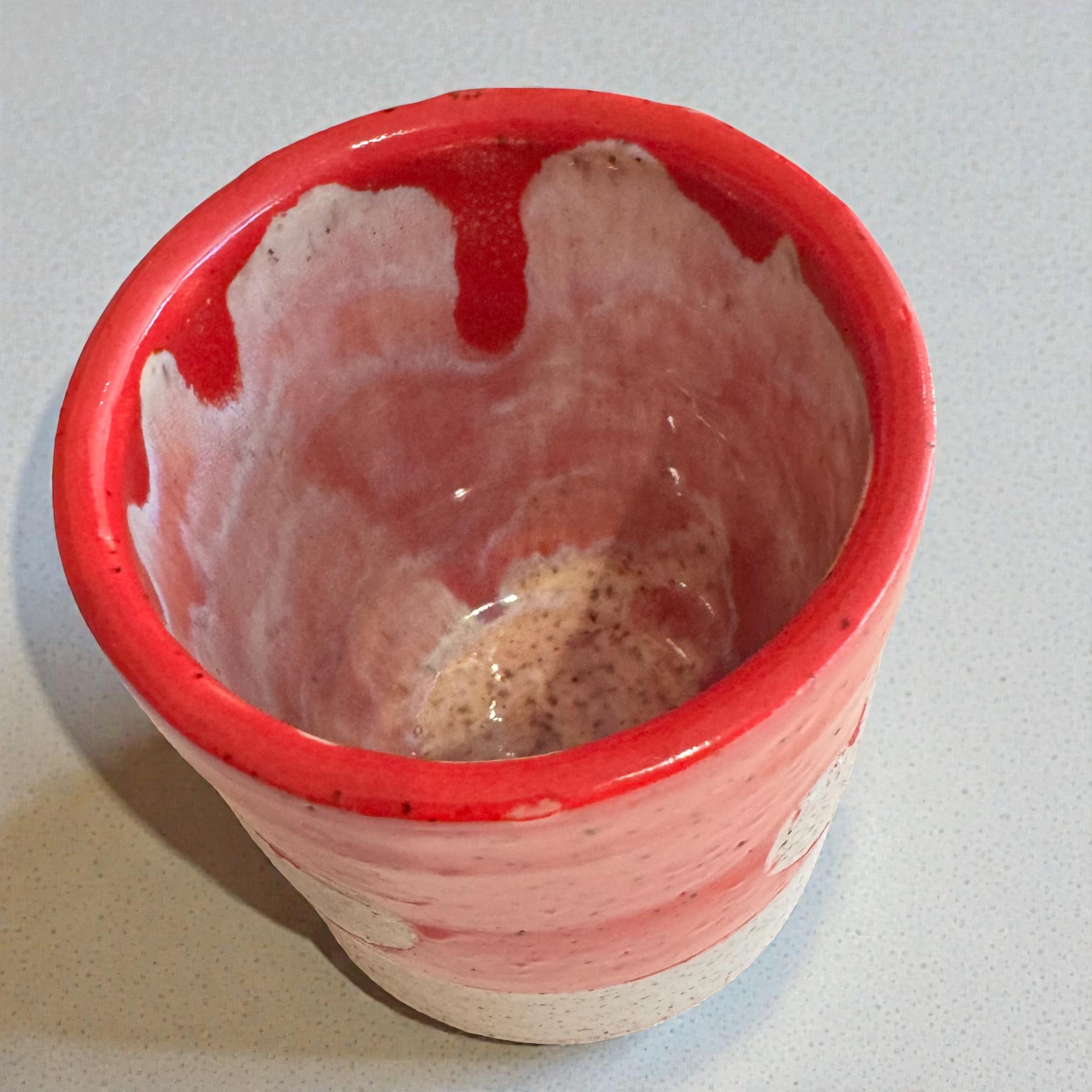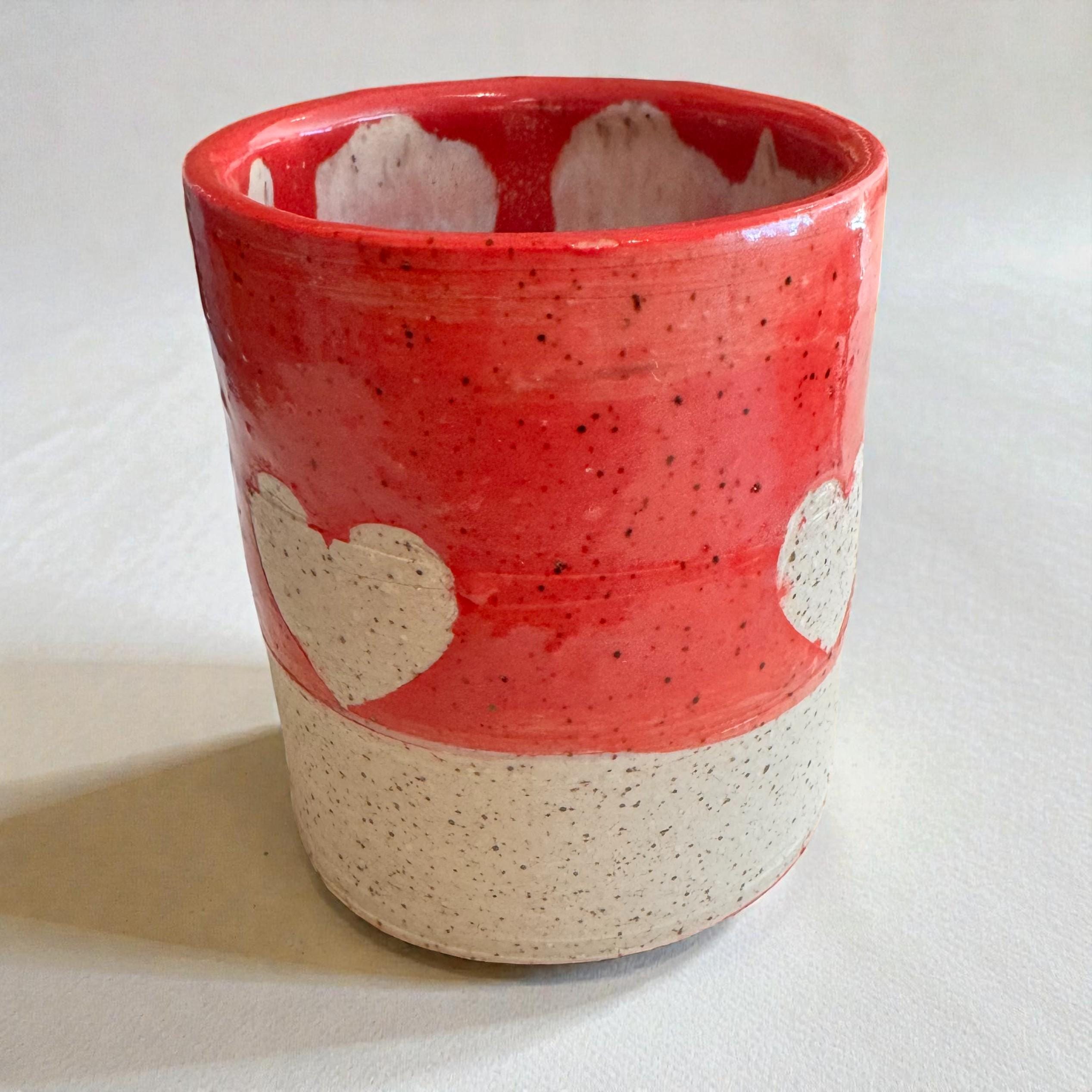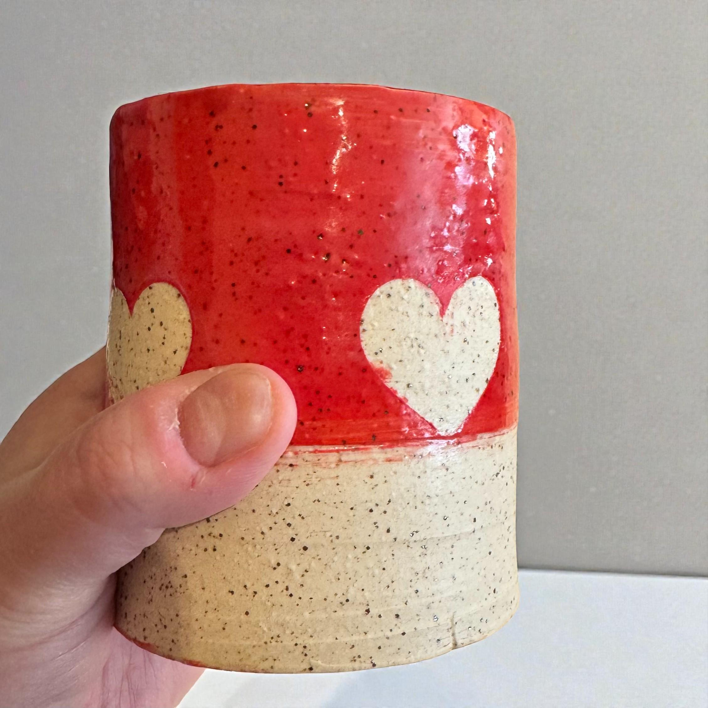Details: * Approx. 10 oz capacity * Measures about 4” tall * Wheel-thrown white speckled stoneware * Red and pink glaze with raw clay heart accent * Glossy upper exterior with natural matte clay details and bottom