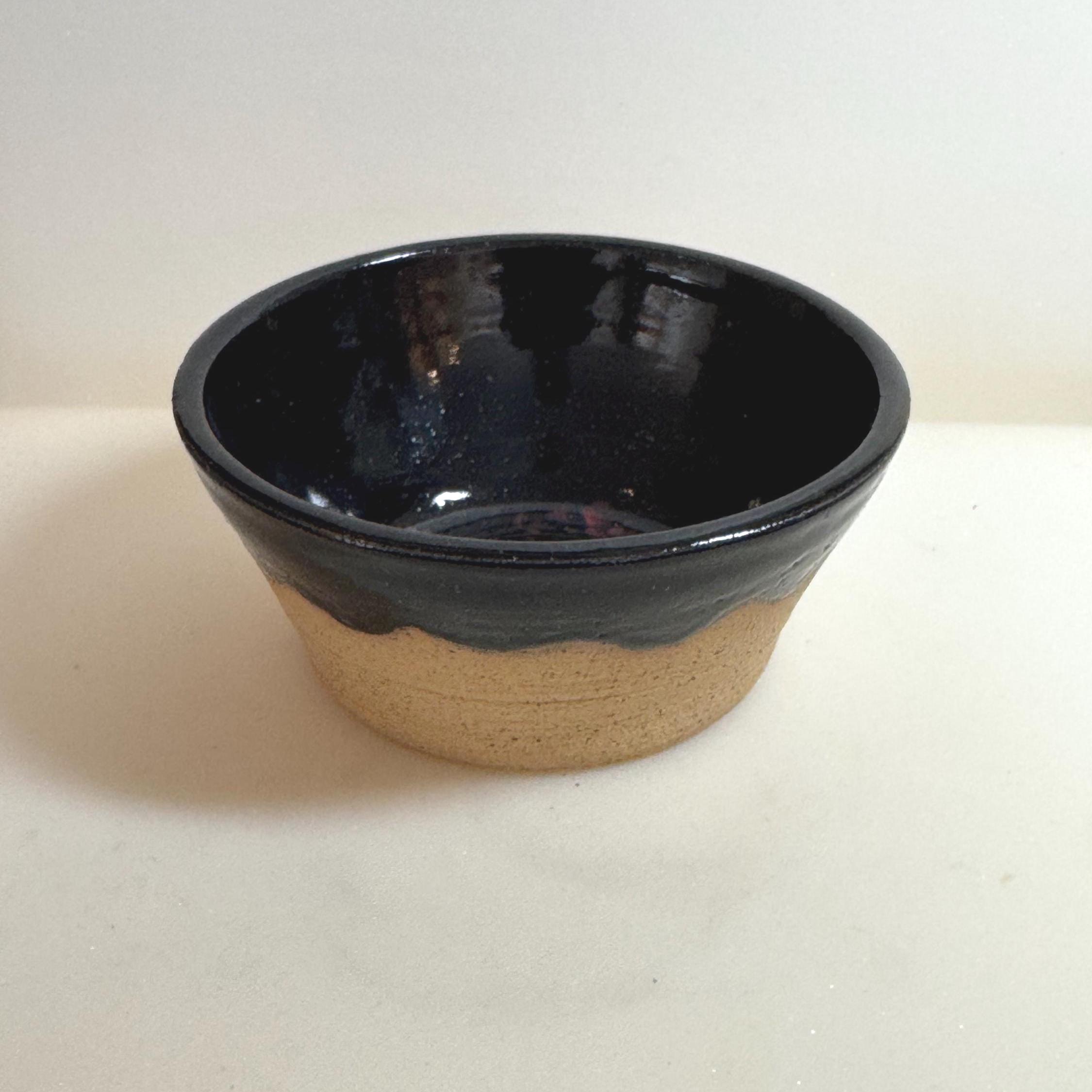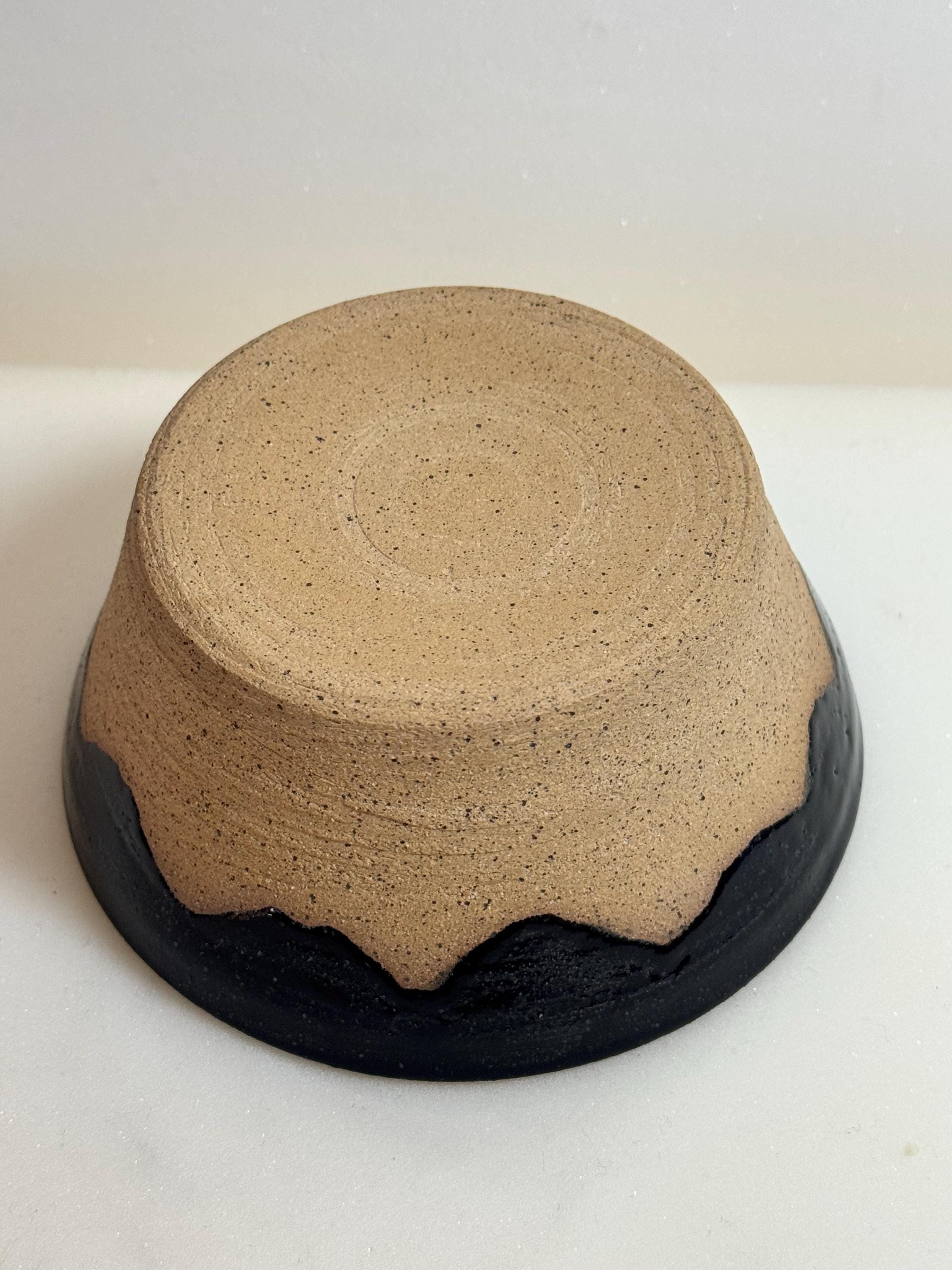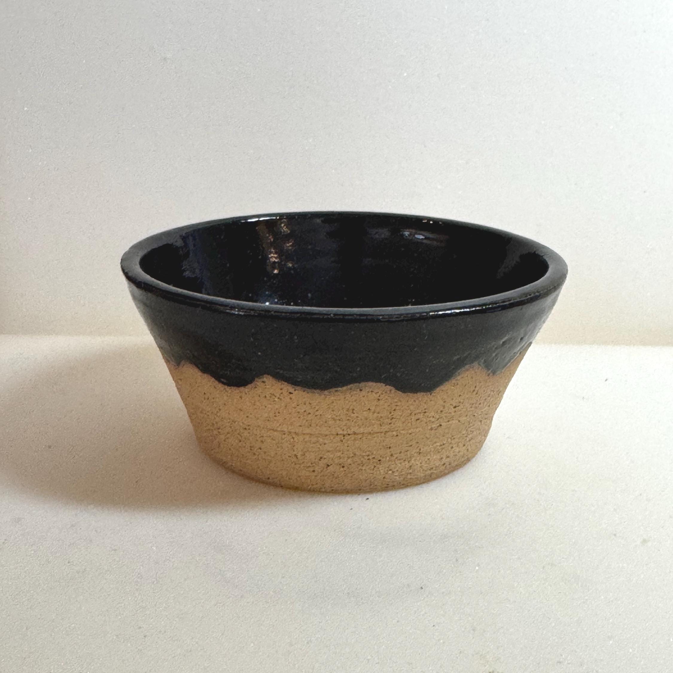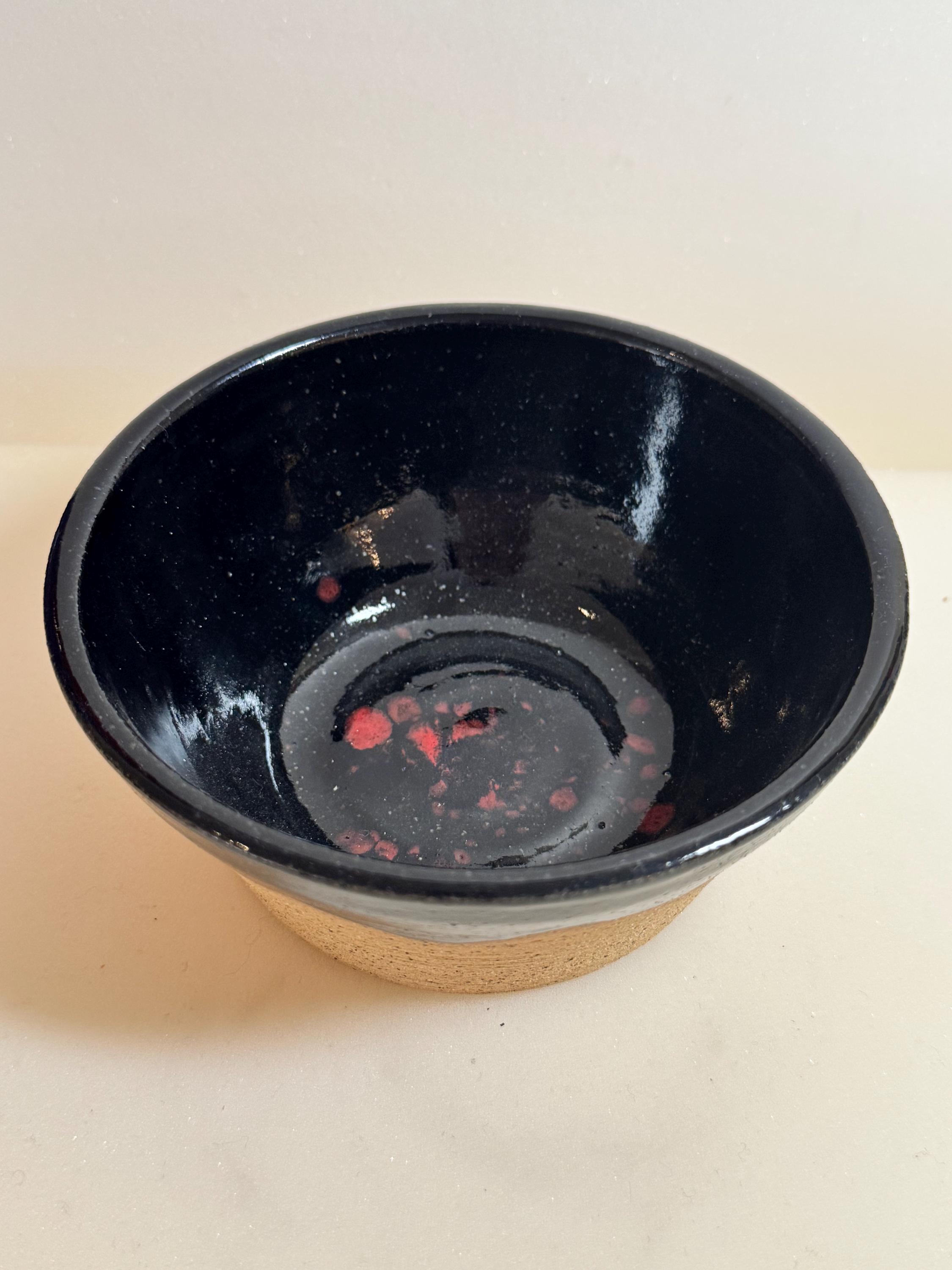 Details: Material: Speckled buff stoneware Glaze: Glossy black interior with red accent; raw clay base Dimensions: Approx. 2.5 inches tall, 4 inches wide Capacity: Ideal for ice cream, berries, or snacks Base: Unglazed foot