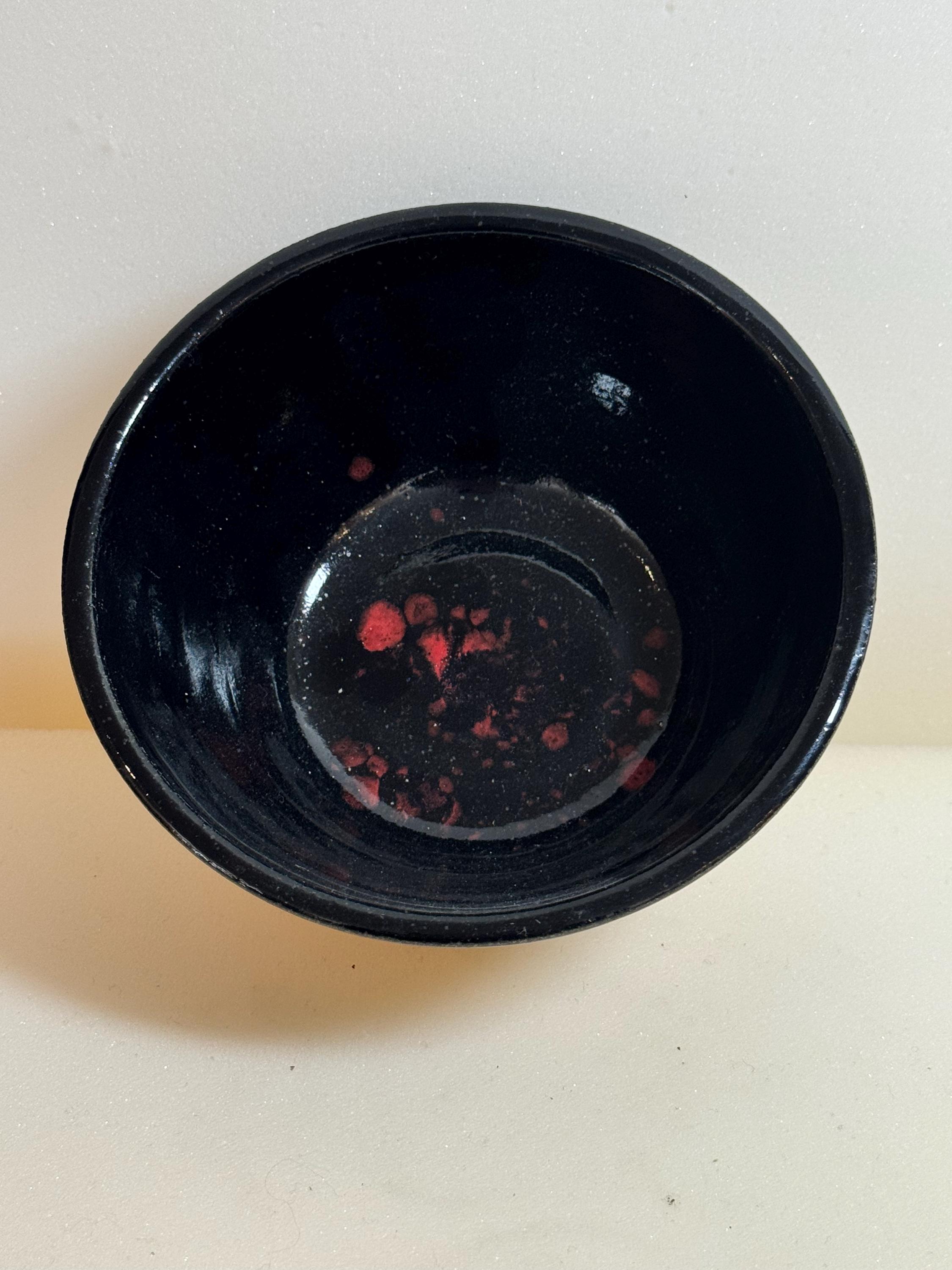 This handmade ceramic bowl is wheel-thrown from speckled buff stoneware and finished with a glossy black glaze that drips naturally over the textured clay base. A splash of red glaze at the center adds an unexpected pop of color, creating a bold contrast against the rich, dark interior. The base remains raw for a natural, tactile feel.