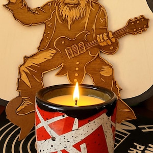 This handmade ceramic espresso cup is wheel-thrown from stoneware clay and high-fired for strength and durability. Inspired by EVH’s iconic guitar design, the exterior features an explosive red, white, and black abstract glaze with expressive splatter details. The standout handle is shaped like a miniature red electric guitar—making it a functional piece of rock ‘n roll art. The interior is glazed in a glossy, speckled denim blue, offering cool contrast to the fiery exterior.