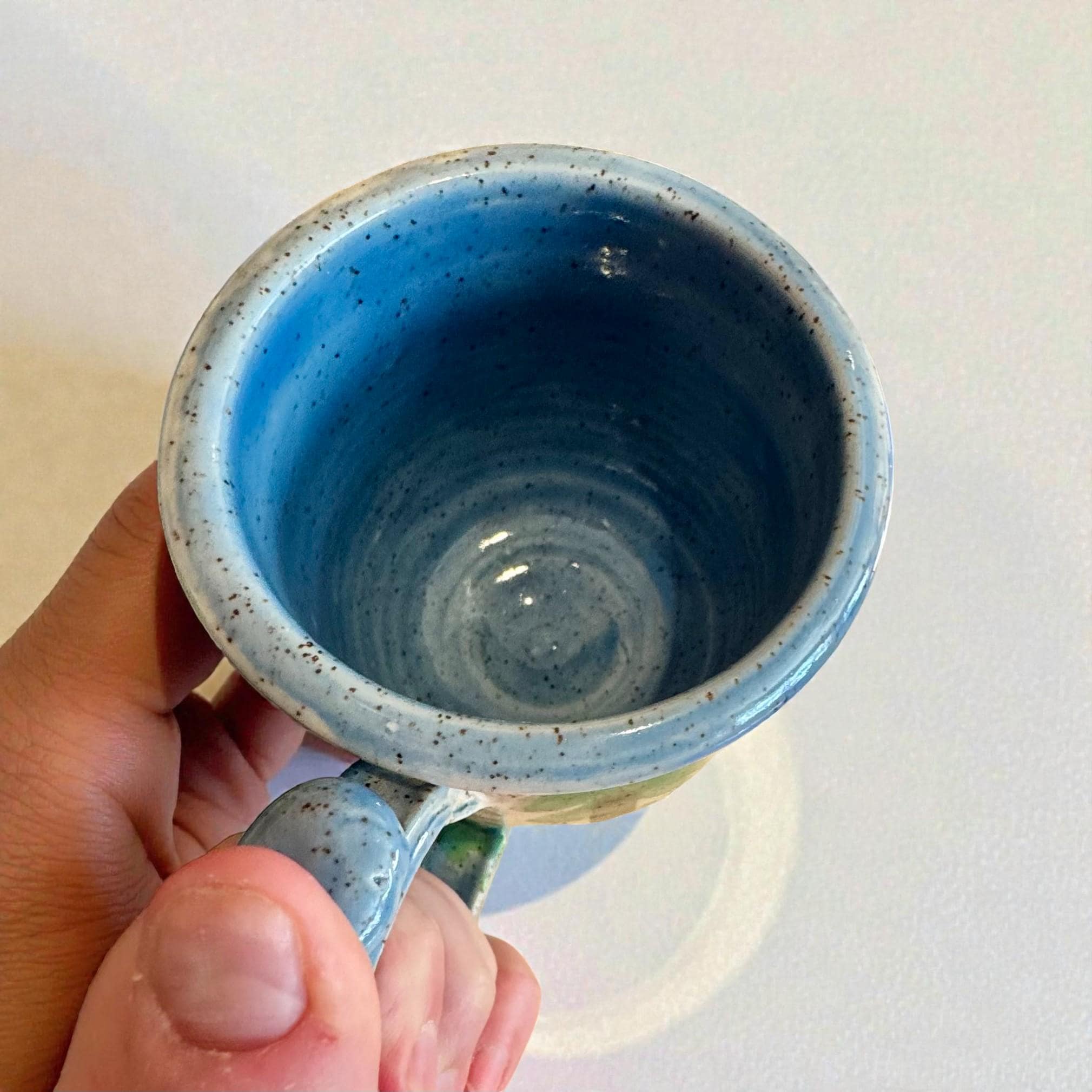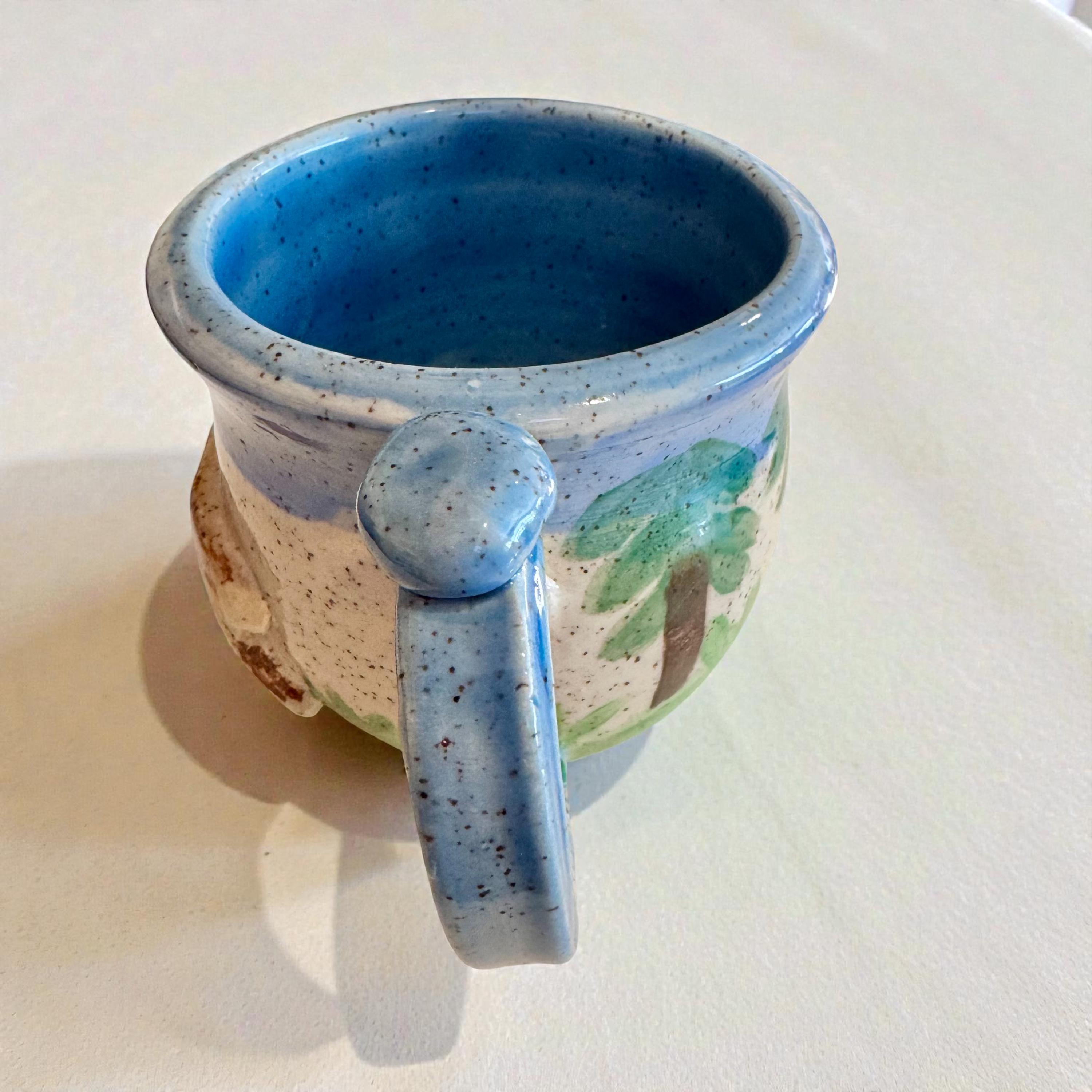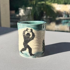 Details ✔ Approx. 12 oz capacity. ✔ 3.5” tall x 3.5” wide ✔ Handmade stoneware ✔ Raised bear detail with hand-painted forest design ✔ Glossy glazed interior and exterior ✔ One of a kind – this exact mug is the one you’ll receive