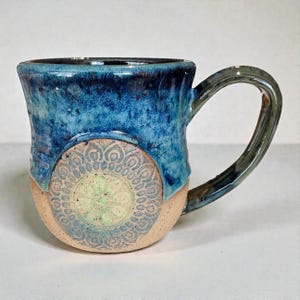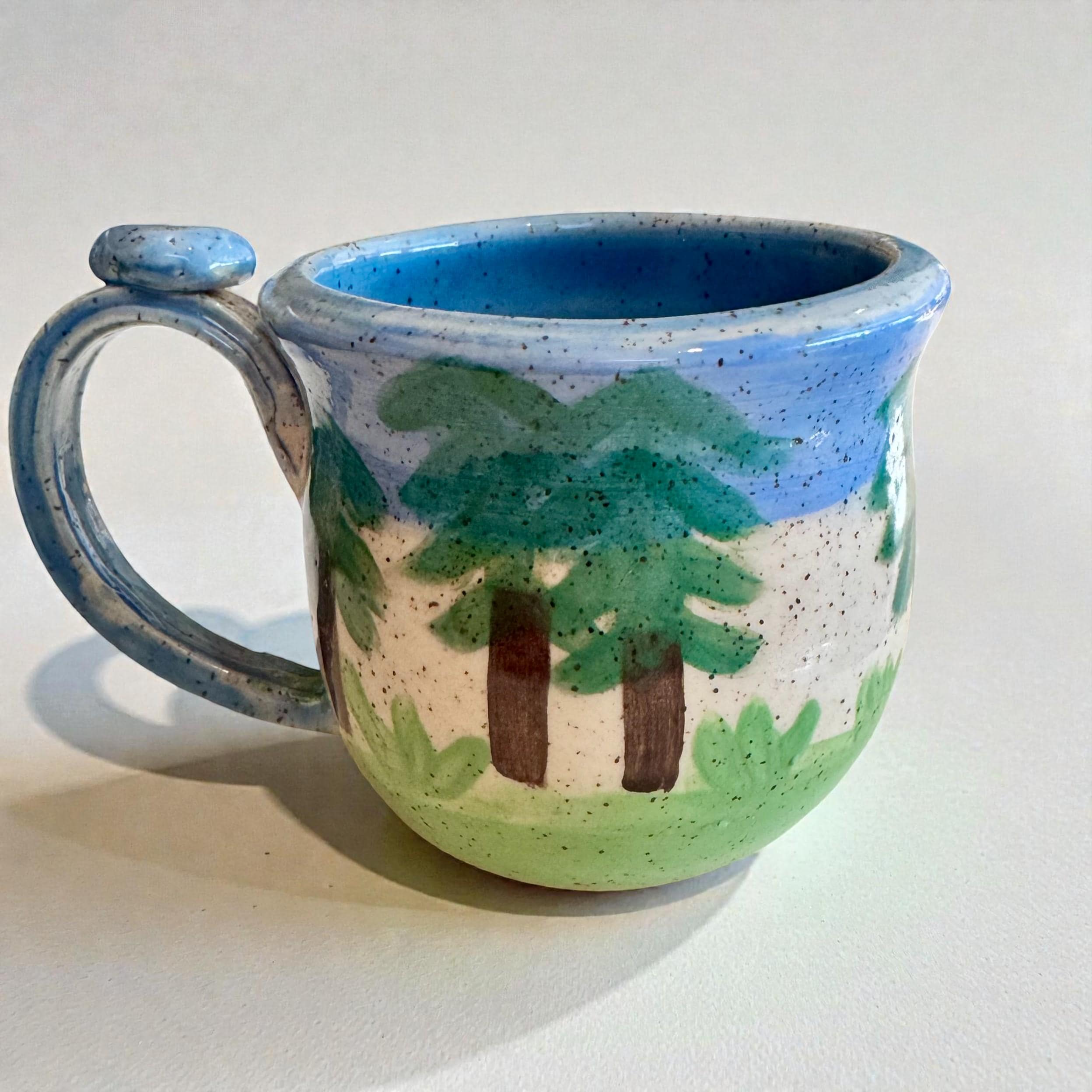 This one-of-a-kind ceramic mug features a peaceful forest scene with a raised bear detail wrapped around the exterior. The bear is created using a hand-applied relief and finished with layered glazes that bring warmth and depth to the design. Soft blues, greens, and natural stoneware tones give the mug an earthy, outdoors-inspired feel.
