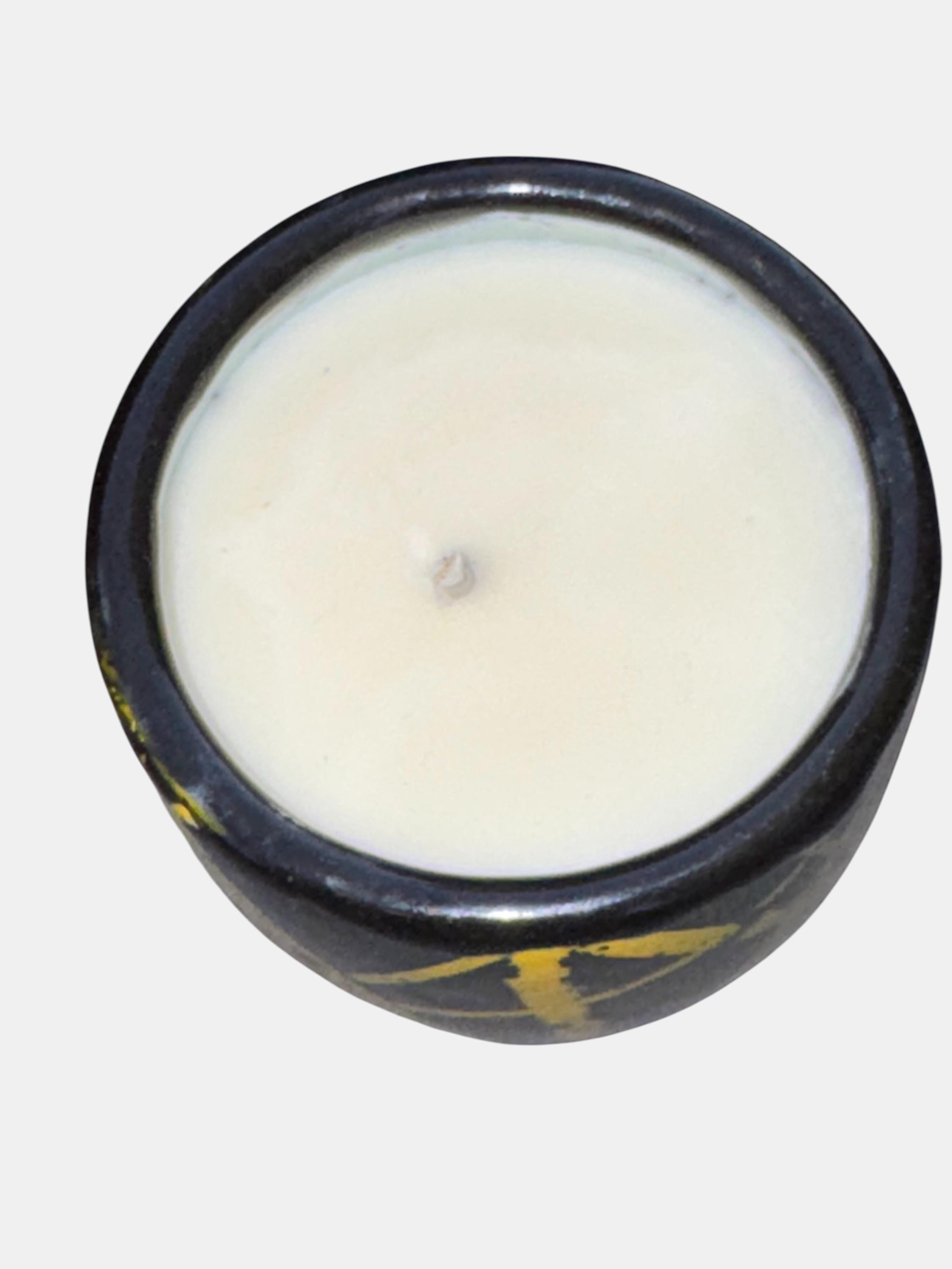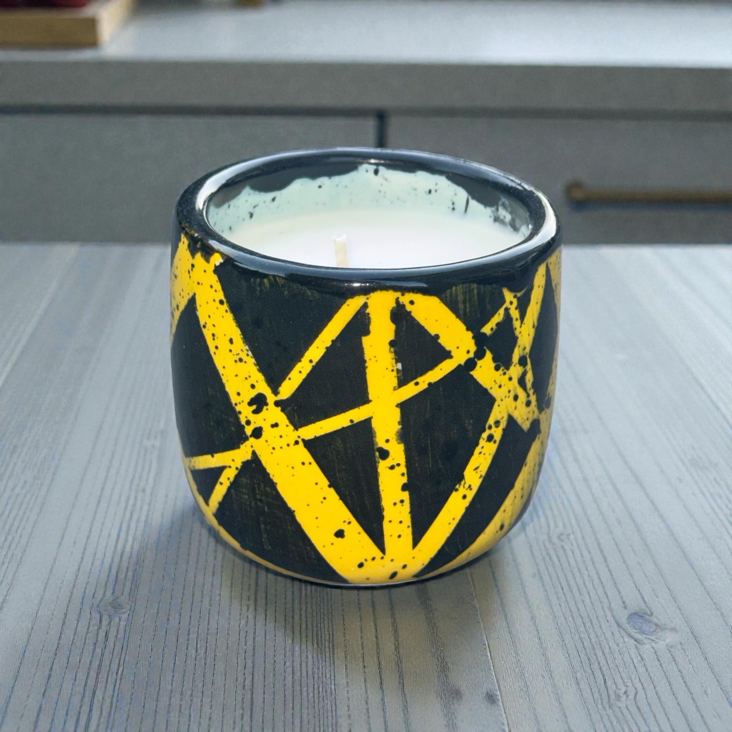Features & Why You’ll Love It 🎸 Wheel-thrown stoneware with bold yellow + black stripes 🎸 Fully Glazed Reusable vessel once the candle is done 🎸 Clean-burning soy wax, hand-poured by Shining Sol 🎸 Approx. 7–8 oz: 🎸 Approx. 35–40 hr burn time 🎸 Handmade — each one has its own unique character