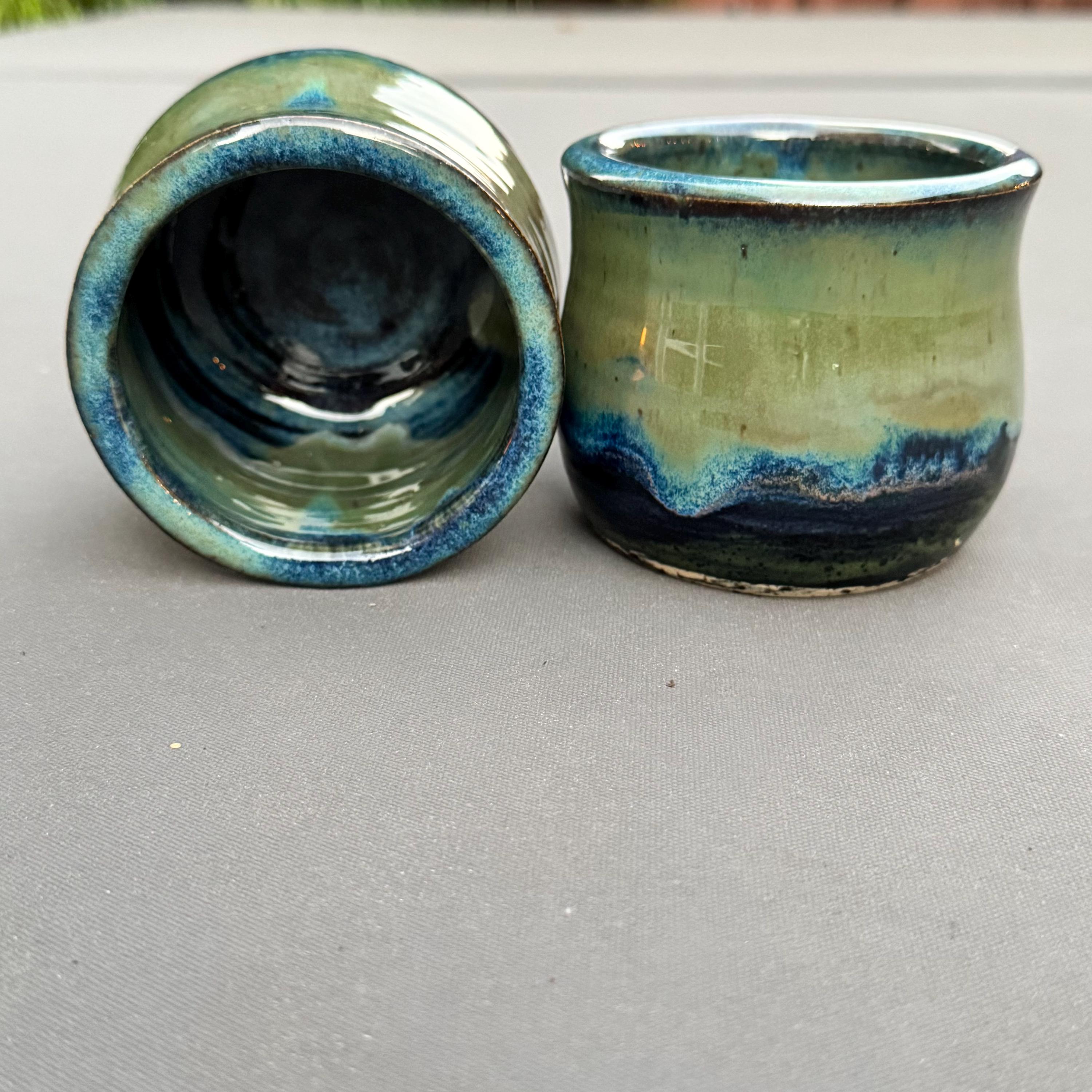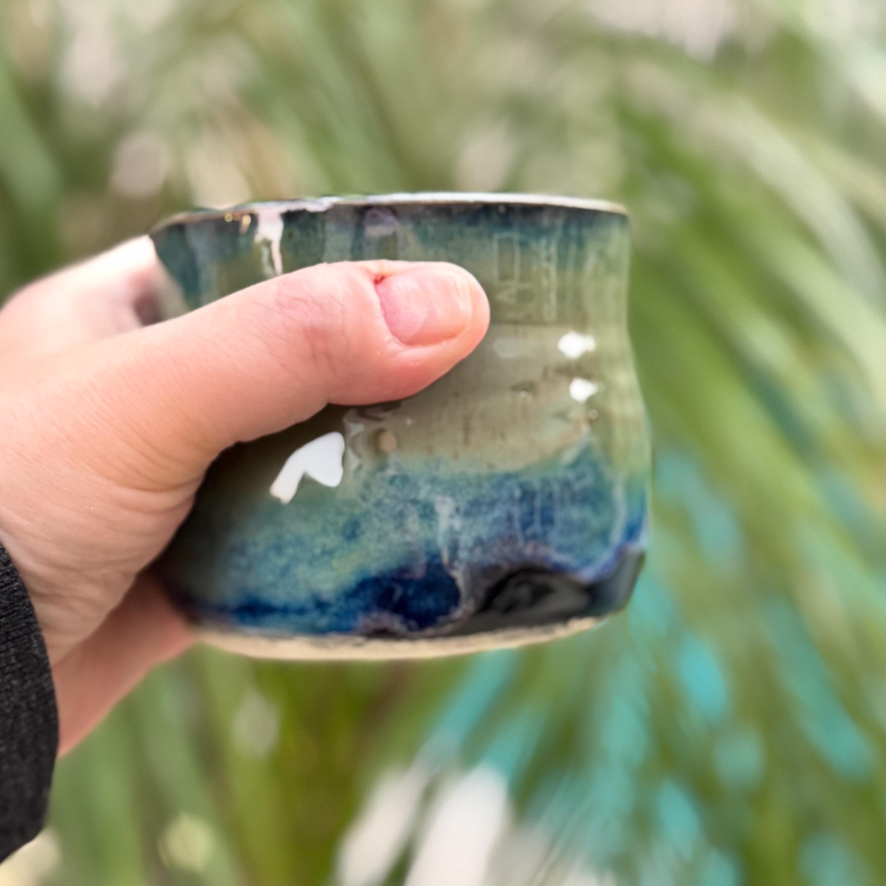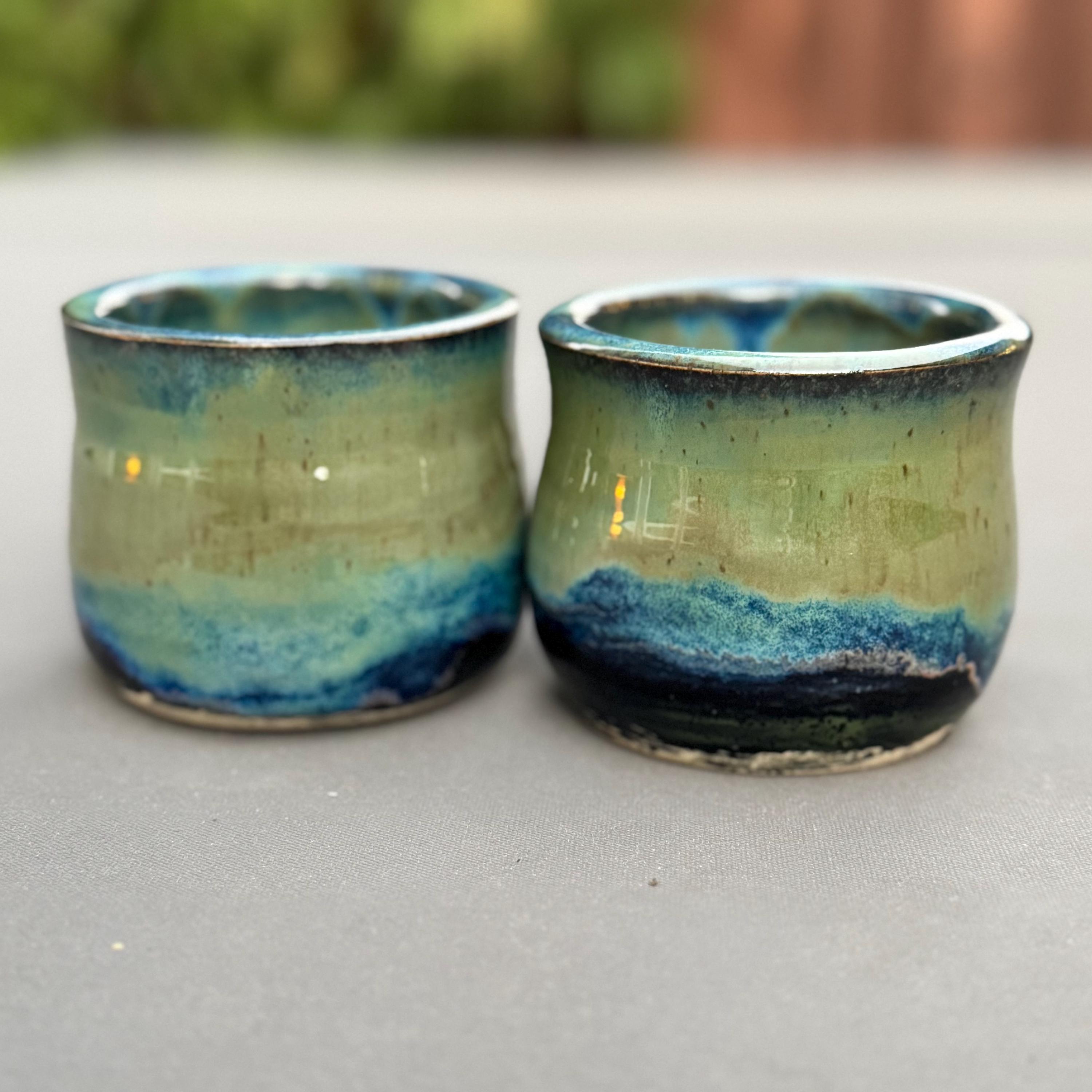 ✔ Holds 8 oz ✔ Approx. 3" tall x 3" wide ✔ Speckled clay ✔ Flowing Green & Blue layered glaze ✔ Dishwasher and microwave safe (hand washing preferred)
