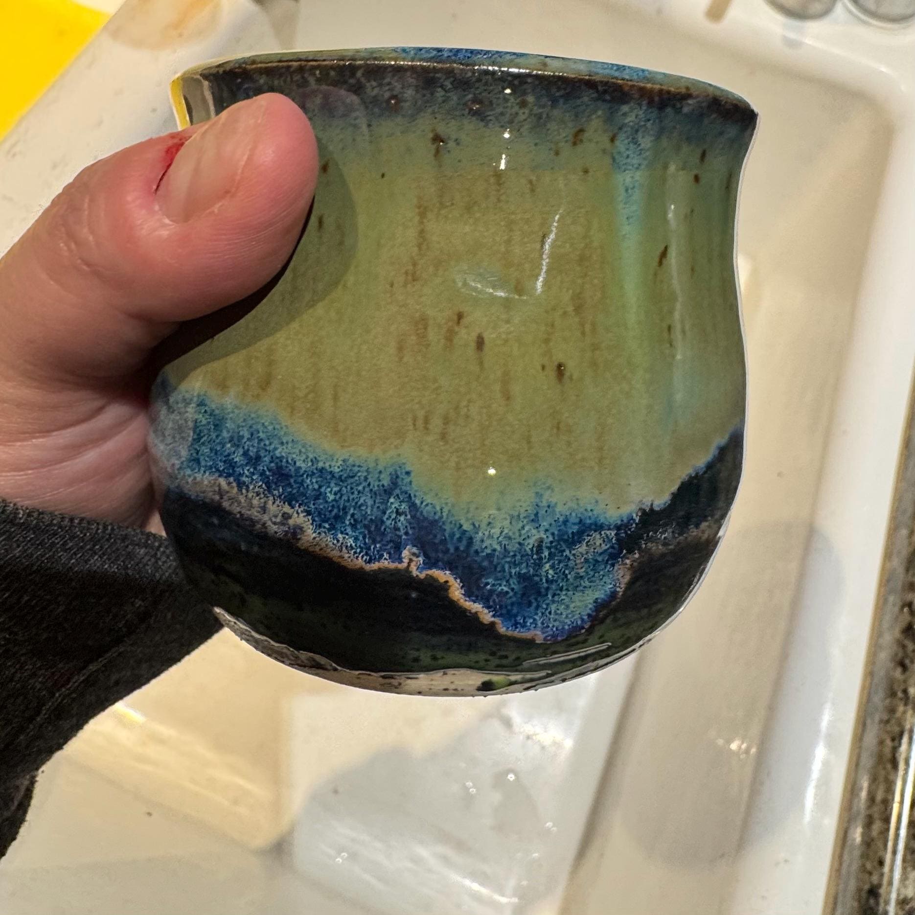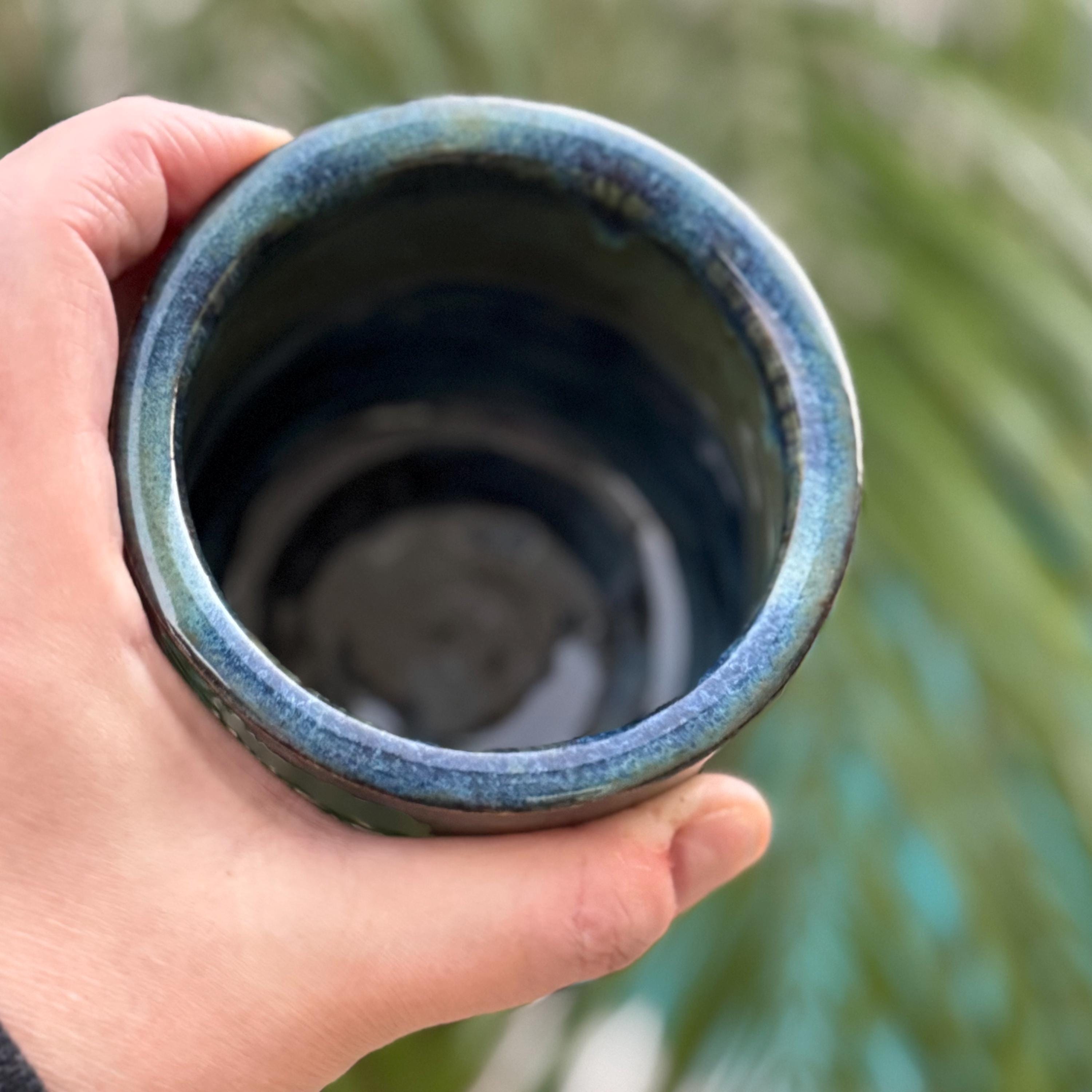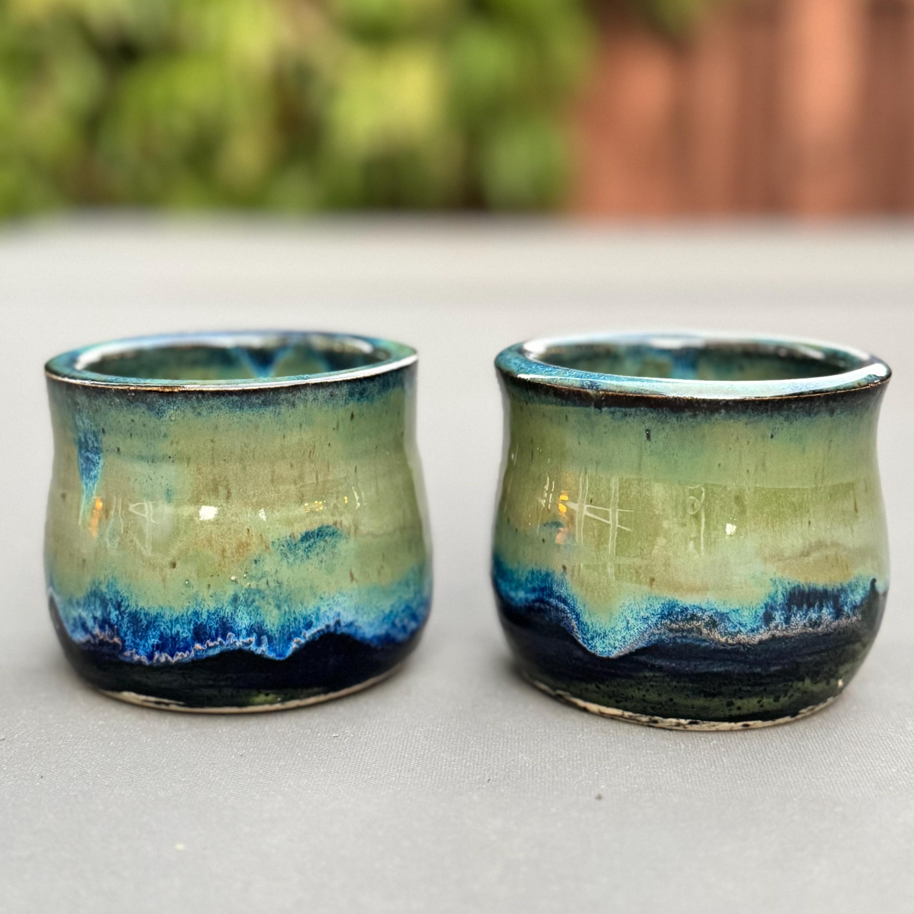 ✔ Holds 8 oz ✔ Approx. 3" tall x 3" wide ✔ Speckled clay ✔ Flowing Green & Blue layered glaze ✔ Dishwasher and microwave safe (hand washing preferred)