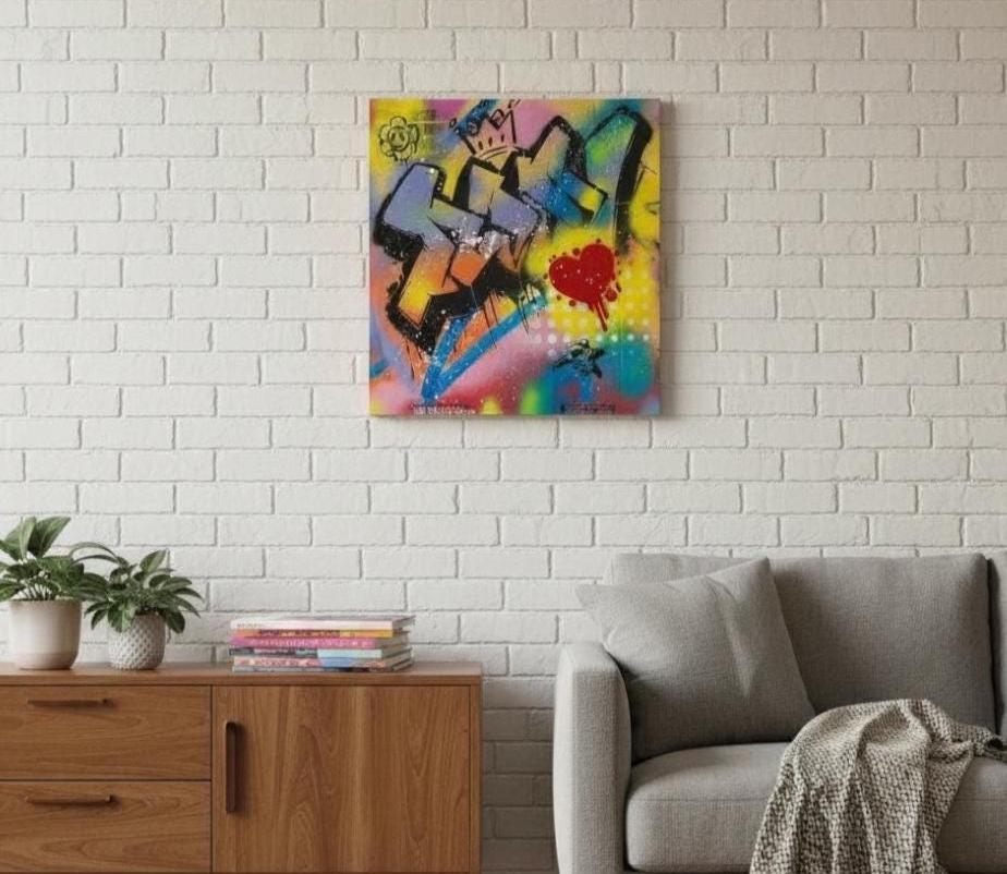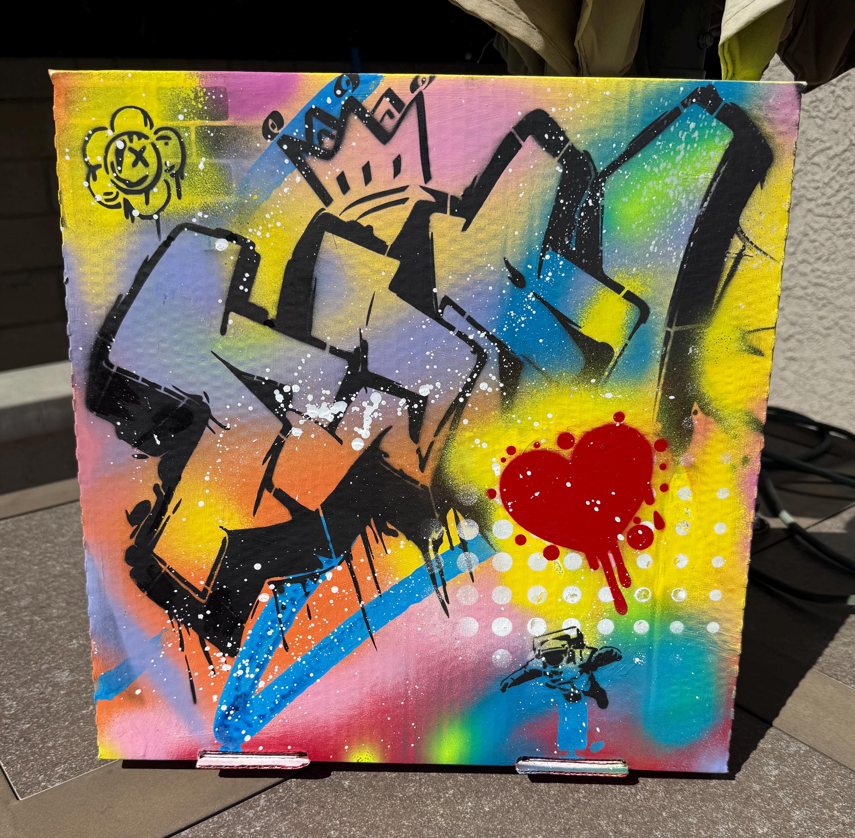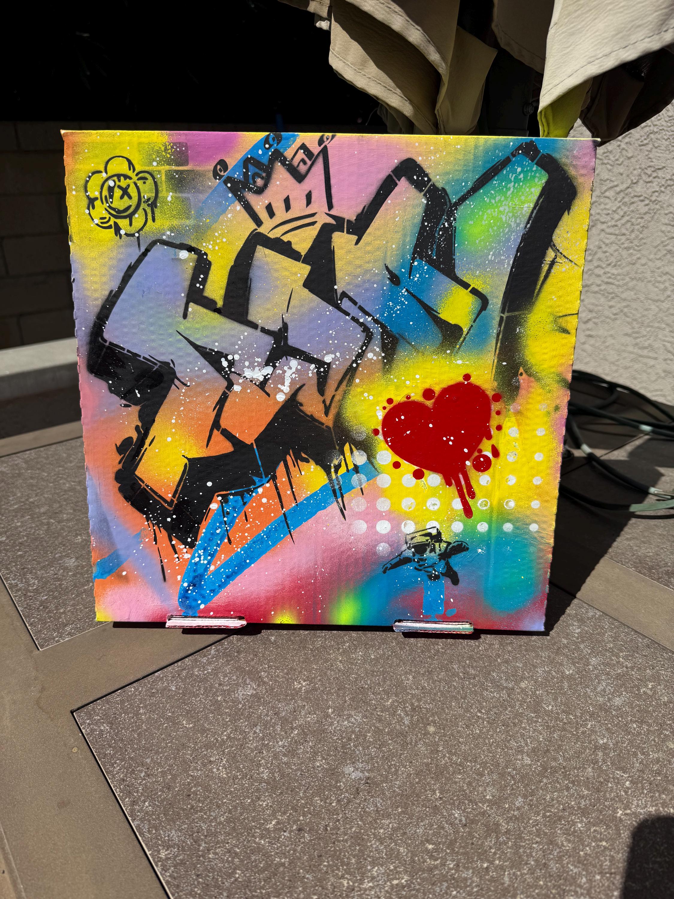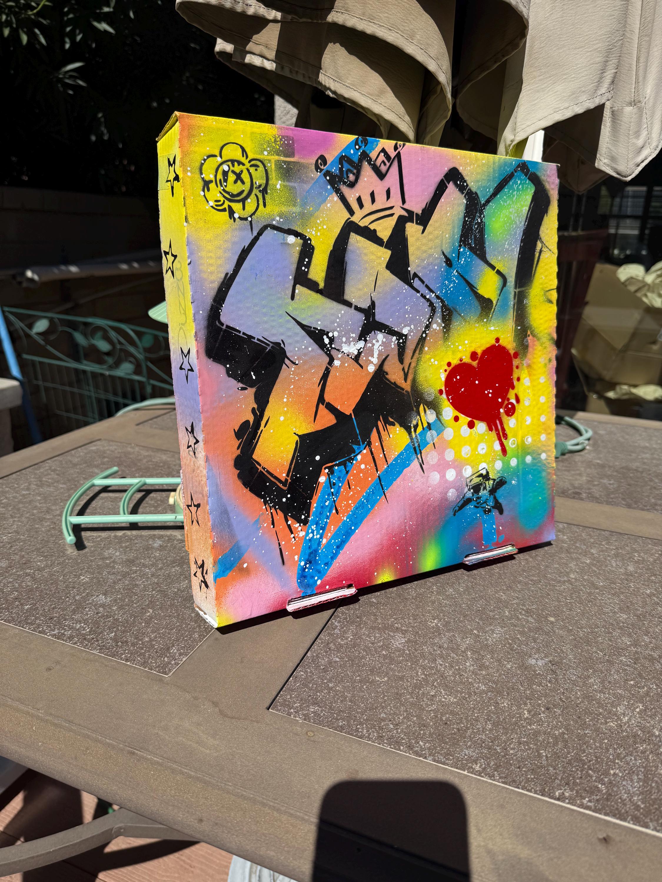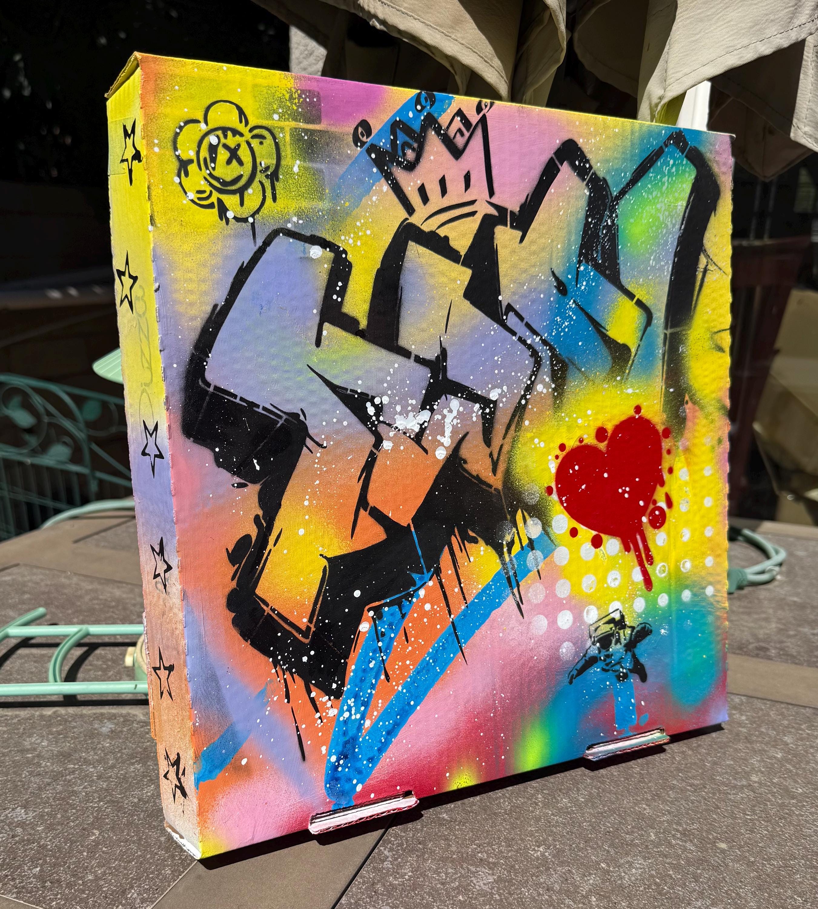King of Hearts is a 14.5” x 14.5” graffiti-style original painted on an upcycled pizza box, created by Larry. It features bold 3D-style lettering, a red dripping heart, and layered street motifs like a crown, cartoon flower, and tiny astronaut. Bright, energetic, and playful with a hit of edge.