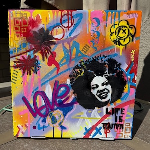 ✔ One-of-a-kind artwork ✔ Spray paint, stencils & acrylic ✔ Size: 14.5” x 14.5” ✔ Unique pizza box painting ✔ Unframed – ready to hang or display as-is