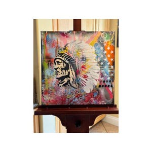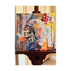 ✔ One-of-a-kind artwork ✔ Spray paint, stencils & acrylic ✔ Size: 18” x 18” ✔ Unique pizza box painting ✔ Unframed – ready to hang or display as-is