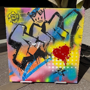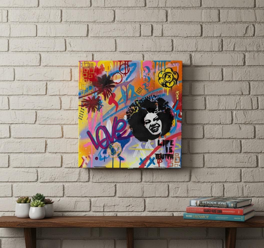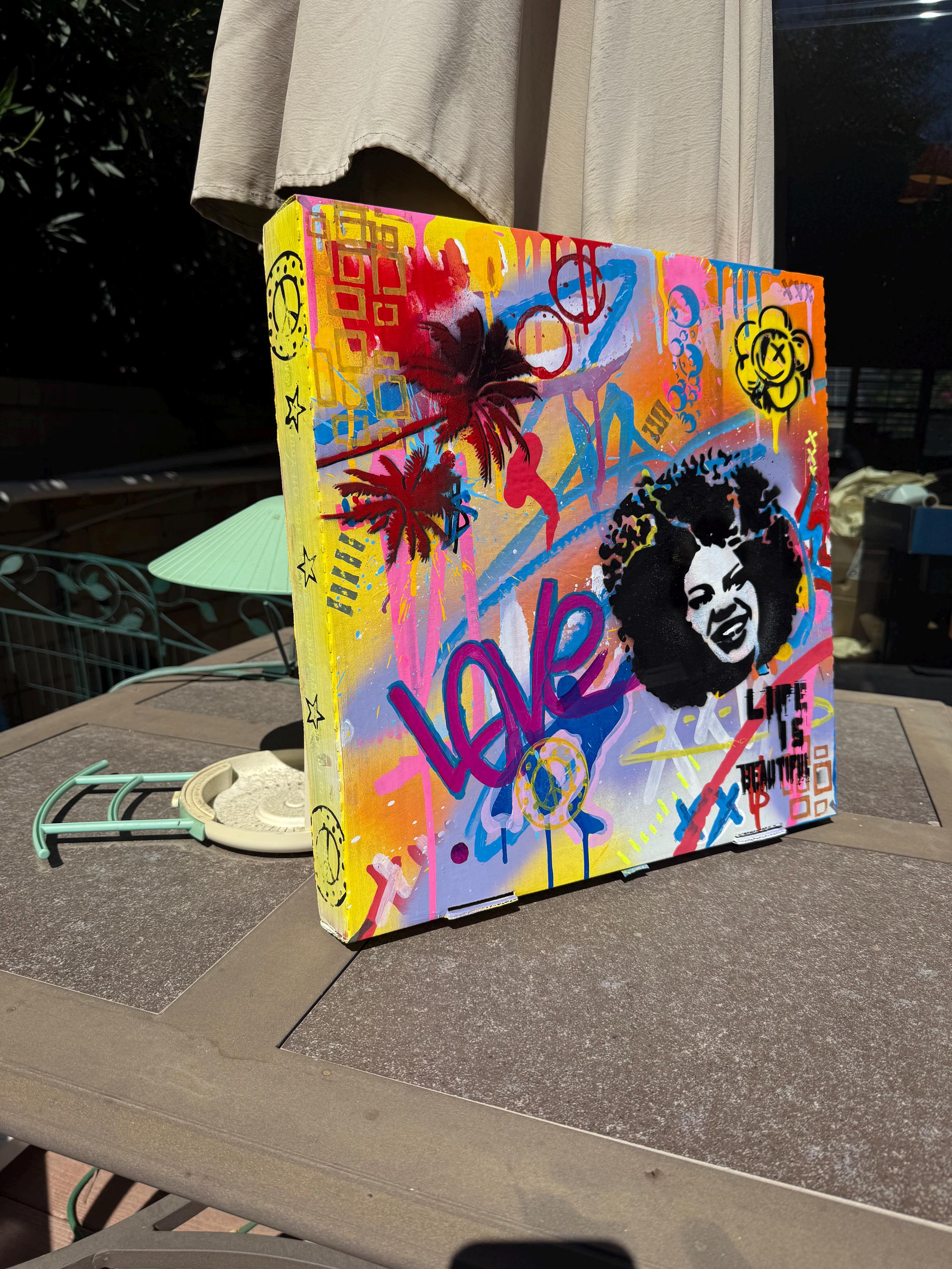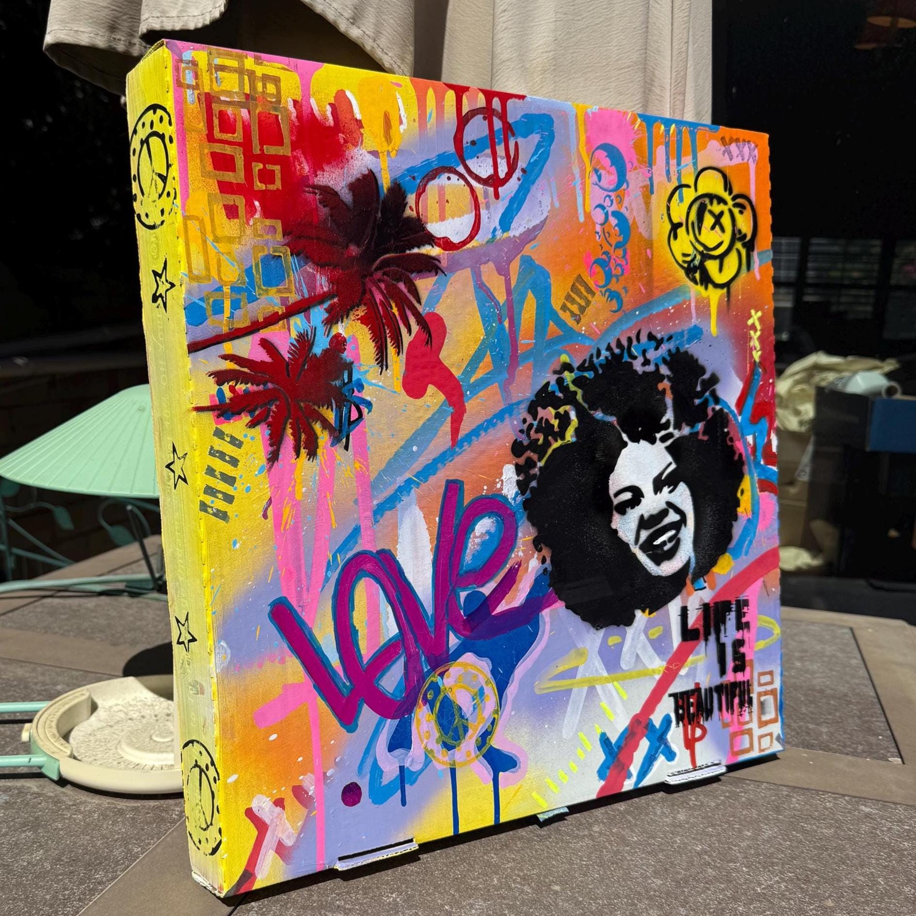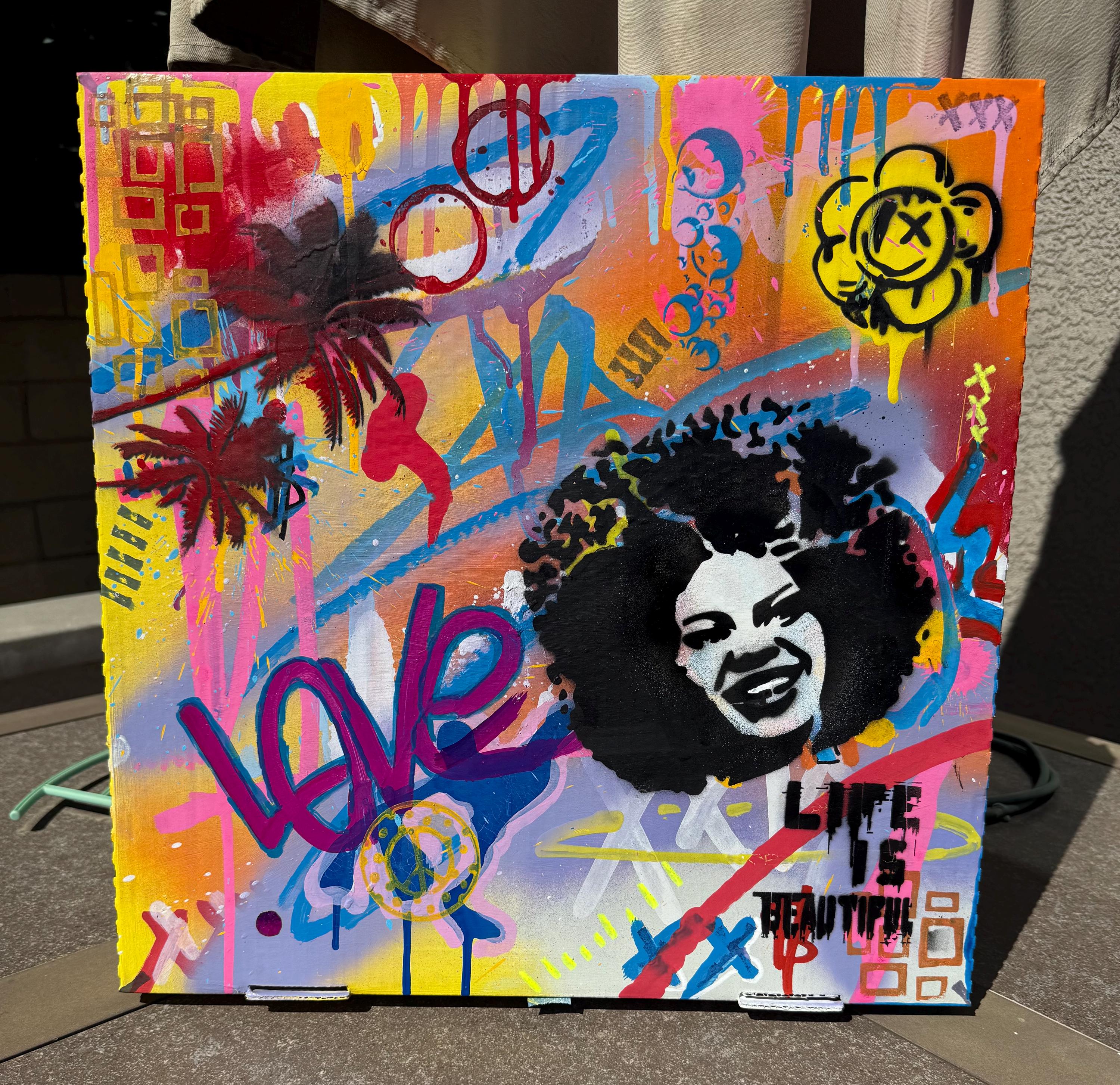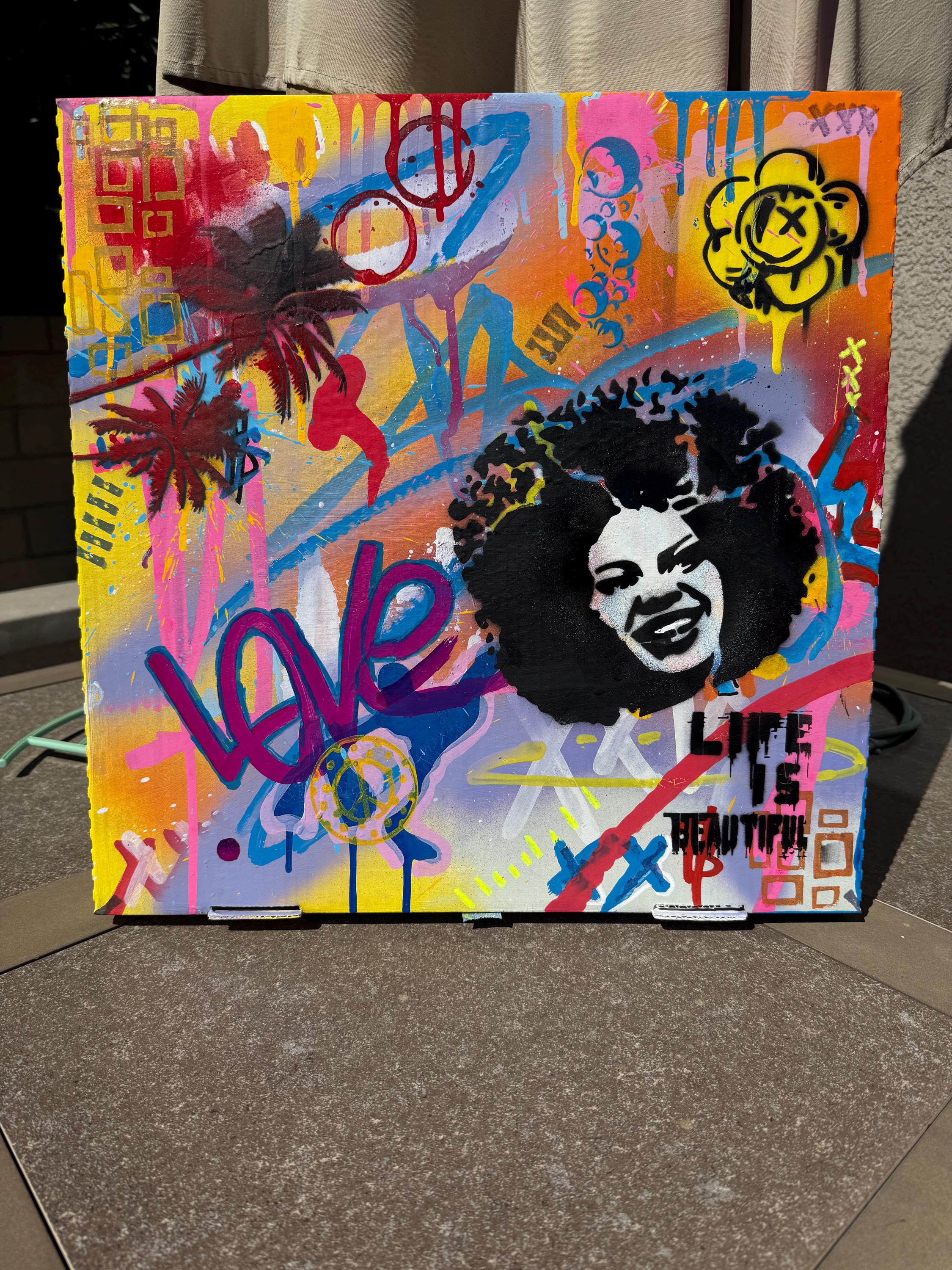 No Kings Day is an original street art piece by Larry, created on an upcycled 18" pizza box. This vibrant piece features a bold portrait, layered graffiti, palm trees, playful color drips, and the phrase “Life is Beautiful” in gritty stencil. “Love” tags the center — loud, messy, joyful, and unfiltered.