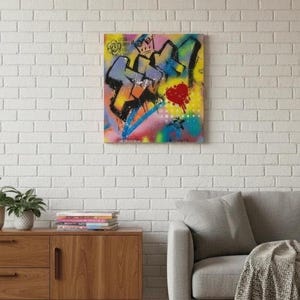 Great for fans of pizza, bold wall art, pop culture, and graffiti vibes. Indoor display only.