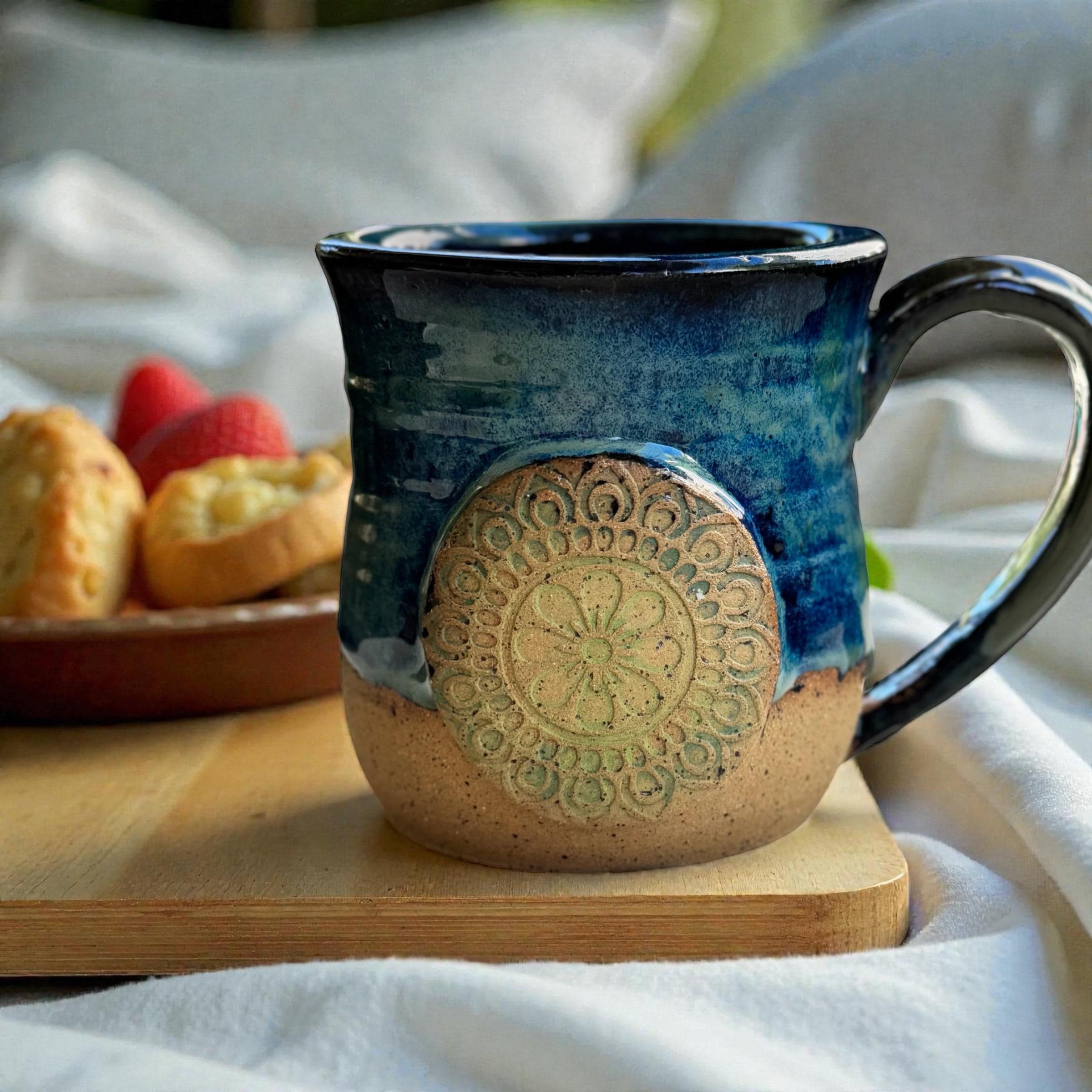 Features: * Wheel-thrown stoneware with a layered ocean-inspired glaze * Hand-carved mandala medallion adds depth and organic texture * Comfortable handle and slightly flared rim for an easy sip * Glossy interior; exterior features a mix of matte and gloss tones * Holds approximately 15 oz * About 4 inches tall (adjust if needed) * Food-safe, microwave-safe, and dishwasher-safe