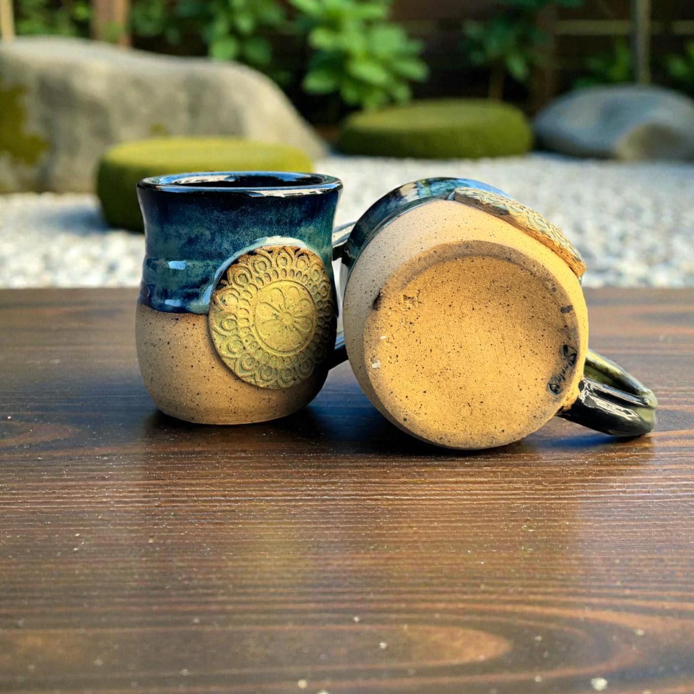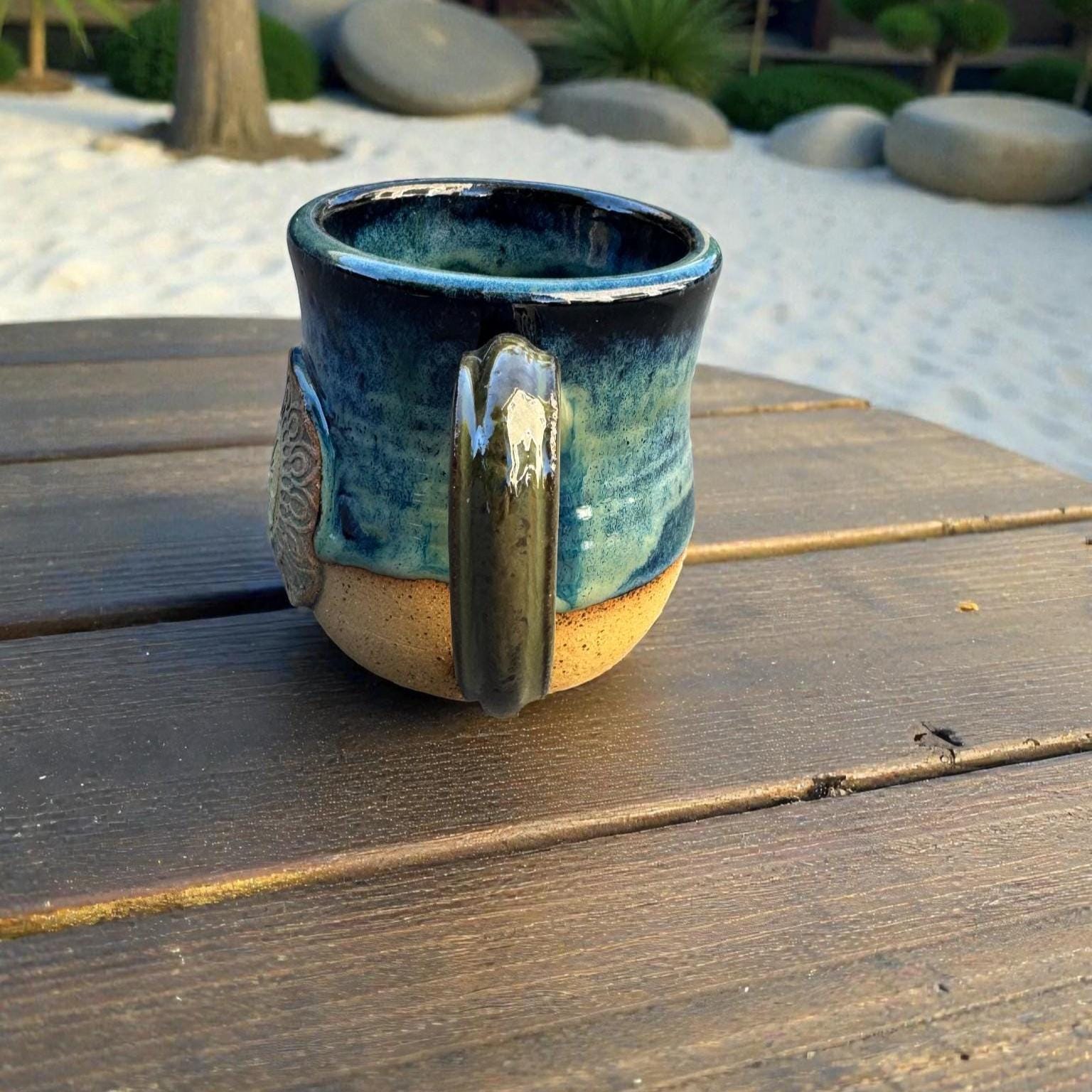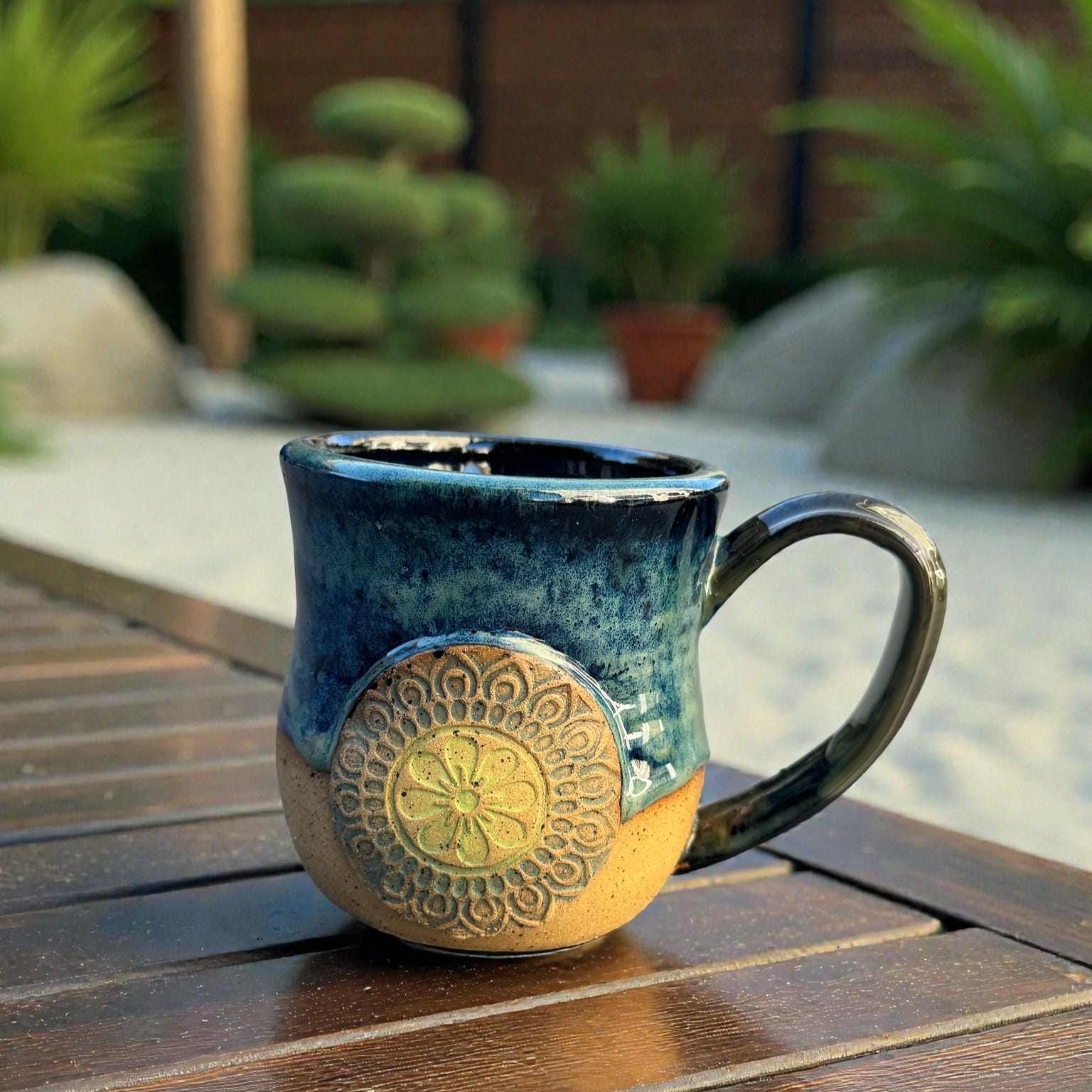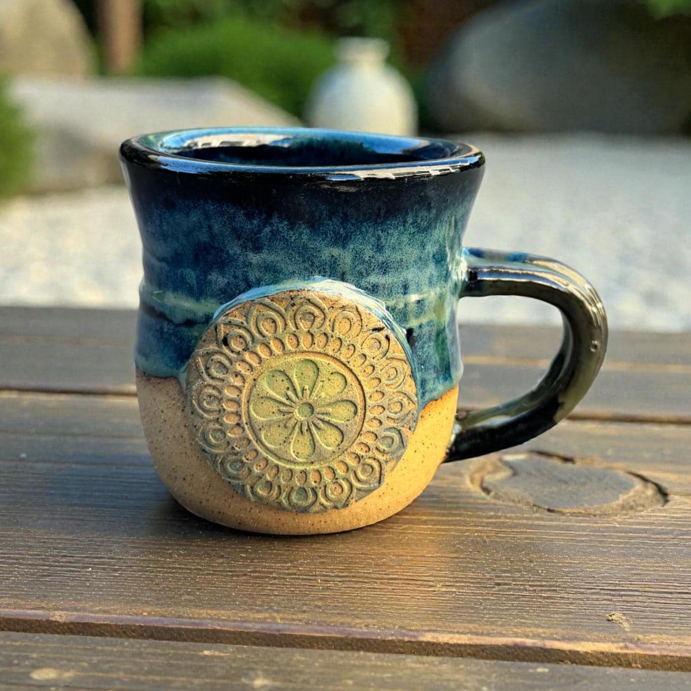 Handmade ocean glaze mug with a hand-applied mandala medallion on wheel-thrown stoneware. Finished with a blend of ocean blues and soft seafoam greens over speckled buff clay, this 15 oz pottery cup is ideal for coffee, tea, or any favorite warm drink. Fully glazed interior ensures a smooth feel, while the glossy finish highlights the artisanal surface variation — no two mugs are exactly alike.