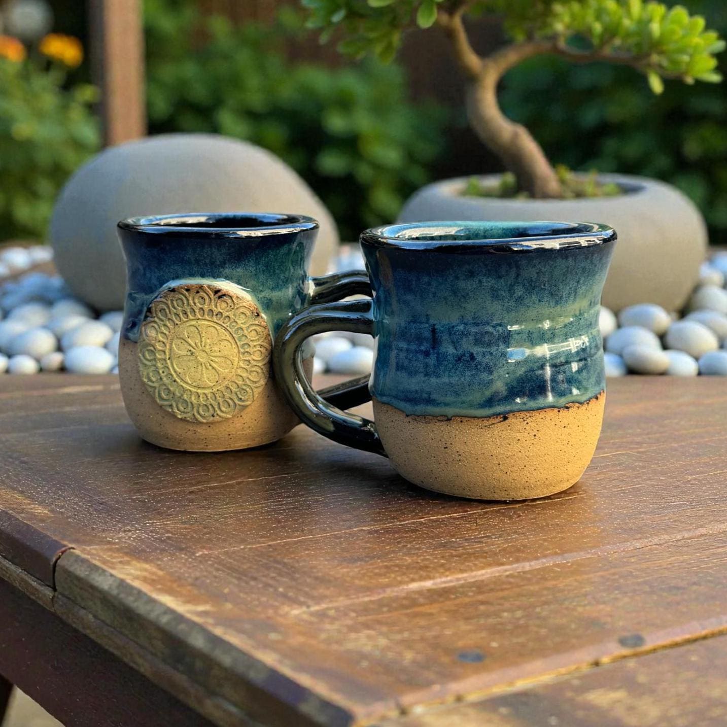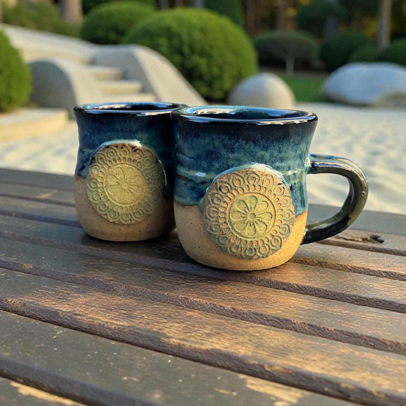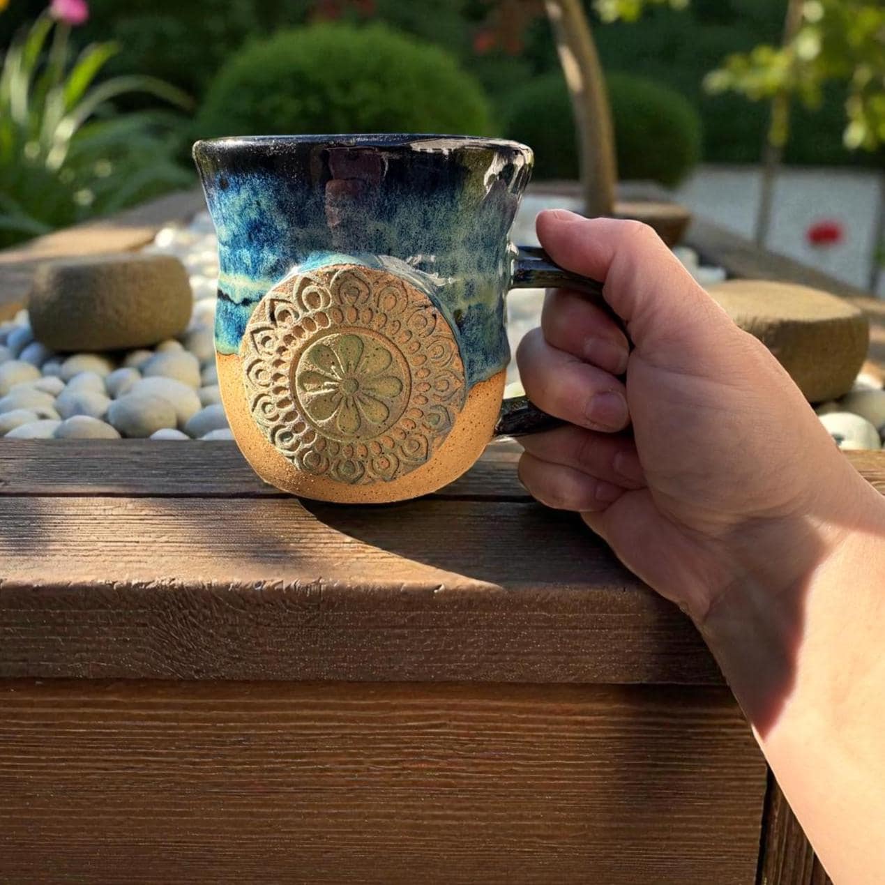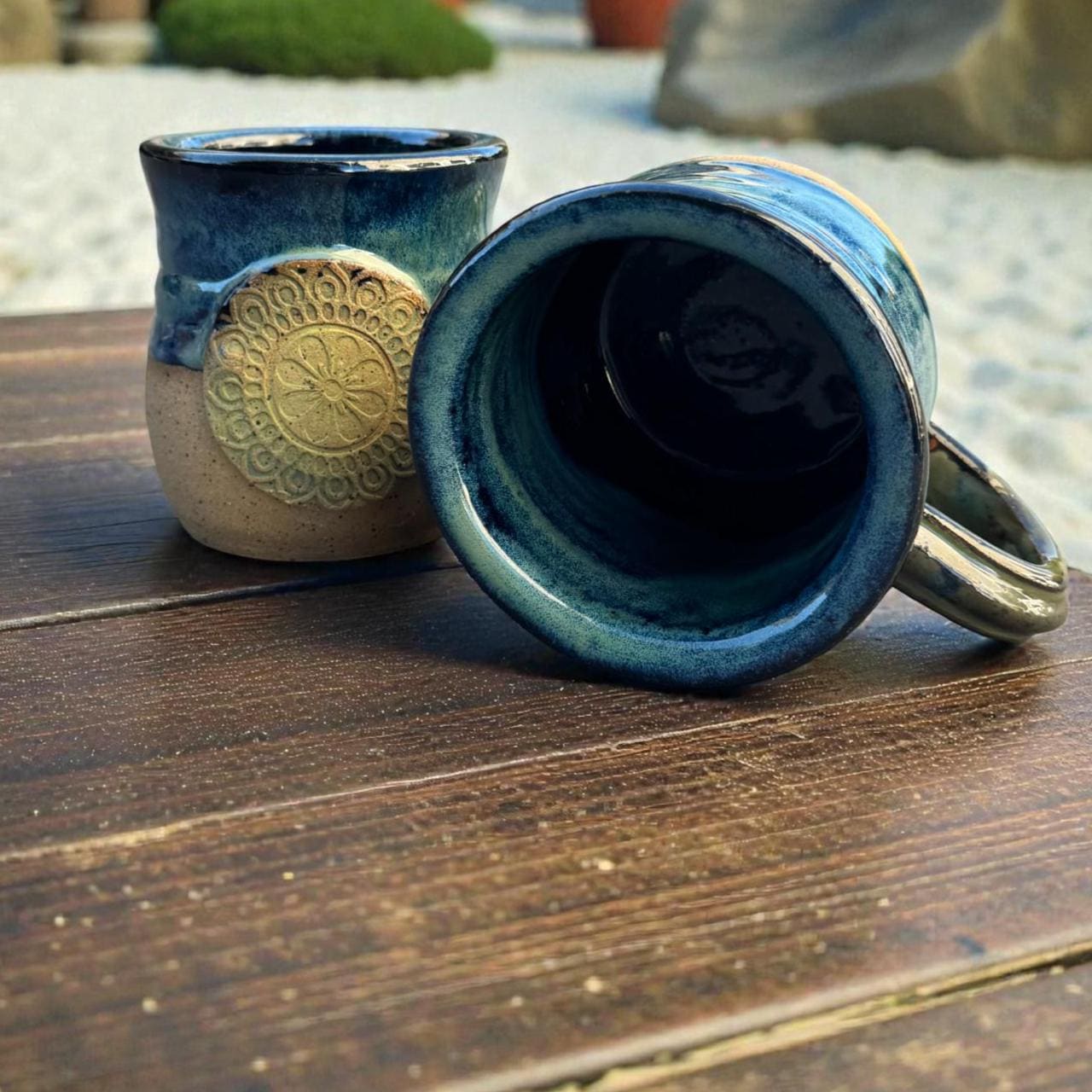 Handmade ocean glaze mug with a hand-applied mandala medallion on wheel-thrown stoneware. Finished with a blend of ocean blues and soft seafoam greens over speckled buff clay, this 15 oz pottery cup is ideal for coffee, tea, or any favorite warm drink. Fully glazed interior ensures a smooth feel, while the glossy finish highlights the artisanal surface variation — no two mugs are exactly alike.