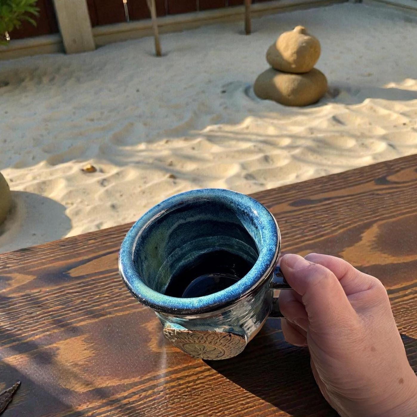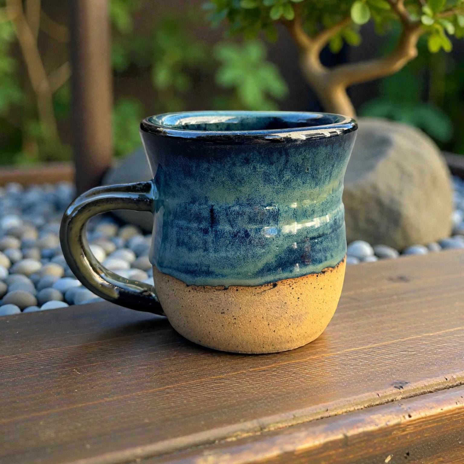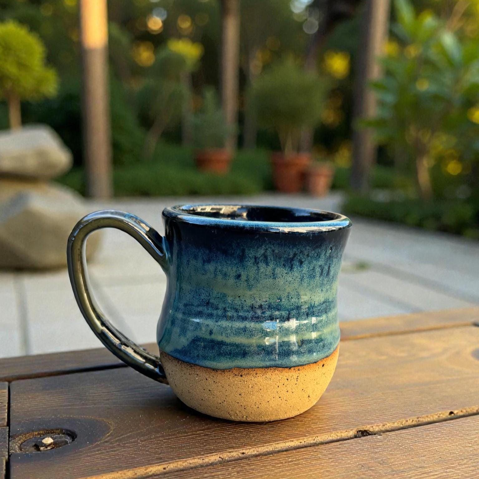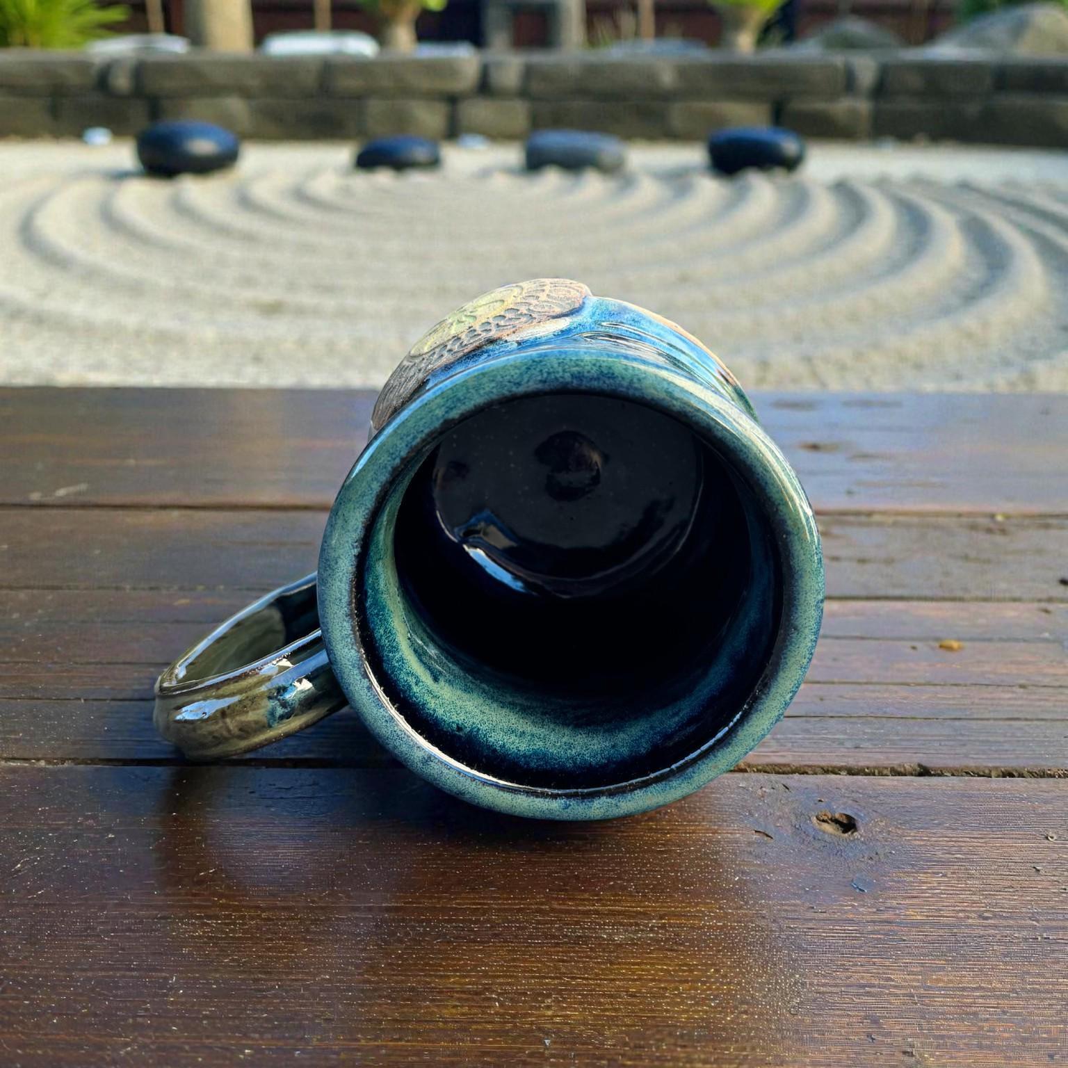 Handmade ocean glaze mug with a hand-applied mandala medallion on wheel-thrown stoneware. Finished with a blend of ocean blues and soft seafoam greens over speckled buff clay, this 15 oz pottery cup is ideal for coffee, tea, or any favorite warm drink. Fully glazed interior ensures a smooth feel, while the glossy finish highlights the artisanal surface variation — no two mugs are exactly alike.