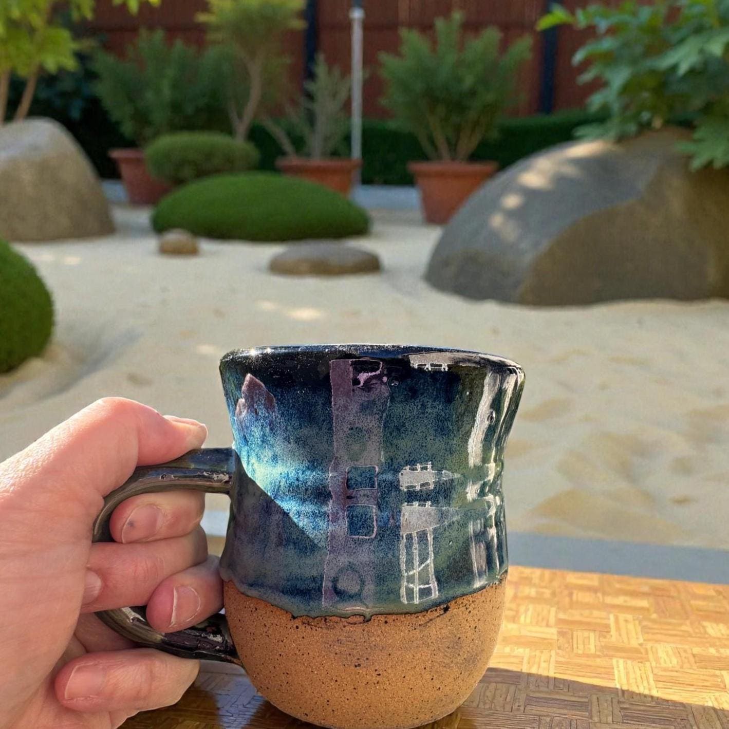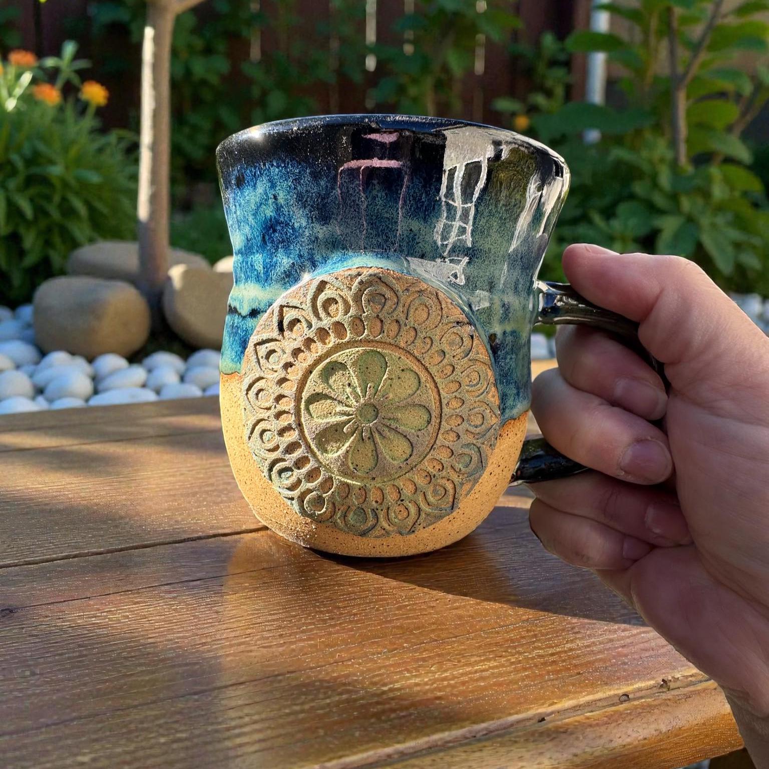 Dimensions & Features * Wheel-thrown stoneware pottery * Ocean blues and seafoam green glaze over speckled buff clay * Hand-applied mandala medallion detail on the front * Holds approximately 15 oz *Fully glazed interior * Microwave and dishwasher safe (hand washing recommended) * Each mug is unique and one of a kind