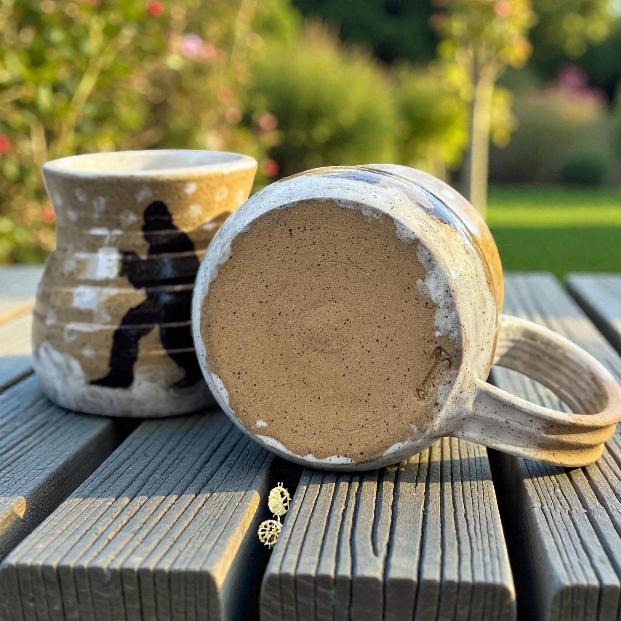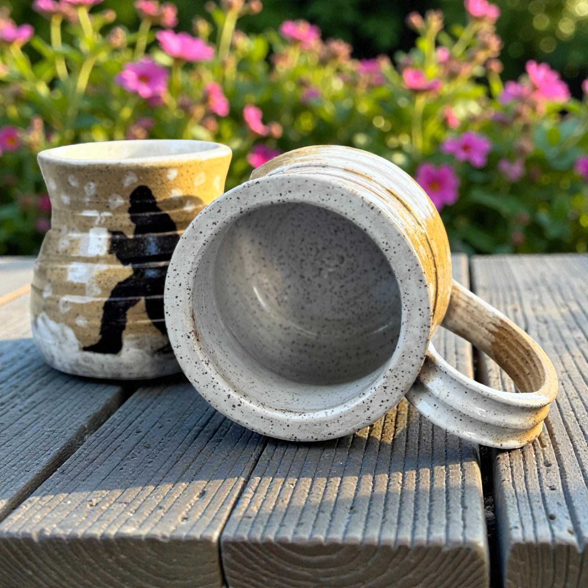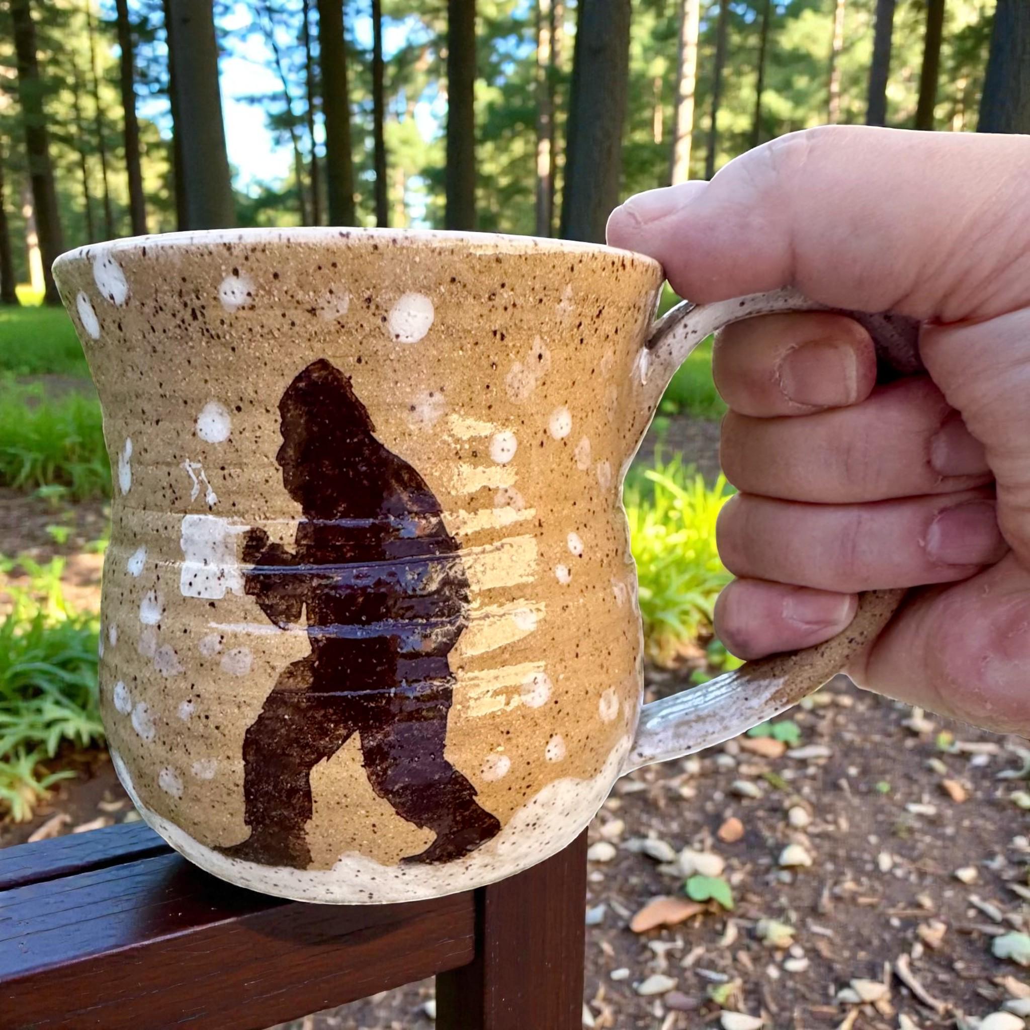 Handcrafted 16 oz Ceramic Mug – Rustic Glaze with Bigfoot Silhouette in Snow This playful and rustic mug features a deep speckled buff clay body with snowy white glaze spots and a dark brown silhouette of Bigfoot holding a mug of his own. The mug’s natural earthy tones evoke a wintry forest floor, while the hand-applied white glaze drips around the base and handle mimic freshly fallen snow. The mug is wheel-thrown, with visible throwing lines, a wide flared rim, and a partially raw, textured handle that enhances grip and character.