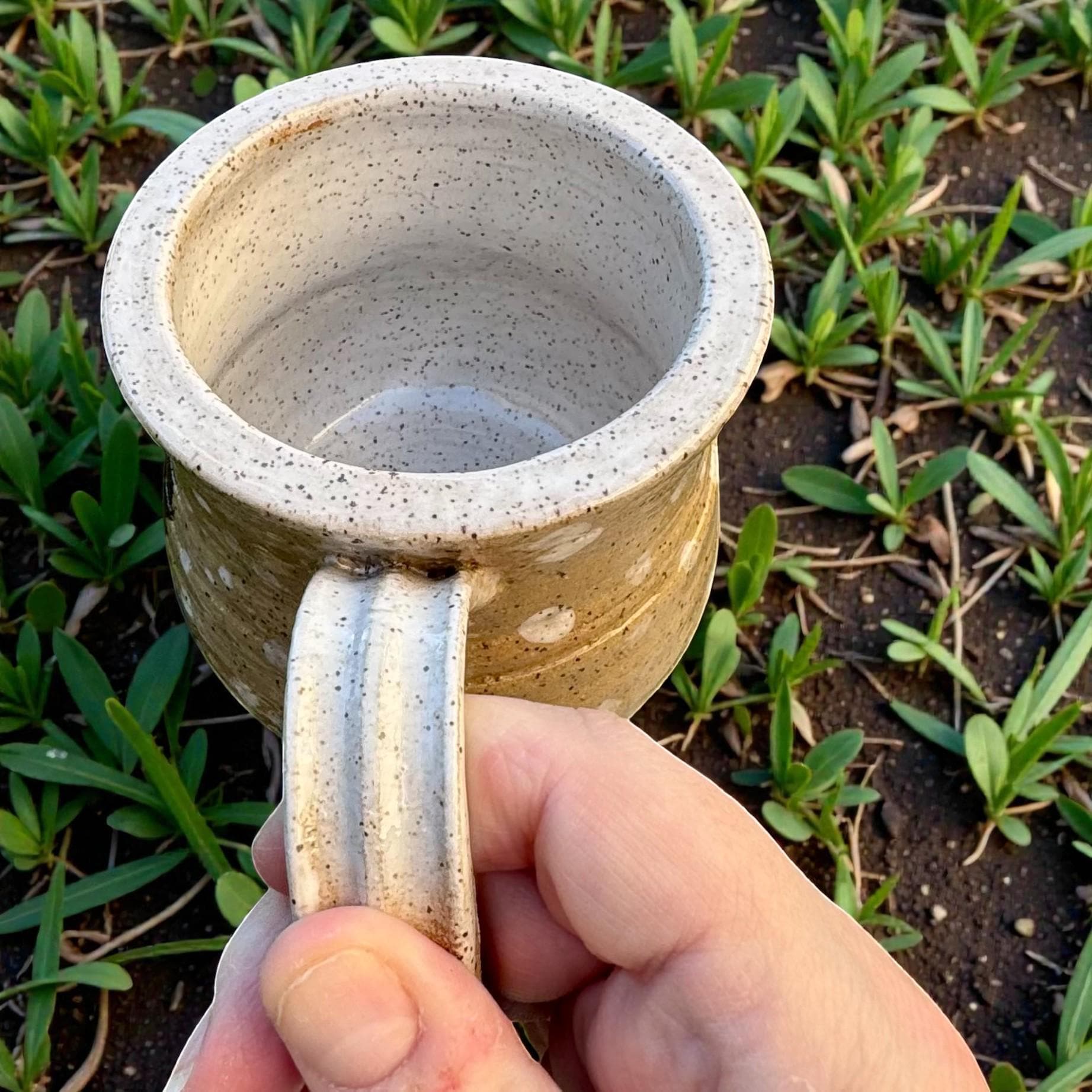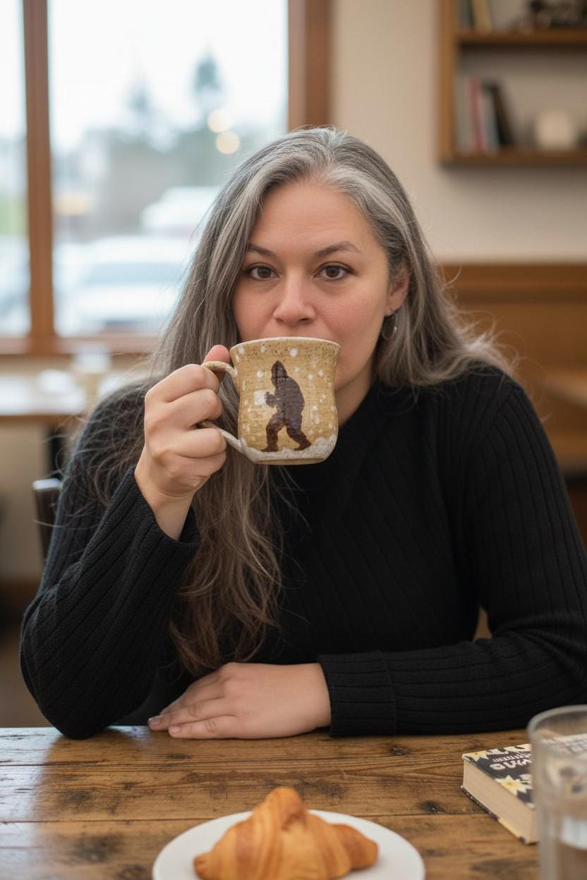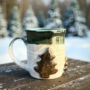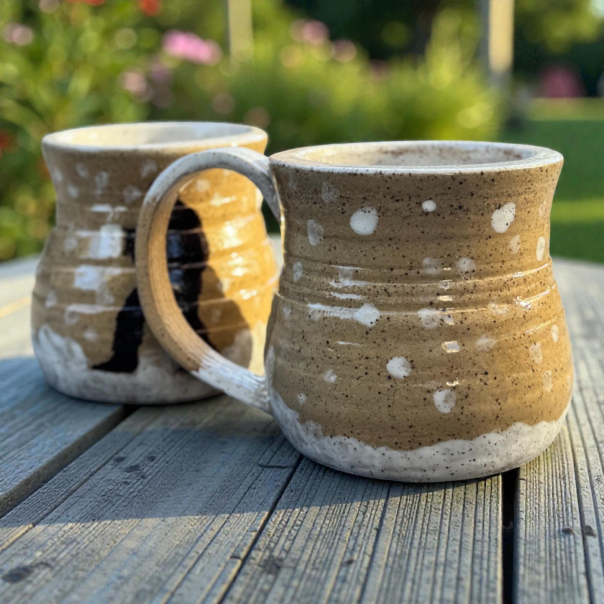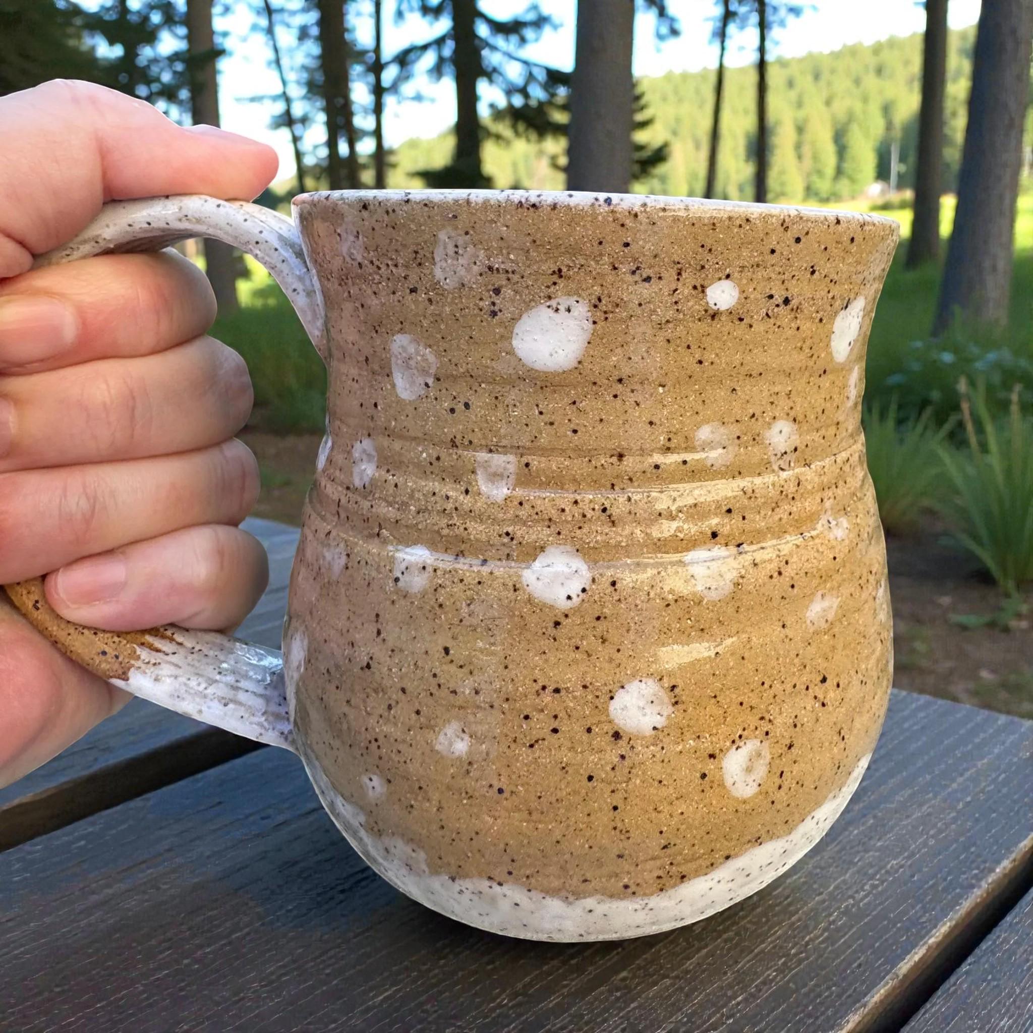 Handcrafted 16 oz Ceramic Mug – Rustic Glaze with Bigfoot Silhouette in Snow This playful and rustic mug features a deep speckled buff clay body with snowy white glaze spots and a dark brown silhouette of Bigfoot holding a mug of his own. The mug’s natural earthy tones evoke a wintry forest floor, while the hand-applied white glaze drips around the base and handle mimic freshly fallen snow. The mug is wheel-thrown, with visible throwing lines, a wide flared rim, and a partially raw, textured handle that enhances grip and character.