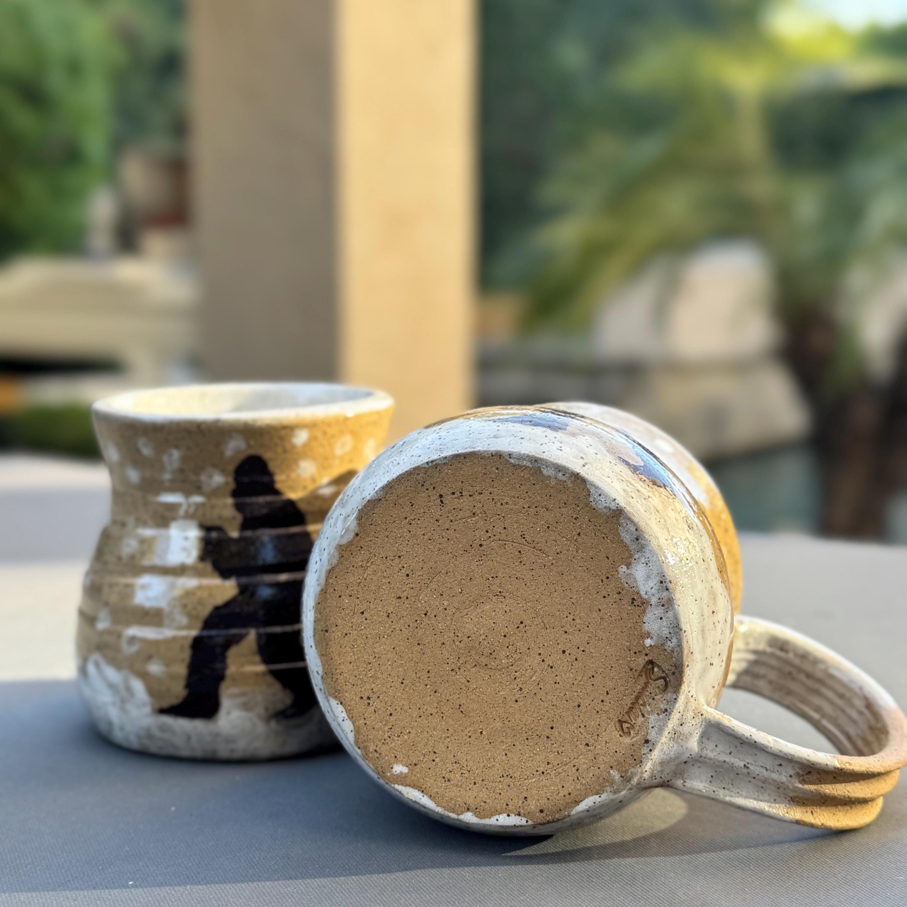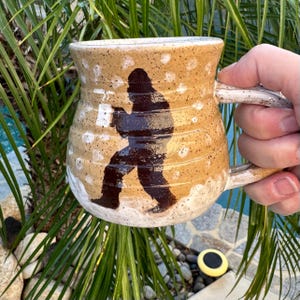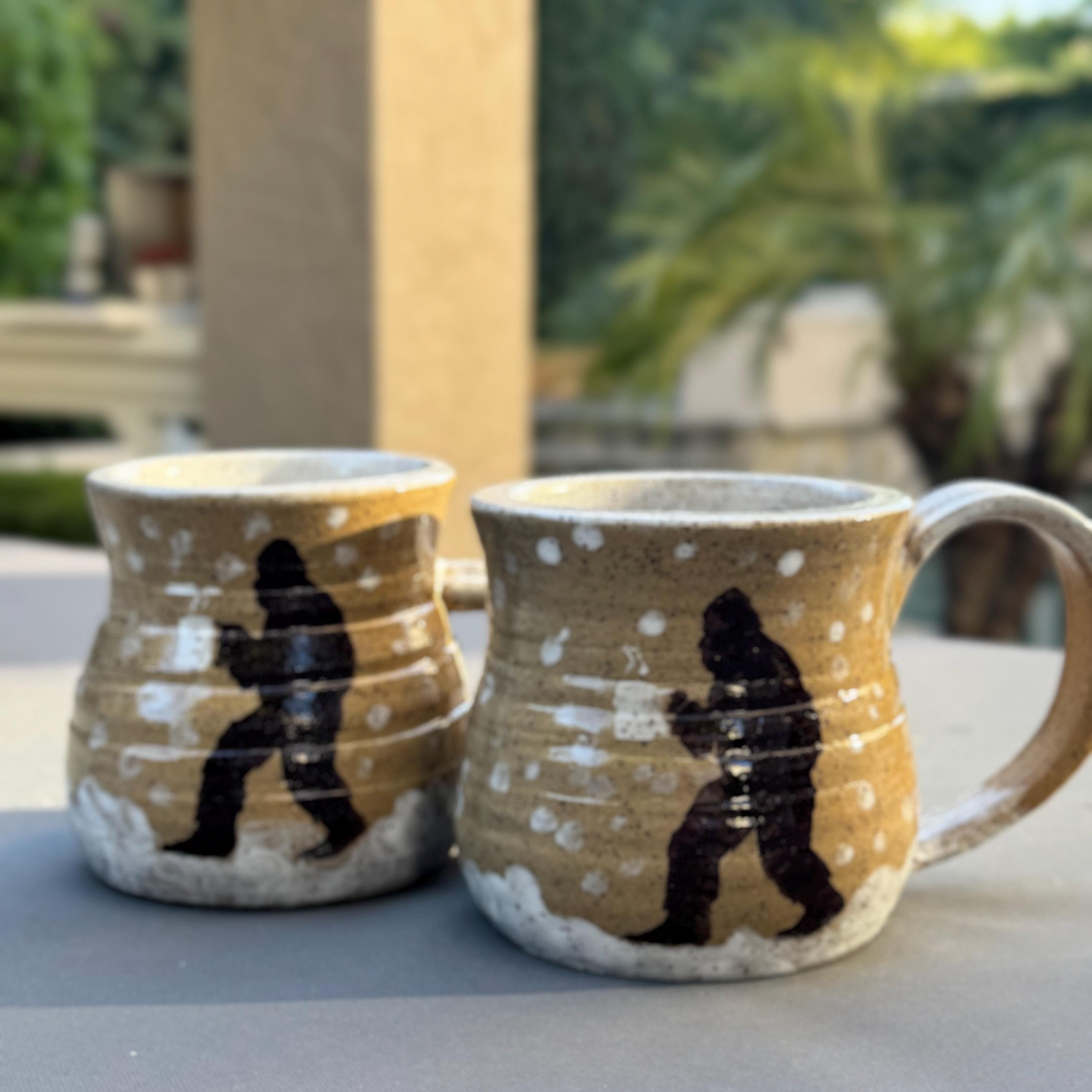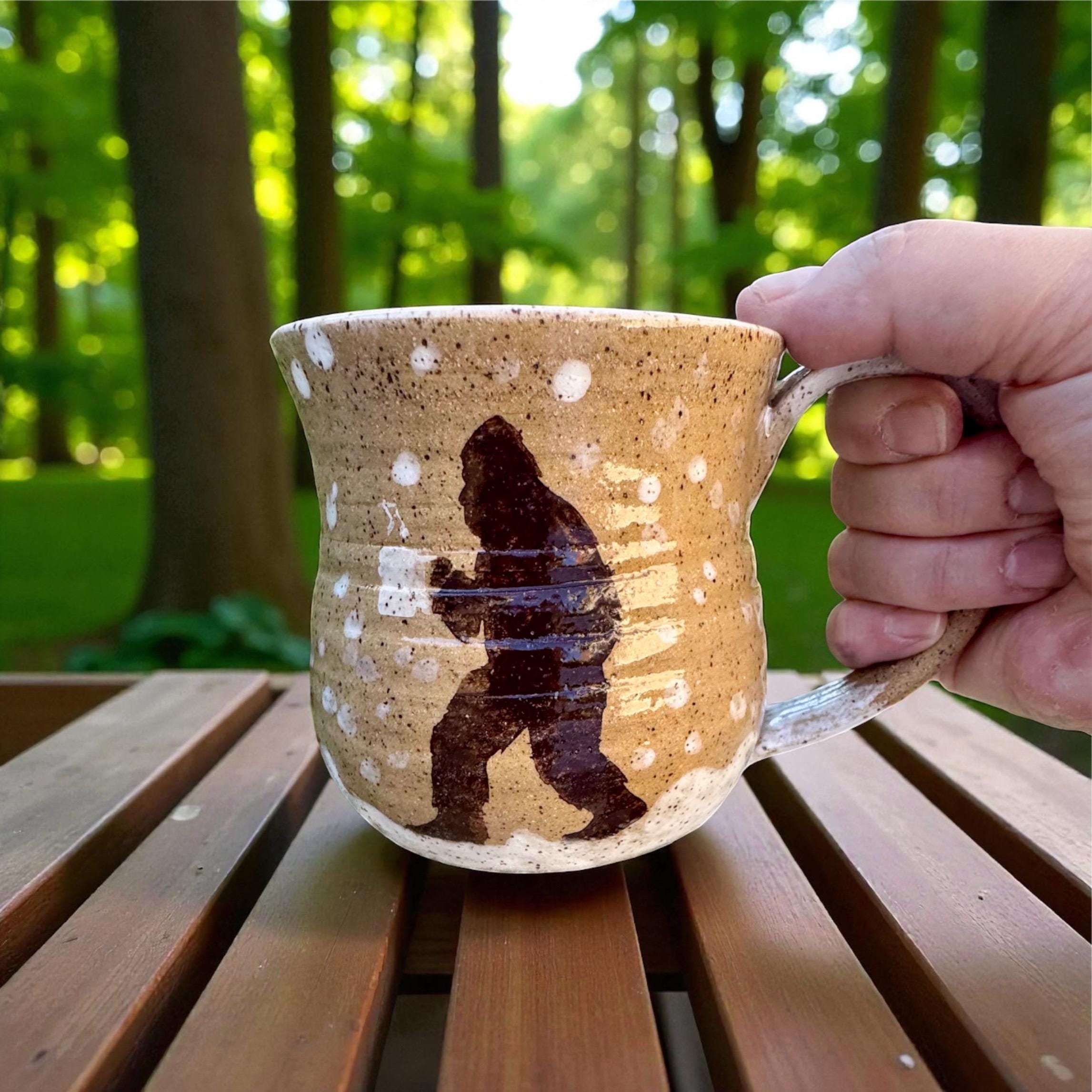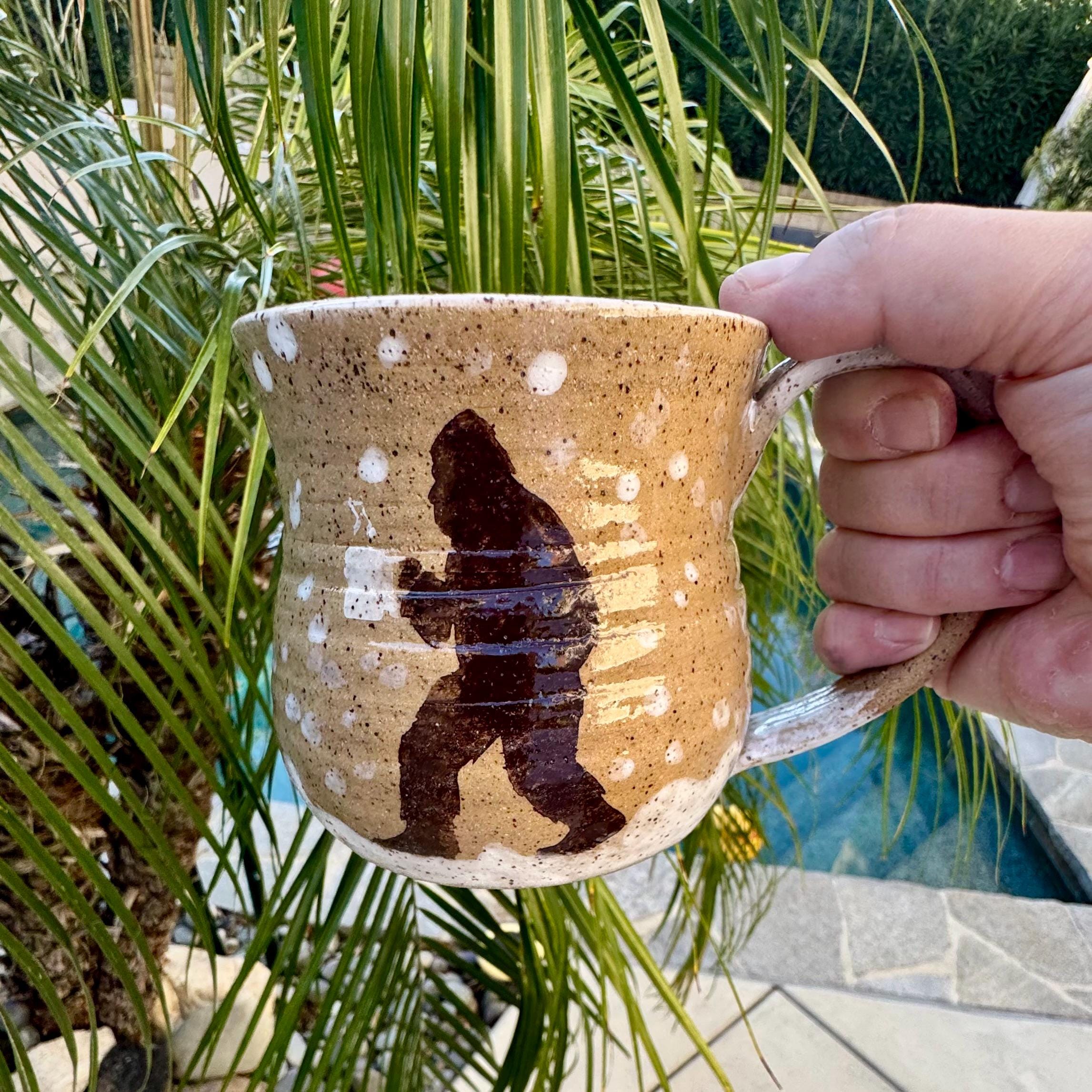 Handcrafted 16 oz Ceramic Mug – Rustic Glaze with Bigfoot Silhouette in Snow This playful and rustic mug features a deep speckled buff clay body with snowy white glaze spots and a dark brown silhouette of Bigfoot holding a mug of his own. The mug’s natural earthy tones evoke a wintry forest floor, while the hand-applied white glaze drips around the base and handle mimic freshly fallen snow. The mug is wheel-thrown, with visible throwing lines, a wide flared rim, and a partially raw, textured handle that enhances grip and character.