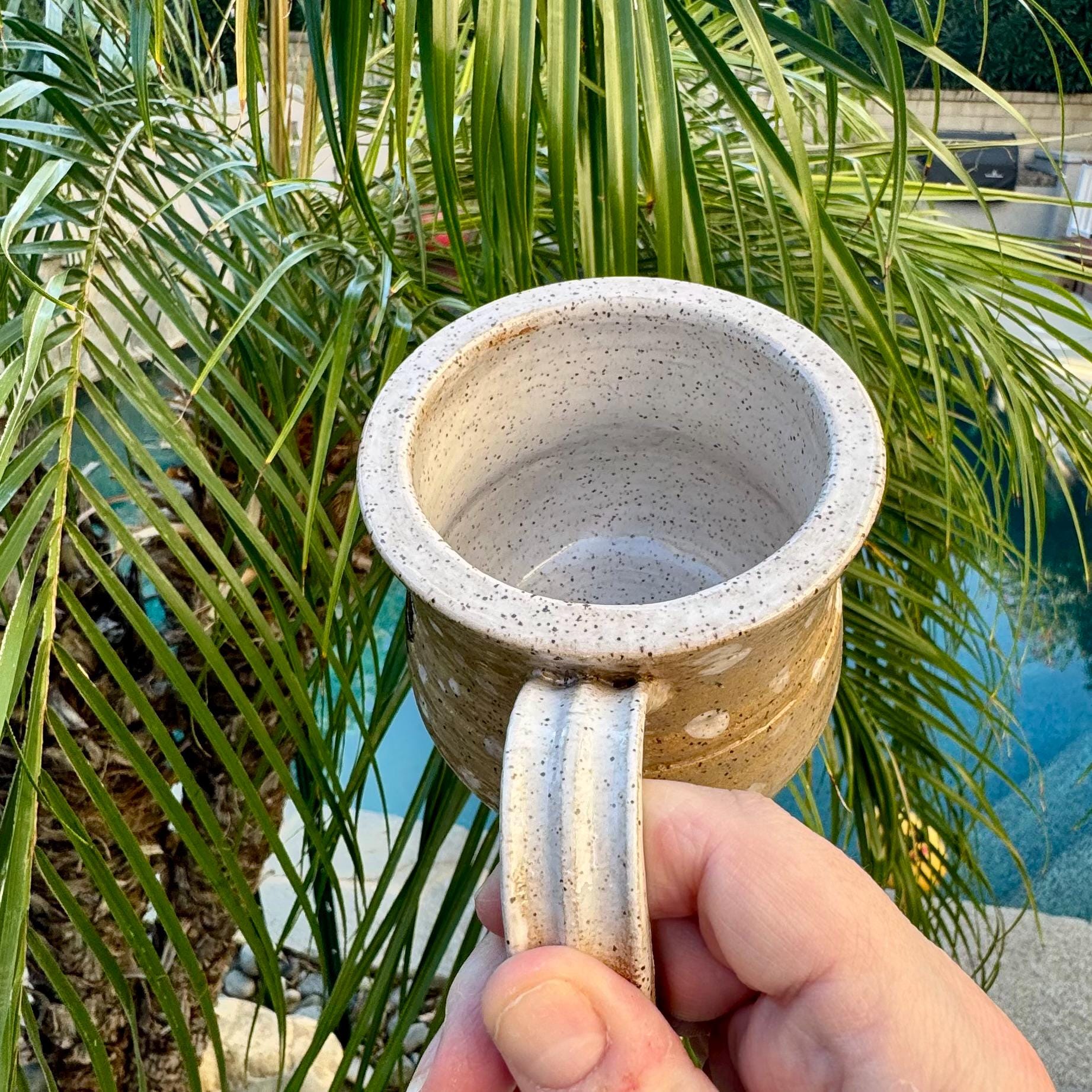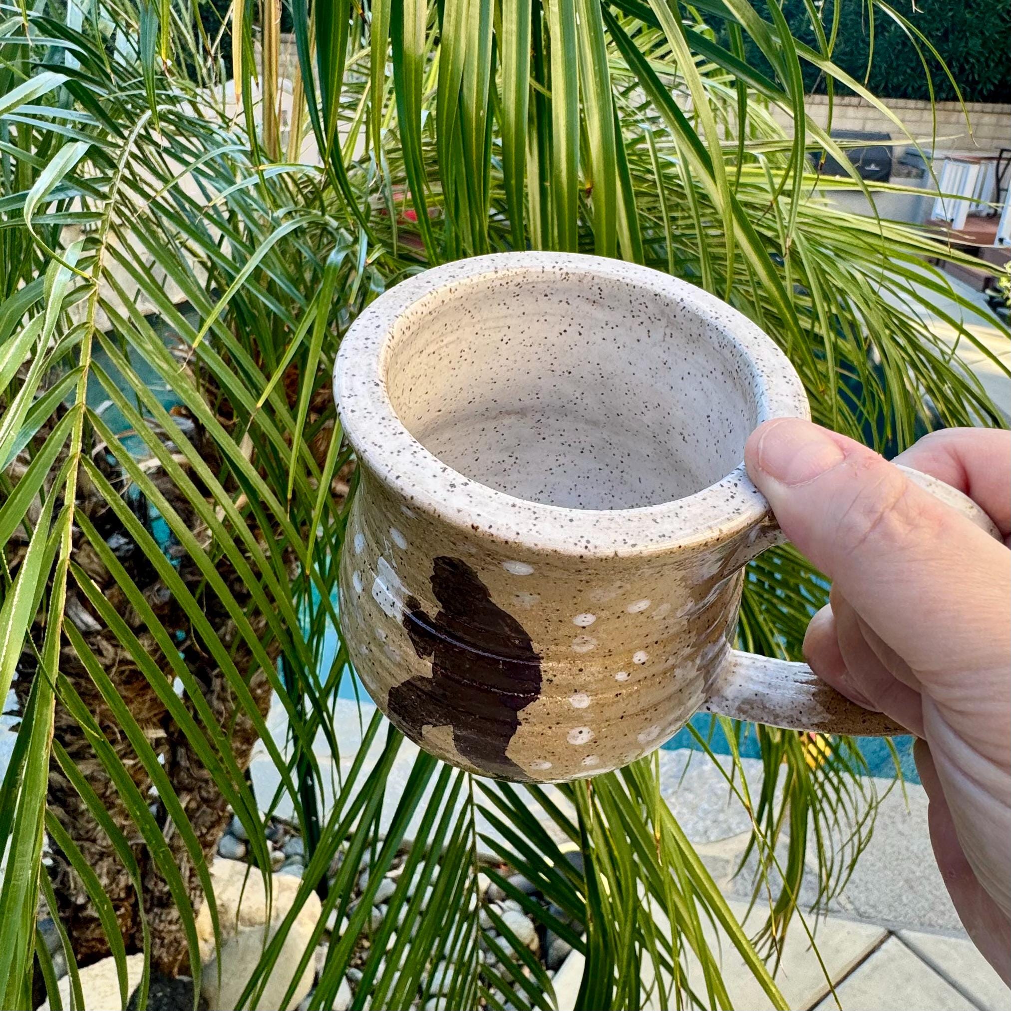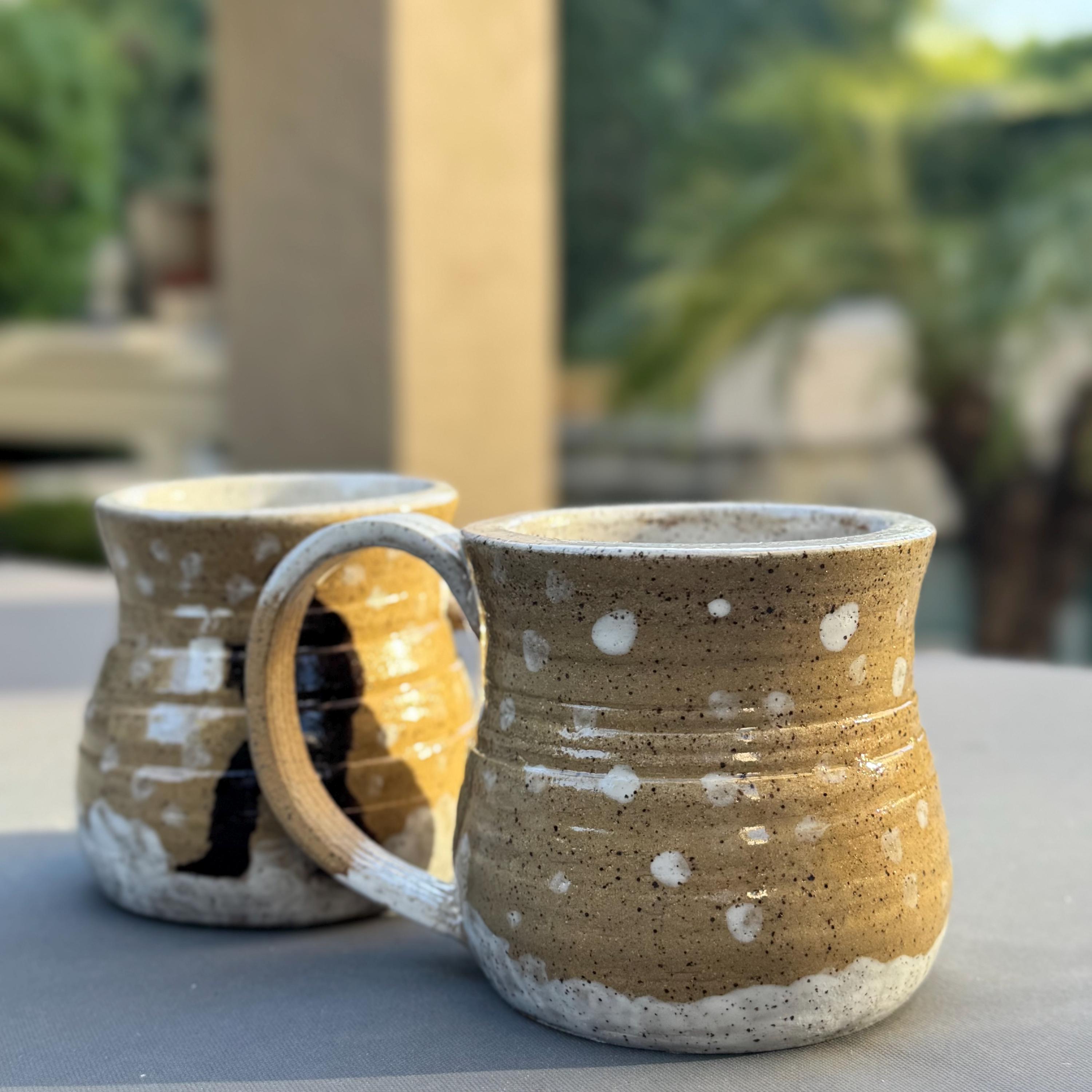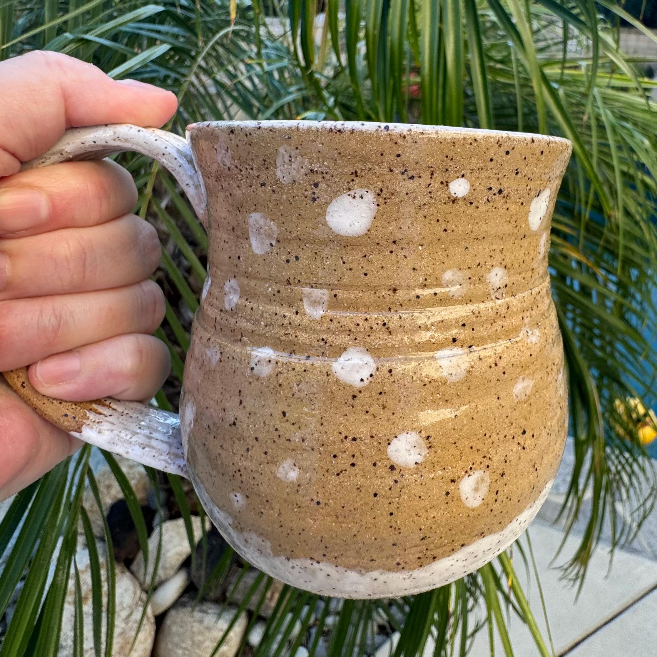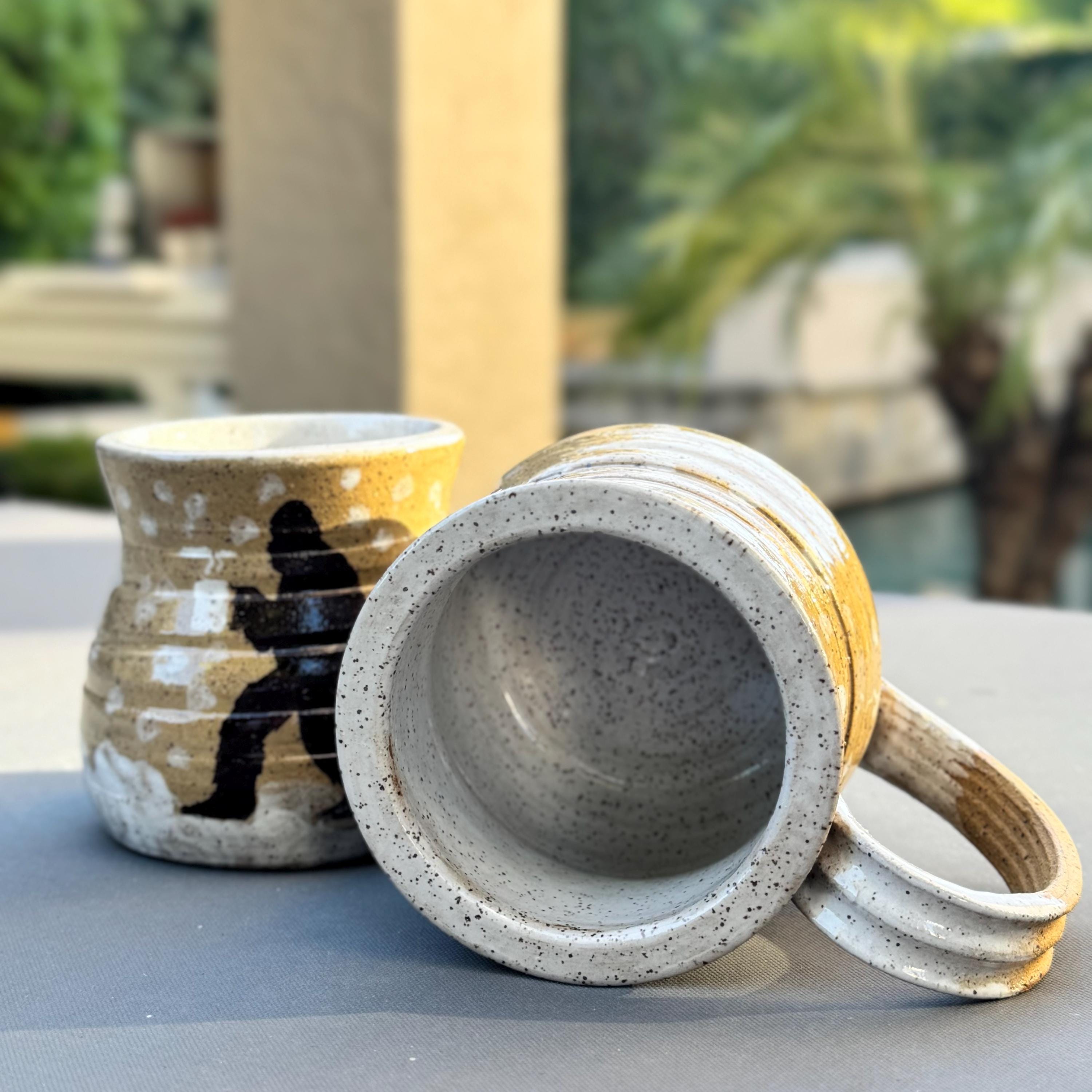 Handcrafted 16 oz Ceramic Mug – Rustic Glaze with Bigfoot Silhouette in Snow This playful and rustic mug features a deep speckled buff clay body with snowy white glaze spots and a dark brown silhouette of Bigfoot holding a mug of his own. The mug’s natural earthy tones evoke a wintry forest floor, while the hand-applied white glaze drips around the base and handle mimic freshly fallen snow. The mug is wheel-thrown, with visible throwing lines, a wide flared rim, and a partially raw, textured handle that enhances grip and character.
