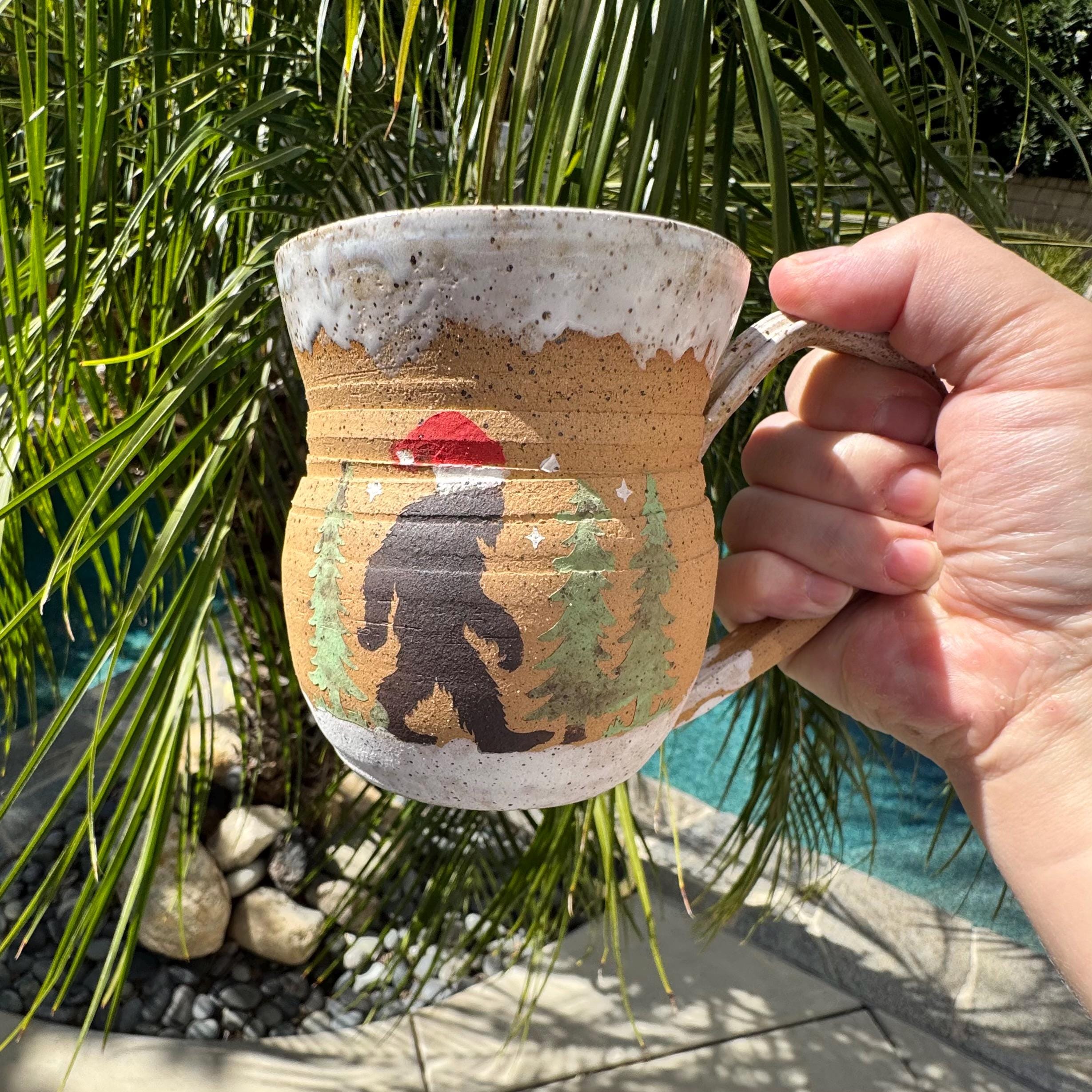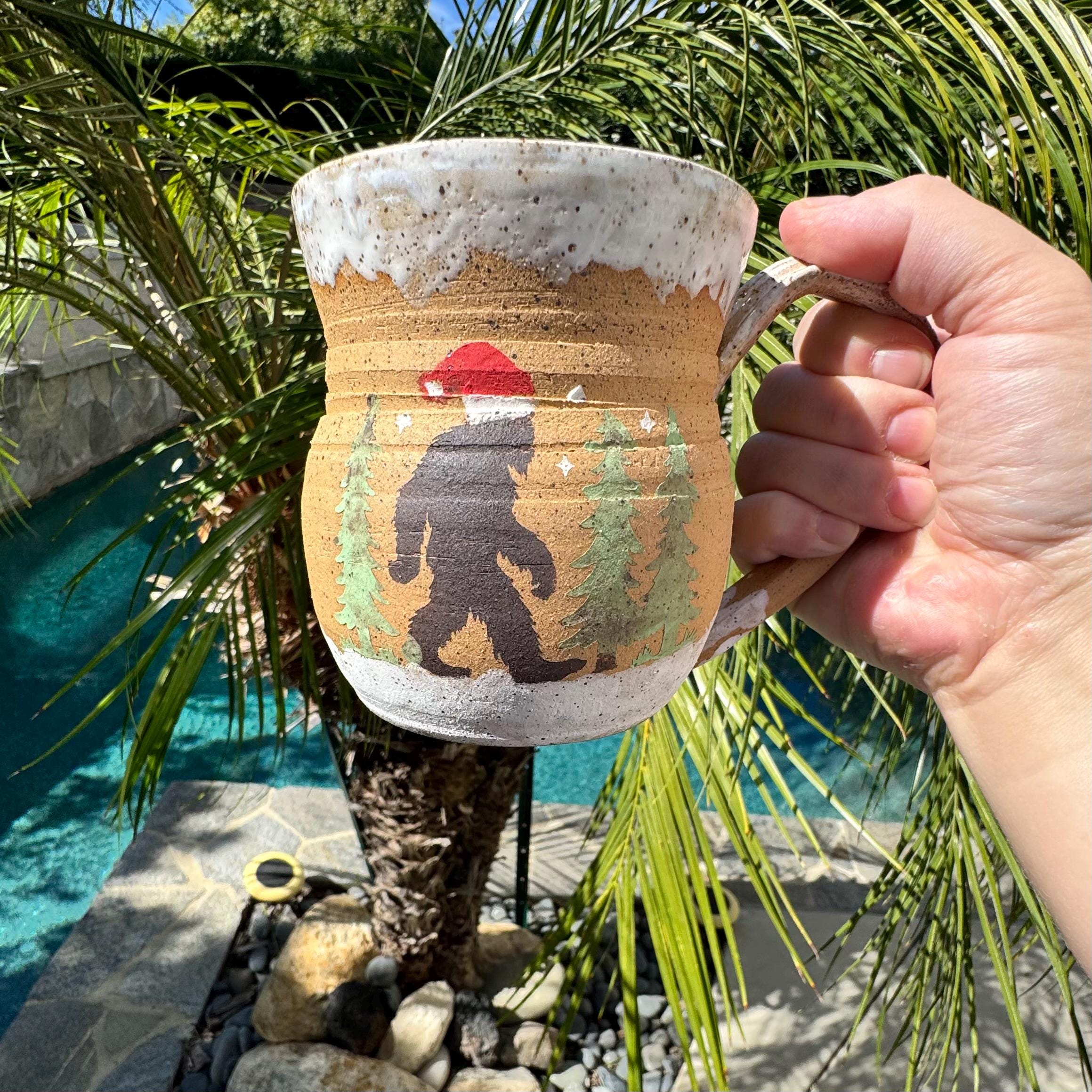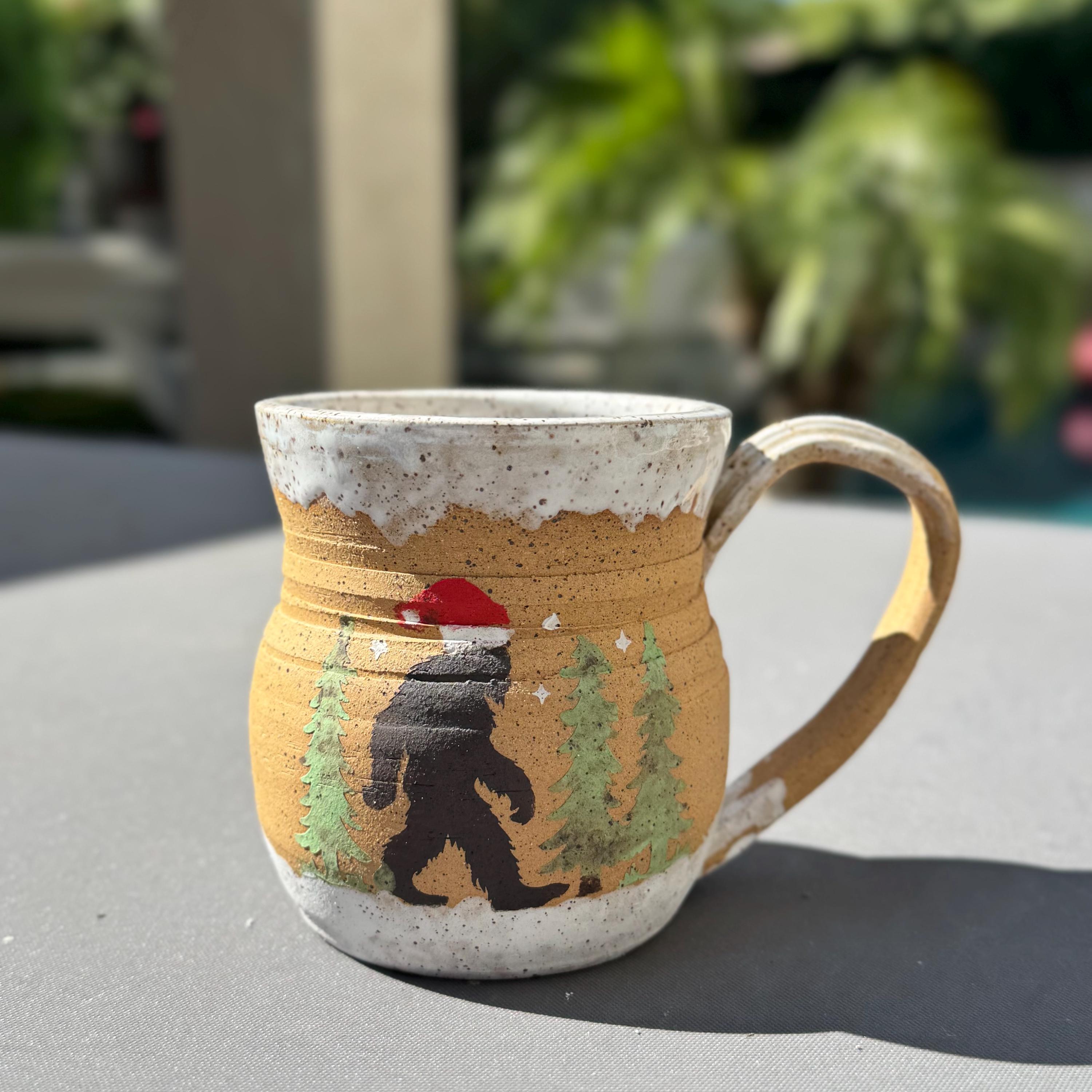 Handcrafted 16 oz Ceramic Mug – Matte Forest Bigfoot with Santa Hat Design This cozy, holiday-inspired mug features a hand-painted silhouette of Bigfoot donning a Santa hat, strolling through a pine forest. Made from speckled buff stoneware, the natural tan clay is left raw on the exterior to preserve its tactile, earthy quality, while the forest scene is painted in a matte finish. The rim and base are dipped in a flowing white glaze, and the interior is fully glazed in a glossy white celadon that highlights the speckled texture beneath. The gently curved form and comfortable handle make it a joy to hold.