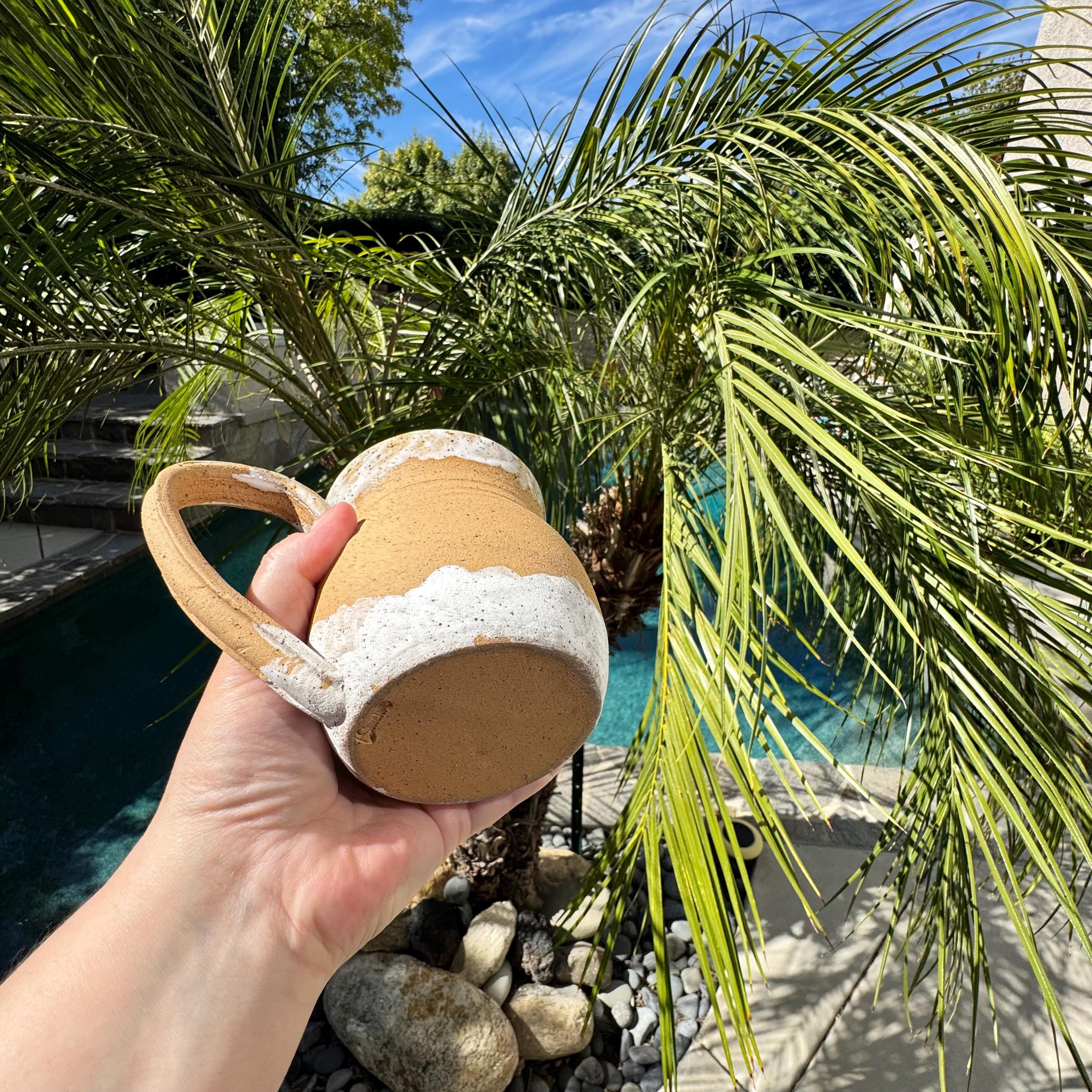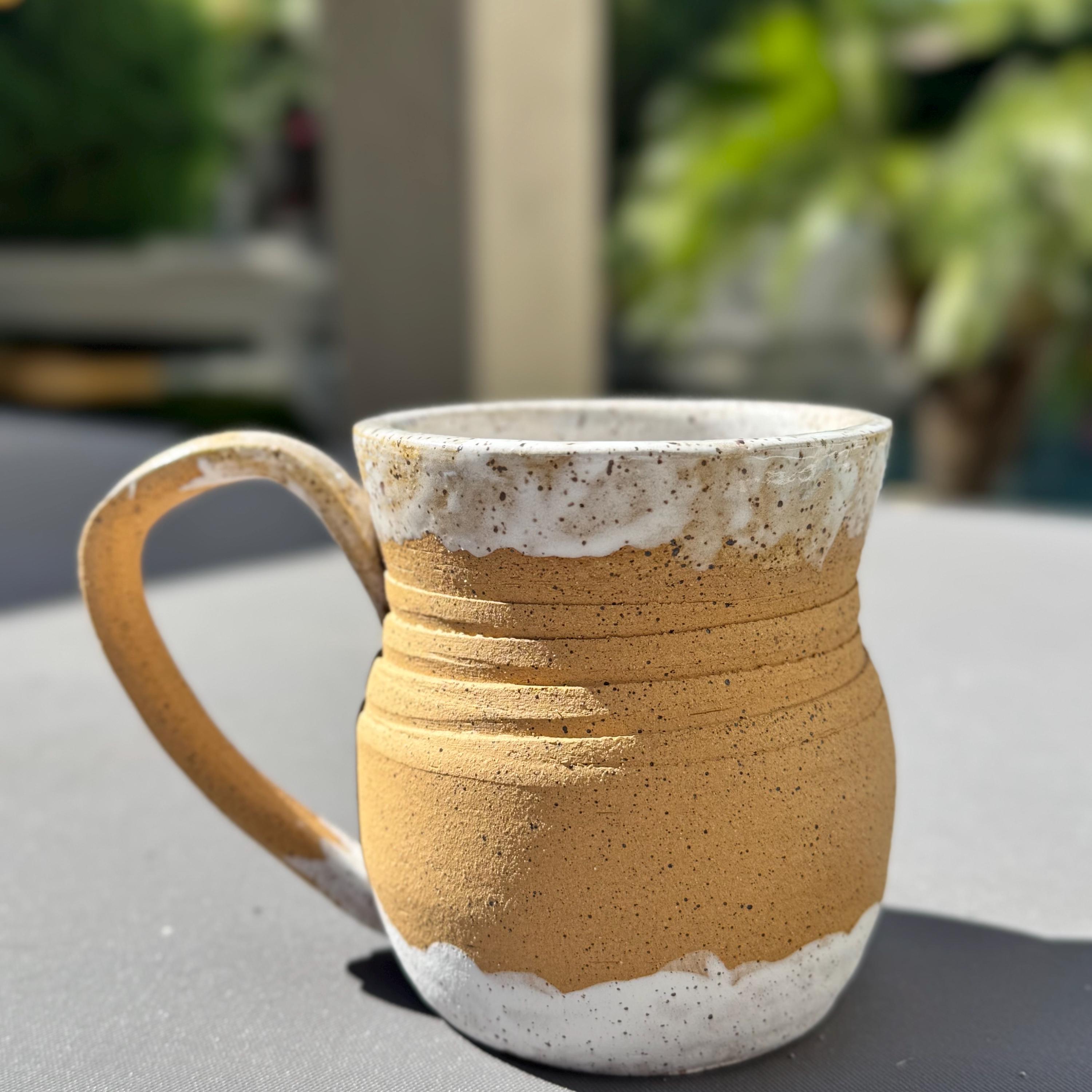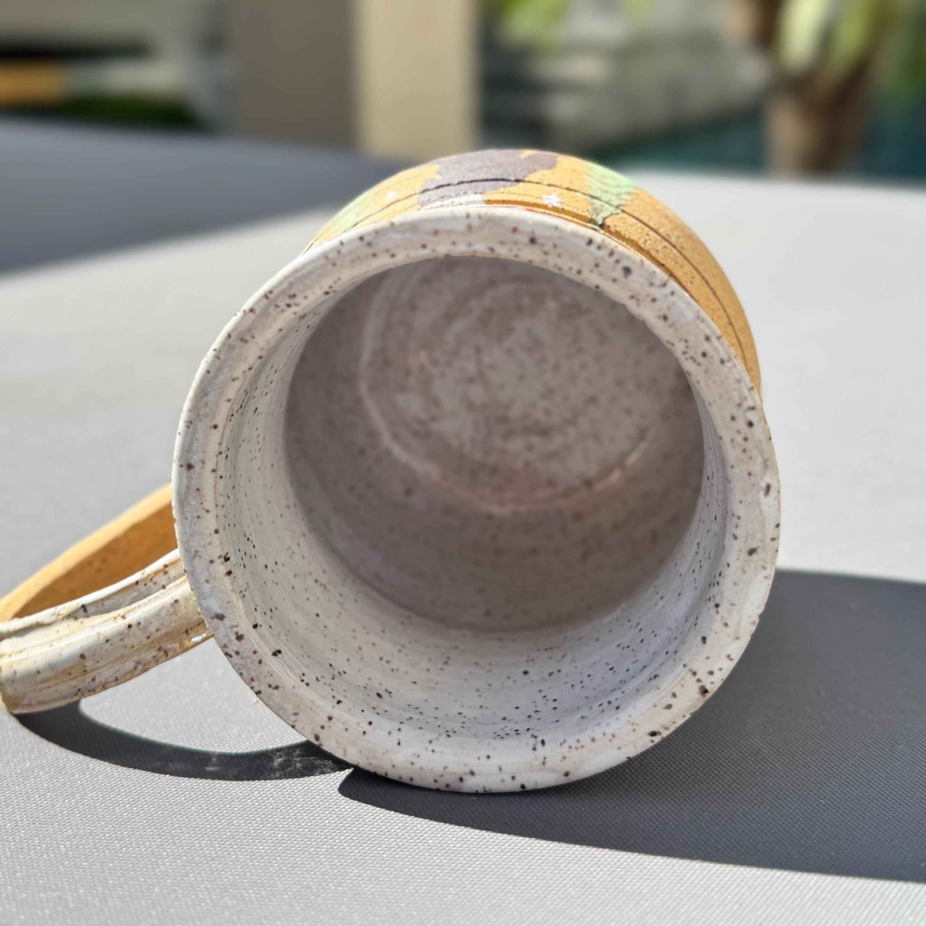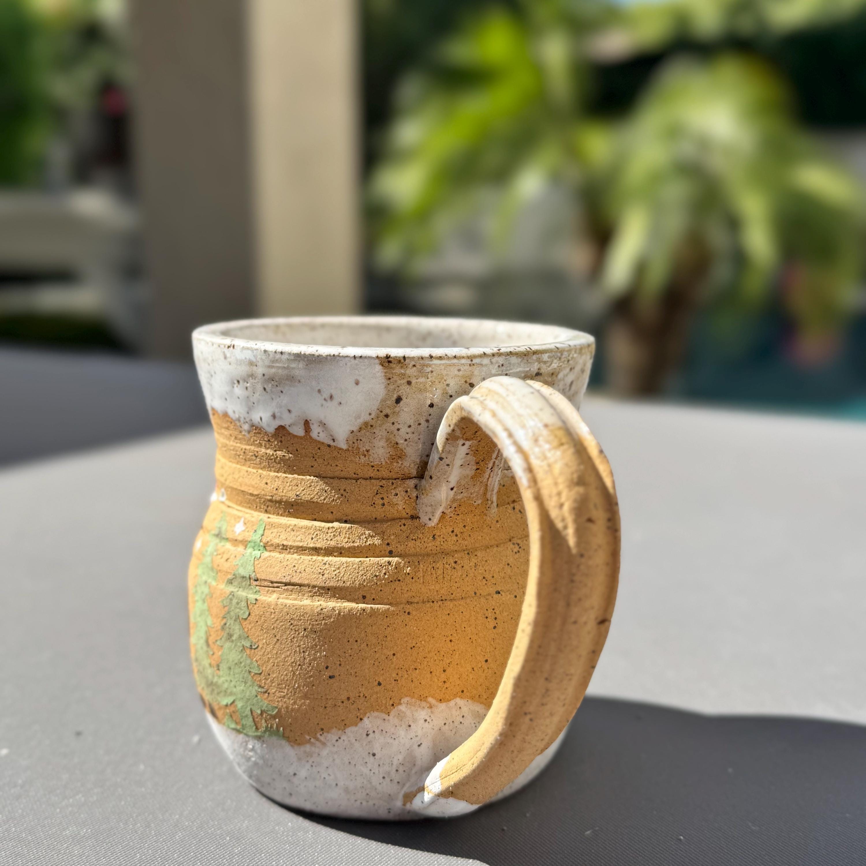 Dimensions & Features: ✔ Capacity: Approx. 16 ounces ✔ Size: Approx. 4” tall x 3.25” wide ✔ Clay: Speckled Buff Stoneware ✔ Exterior: Raw clay with hand-painted forest and Bigfoot design ✔ Interior: Glossy white celadon glaze over speckled clay ✔ Handle: Fully functional, partially glazed for comfort ✔ Hand wash only – raw exterior not suitable for dishwasher use