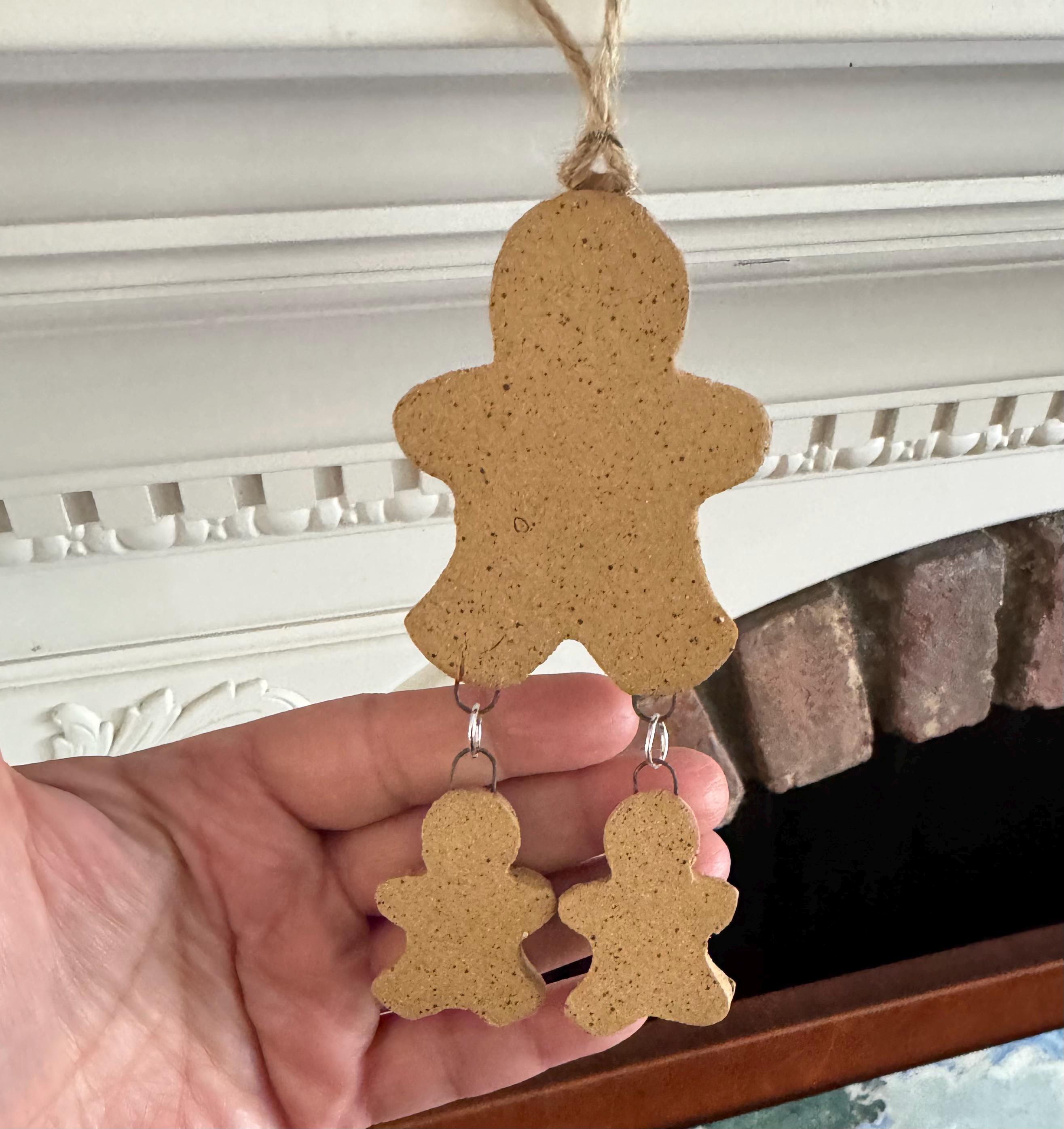 Celebrate the warmth of the season with this adorable handmade ceramic gingerbread family ornament! Featuring one large gingerbread figure with two smaller "gingerbread kids" dangling below, this piece is handcrafted from speckled buff stoneware clay and detailed with hand-applied white glaze icing for that perfect festive charm.