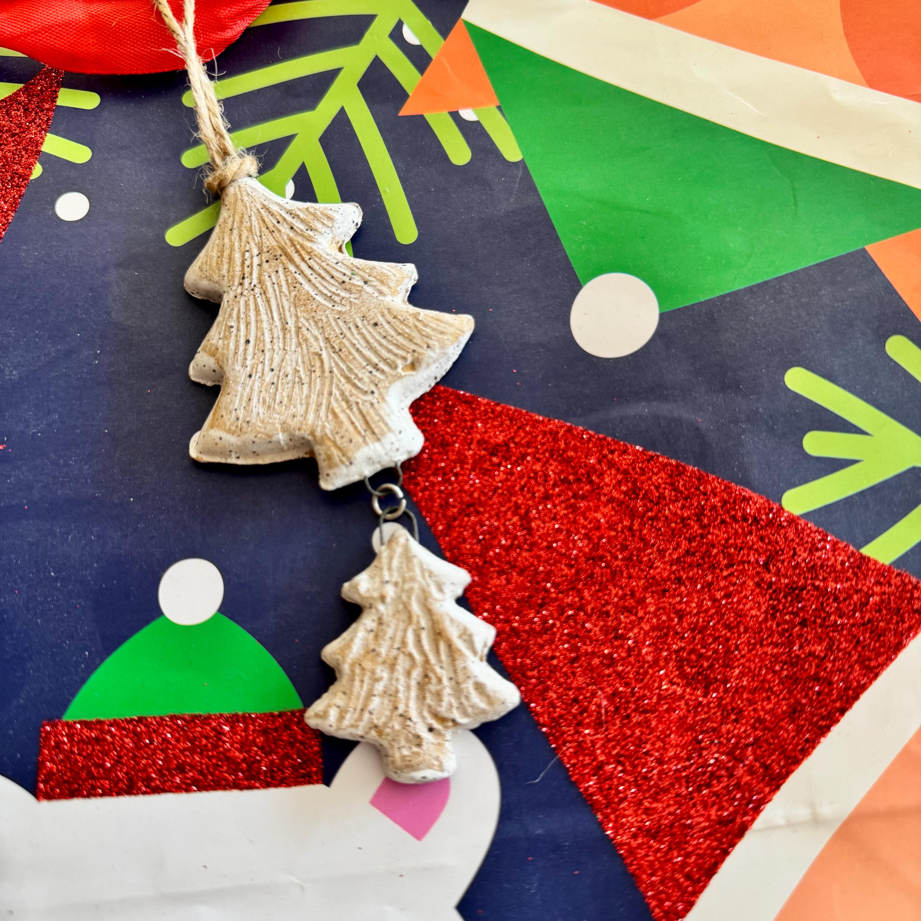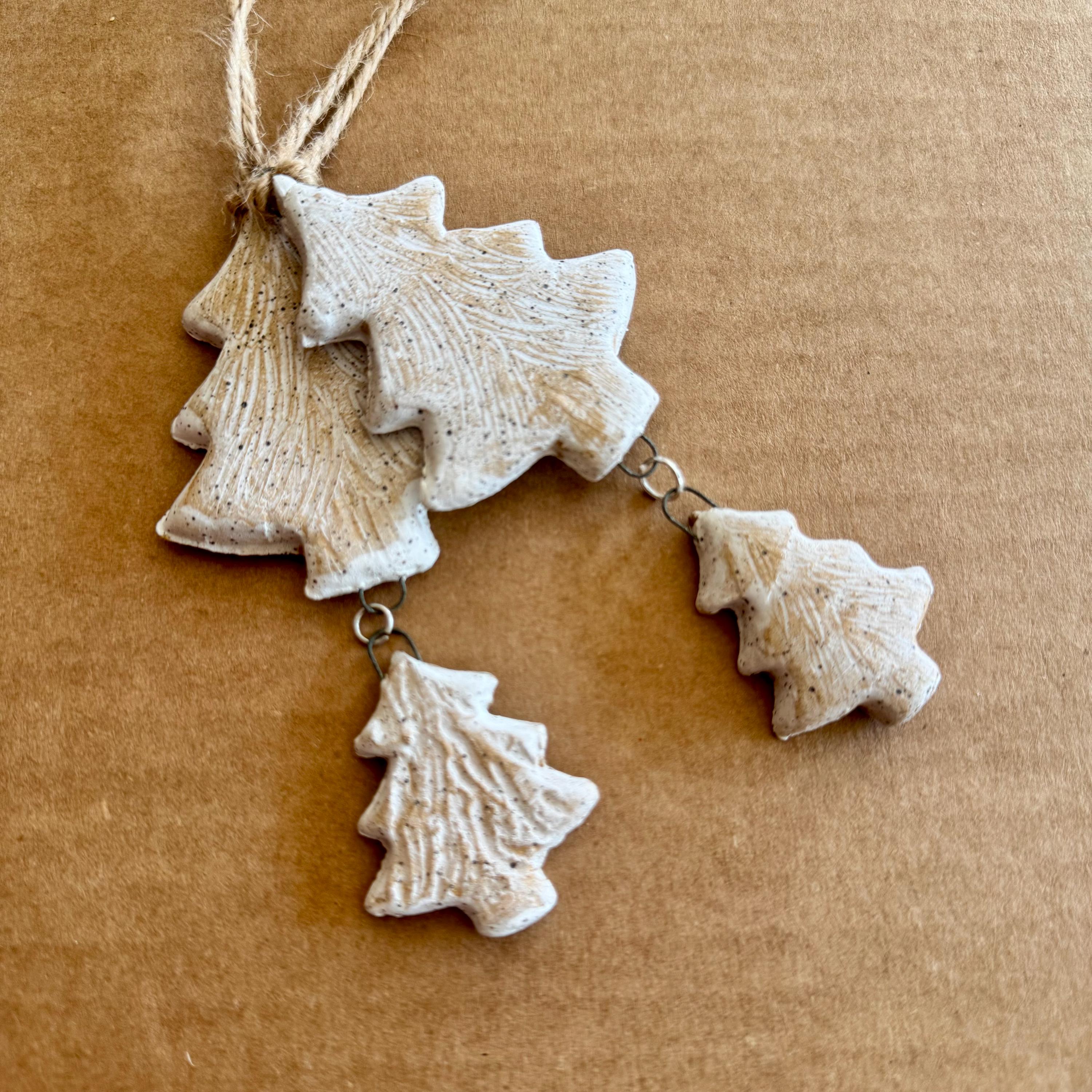 This handmade ceramic ornament features a charming tree "parent" with smaller tree dangling below — a sweet woodland-inspired take on family-themed holiday decor. Each piece is crafted from speckled buff stoneware clay and finished with a soft white glaze wash that highlights the carved texture, giving it a snowy, rustic appearance.