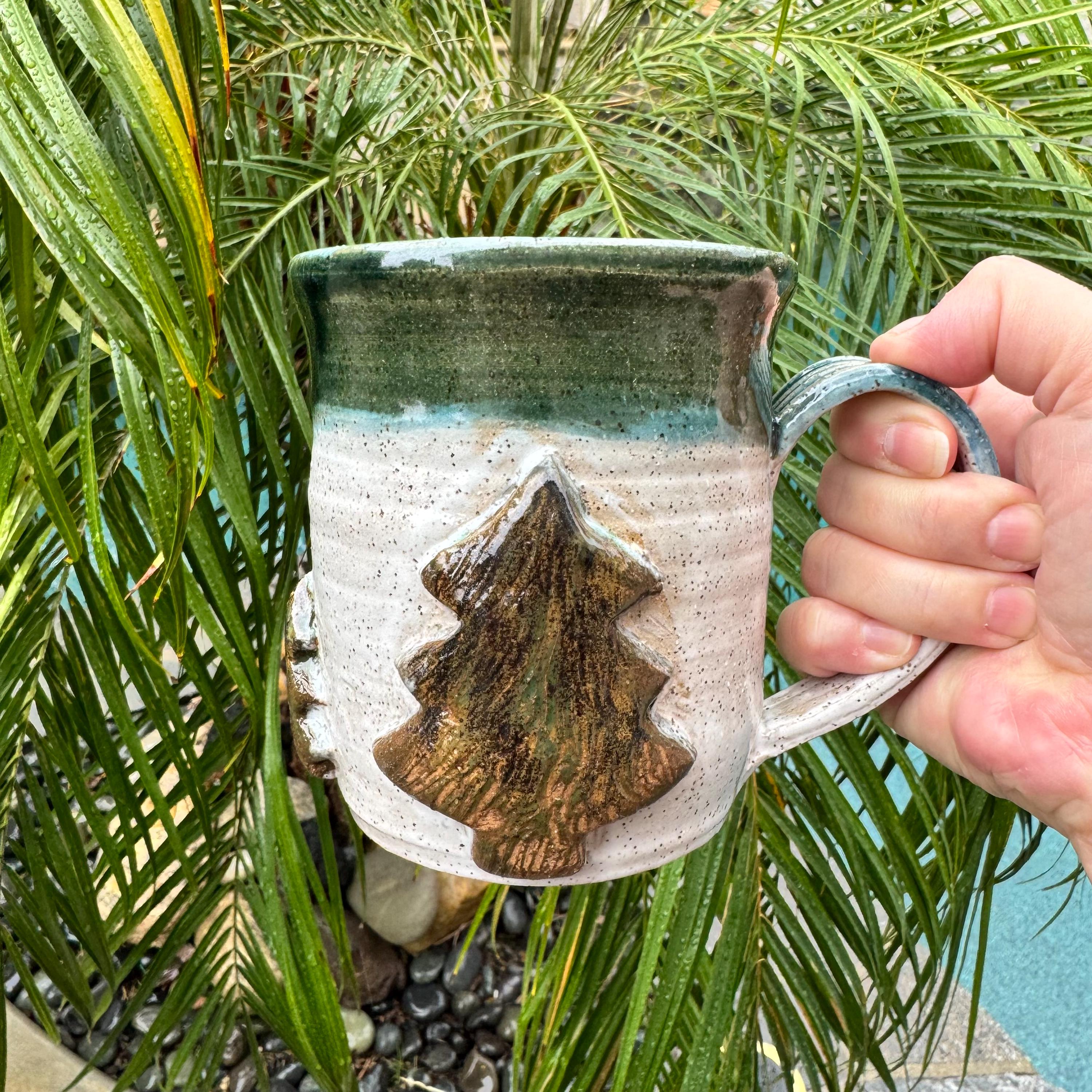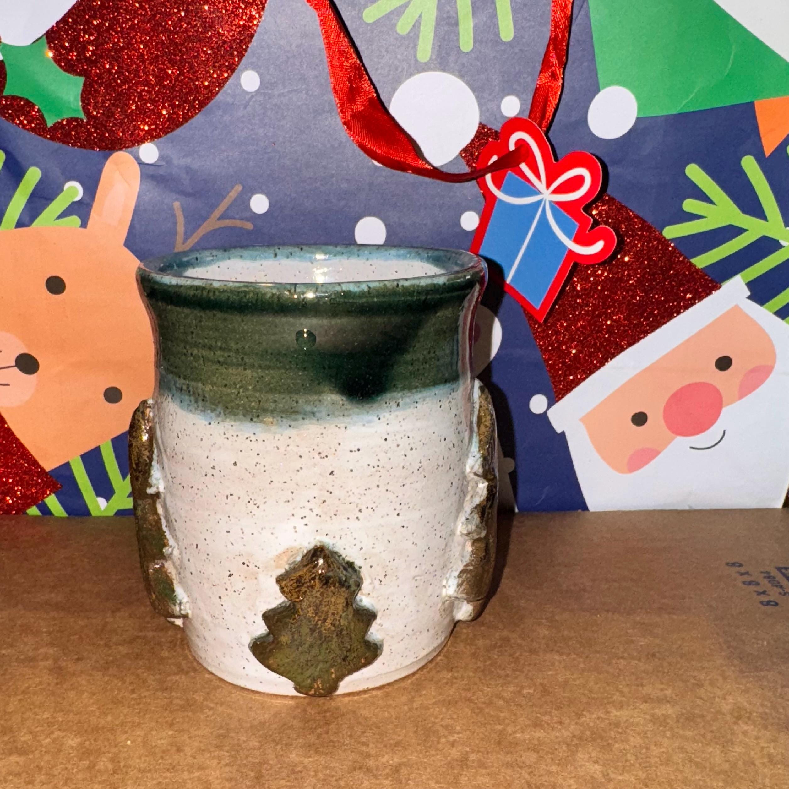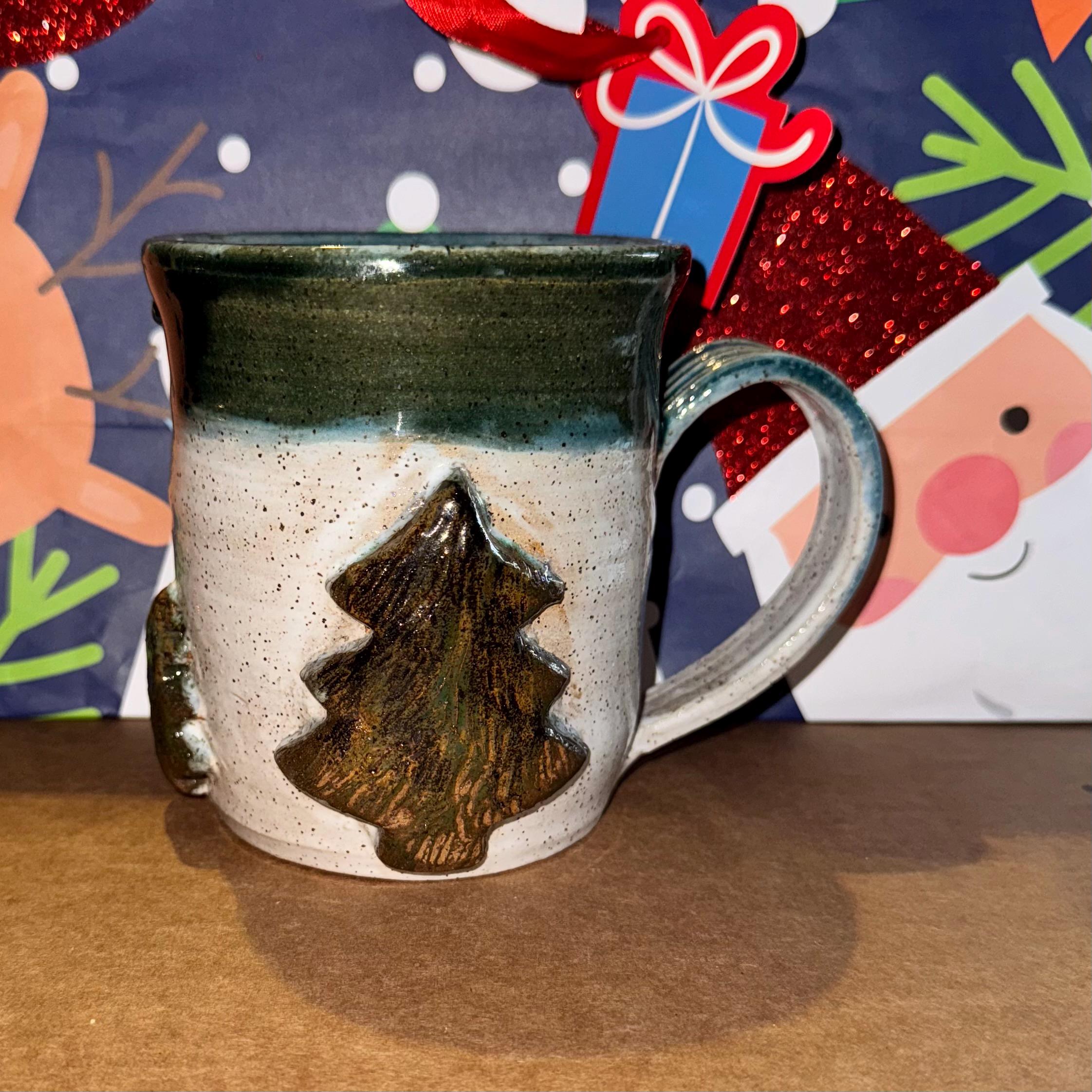Dimensions & Features: ✔ Capacity: Approx. 16 ounces ✔ Size: Approx. 4” tall x 3.5” wide ✔ Clay: Speckled Buff Stoneware ✔ Glaze: Deep pine green over snowy white ✔ Detail: Embossed tree designs all around ✔ Interior: Fully glazed white speckle ✔ Microwave & dishwasher safe (hand wash preferred)