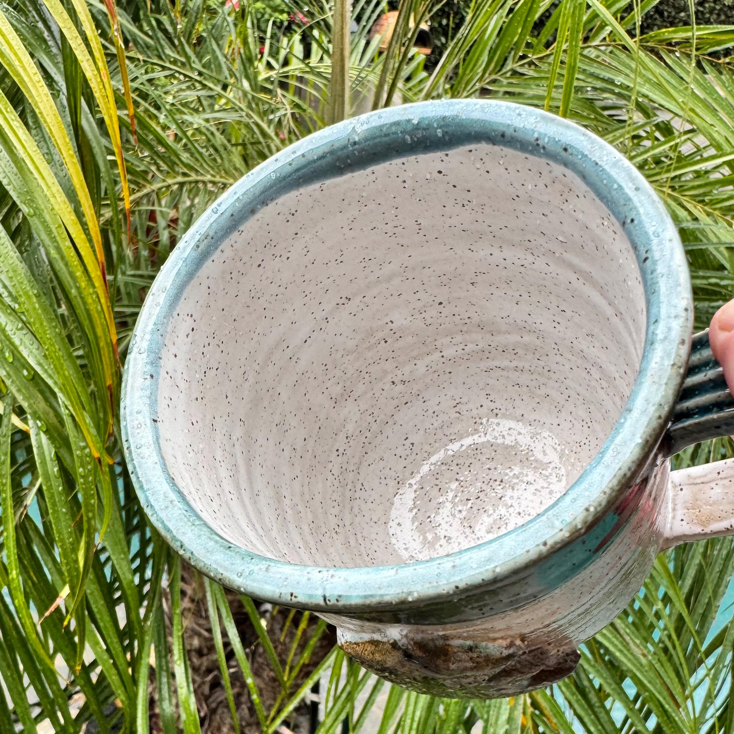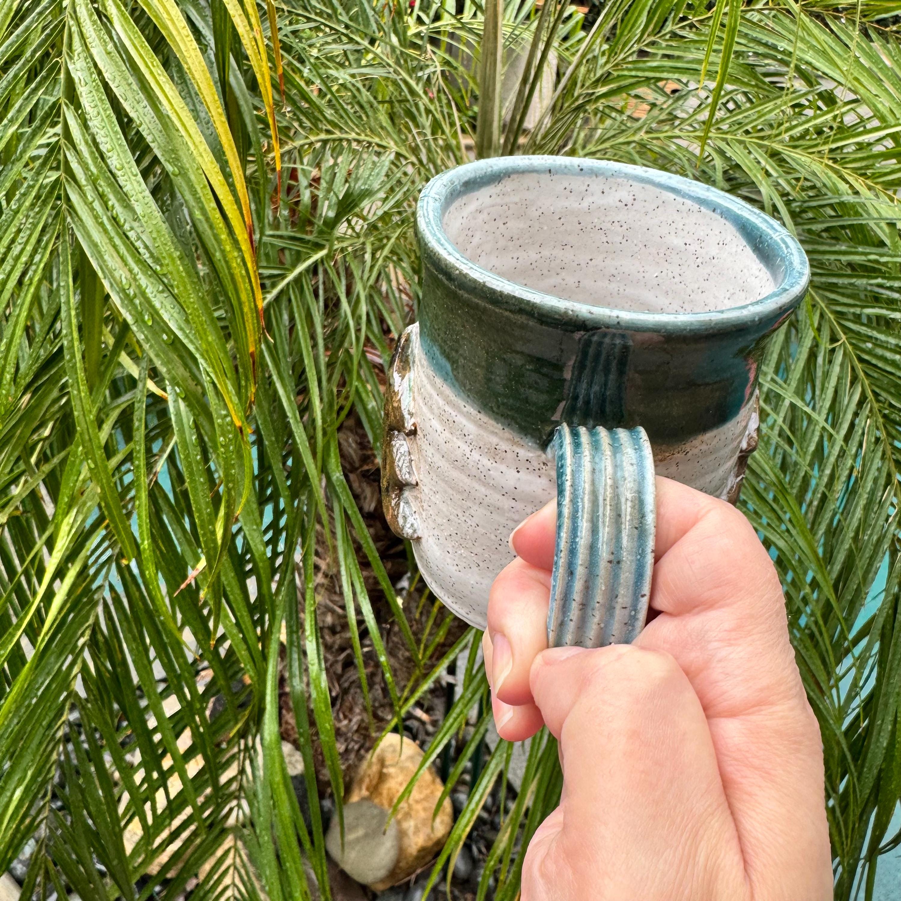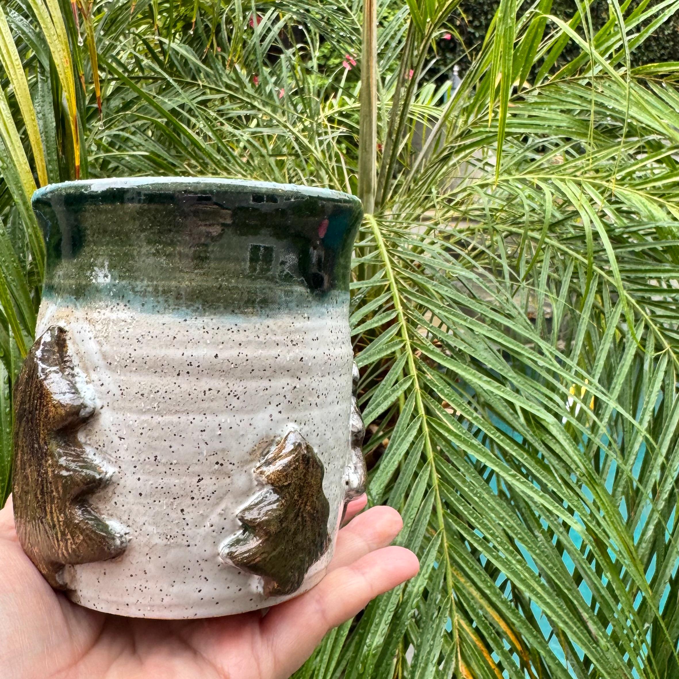 Dimensions & Features: ✔ Capacity: Approx. 16 ounces ✔ Size: Approx. 4” tall x 3.5” wide ✔ Clay: Speckled Buff Stoneware ✔ Glaze: Deep pine green over snowy white ✔ Detail: Embossed tree designs all around ✔ Interior: Fully glazed white speckle ✔ Microwave & dishwasher safe (hand wash preferred)