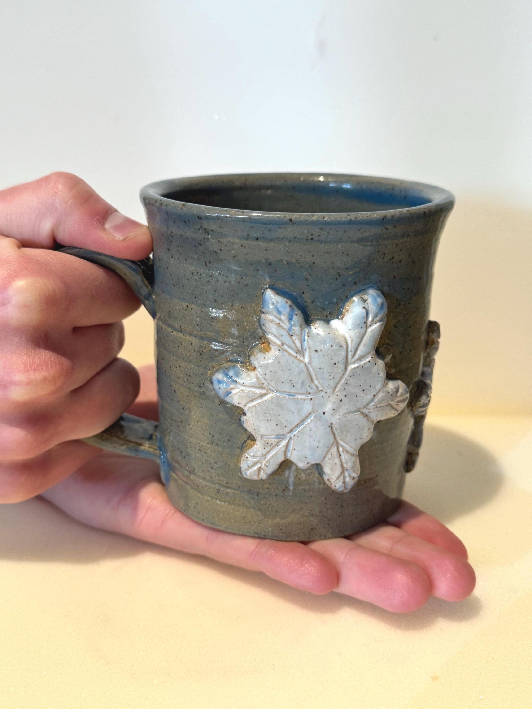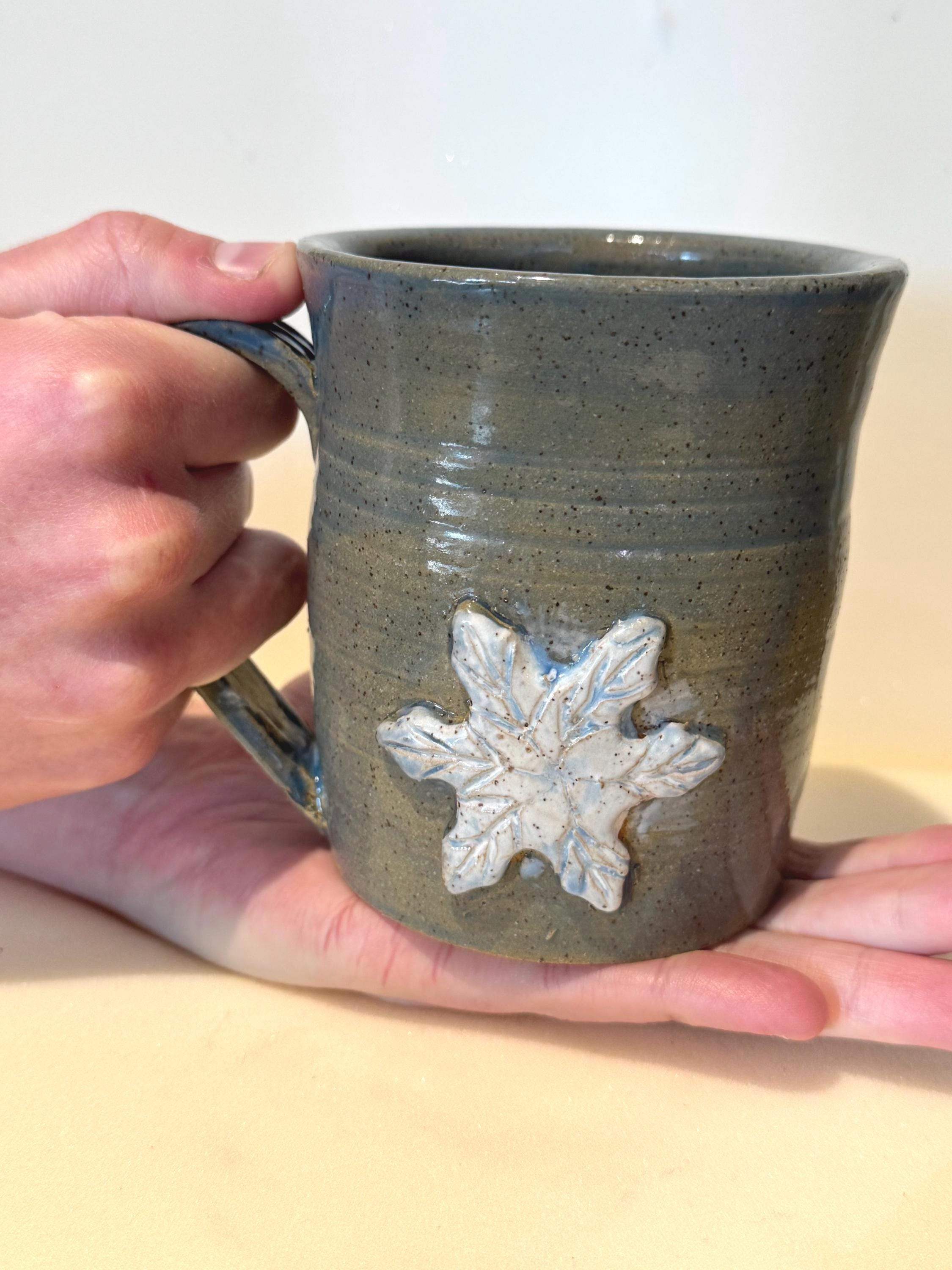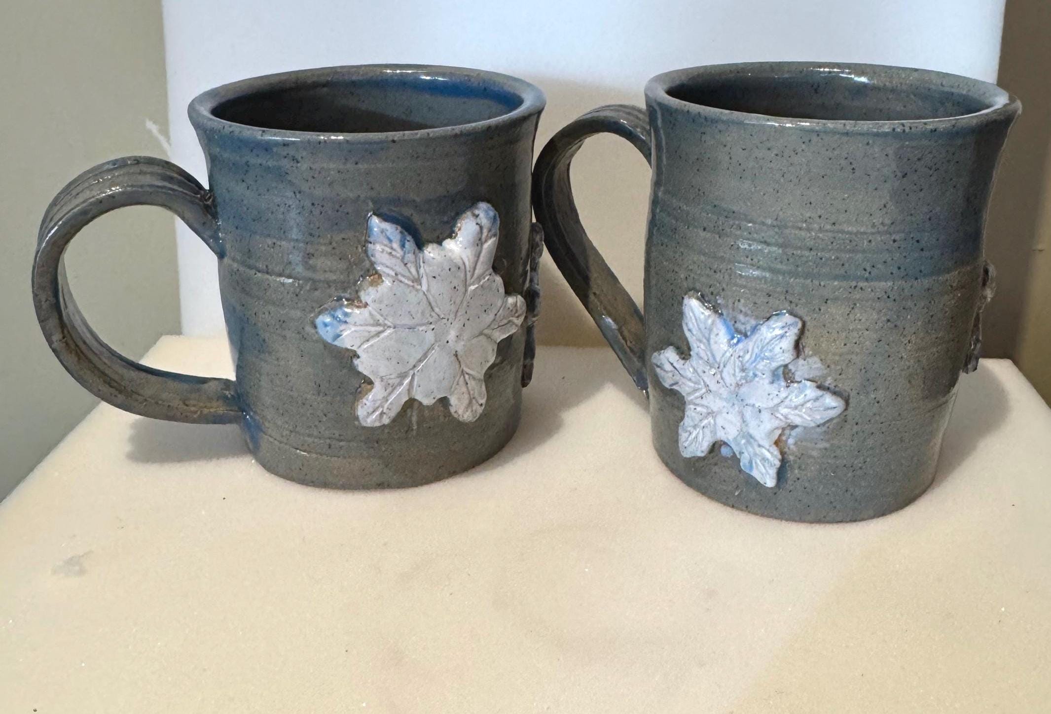 ✔ Capacity: 16 oz ✔ Size: 4” tall x 3.75” wide at the rim ✔ Clay: Speckled buff stoneware ✔ Glaze: Blue-gray body with glossy white snowflake appliqués ✔ Handle: Sturdy and curved – fits your hand comfortably ✔ Microwave & dishwasher safe (handwashing recommended)