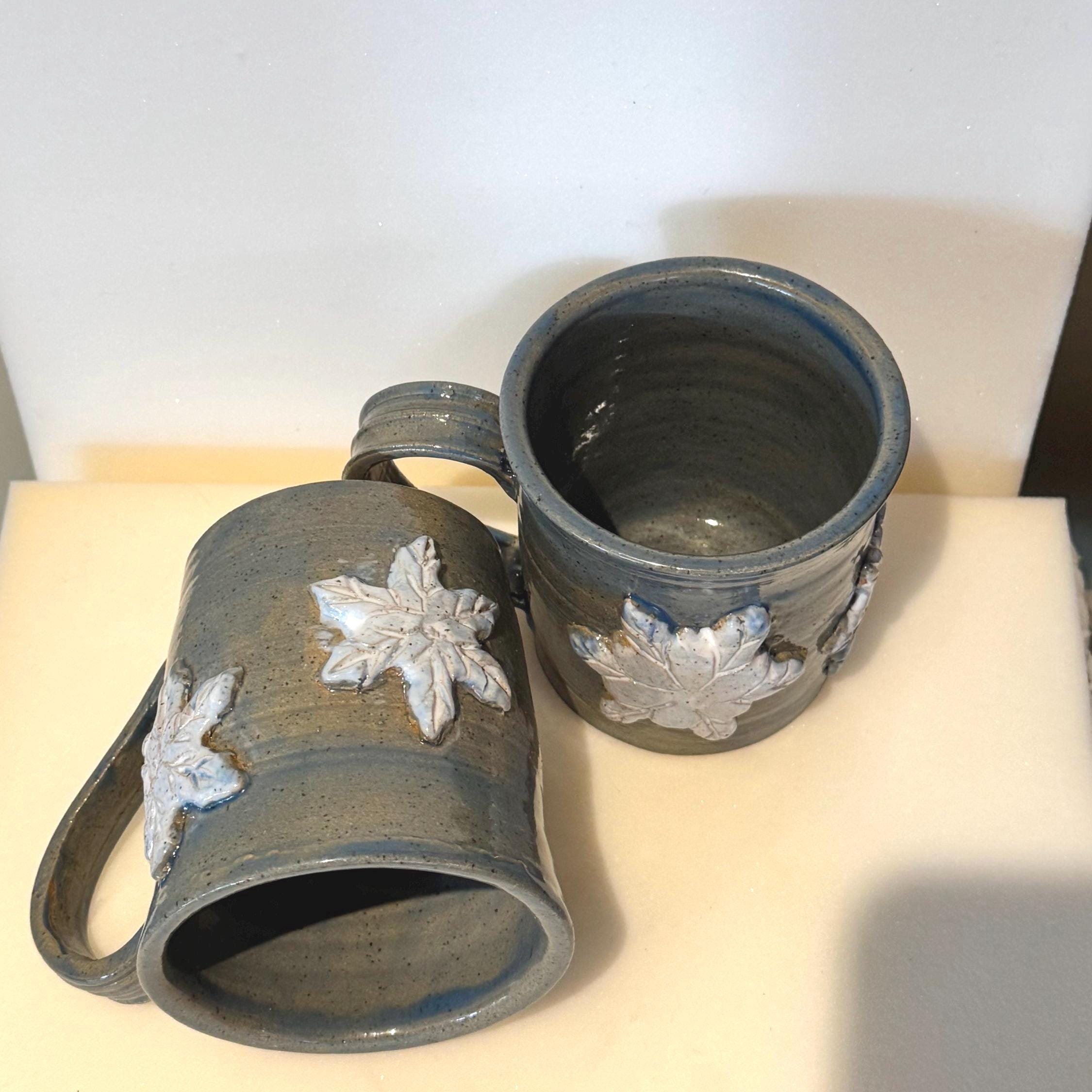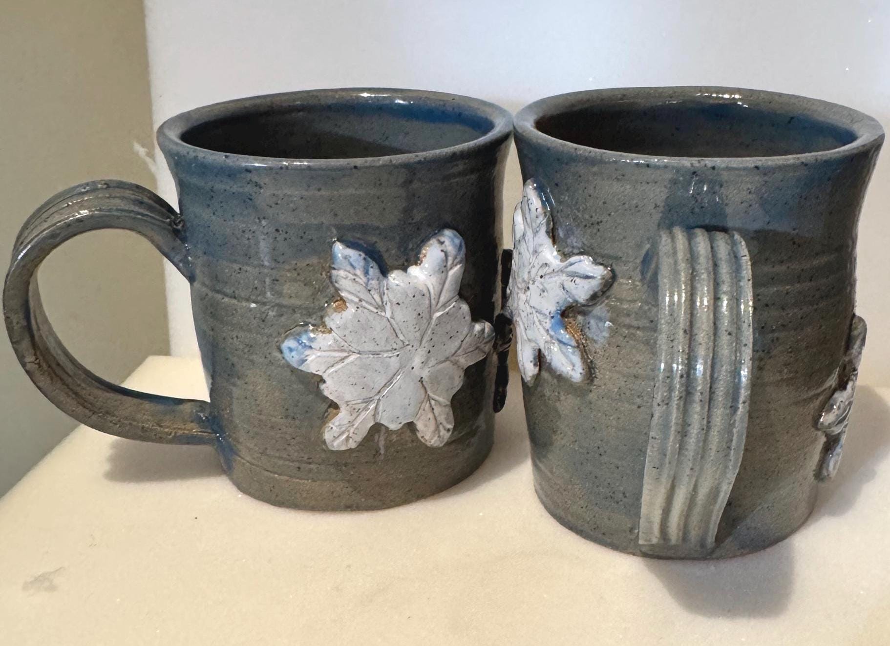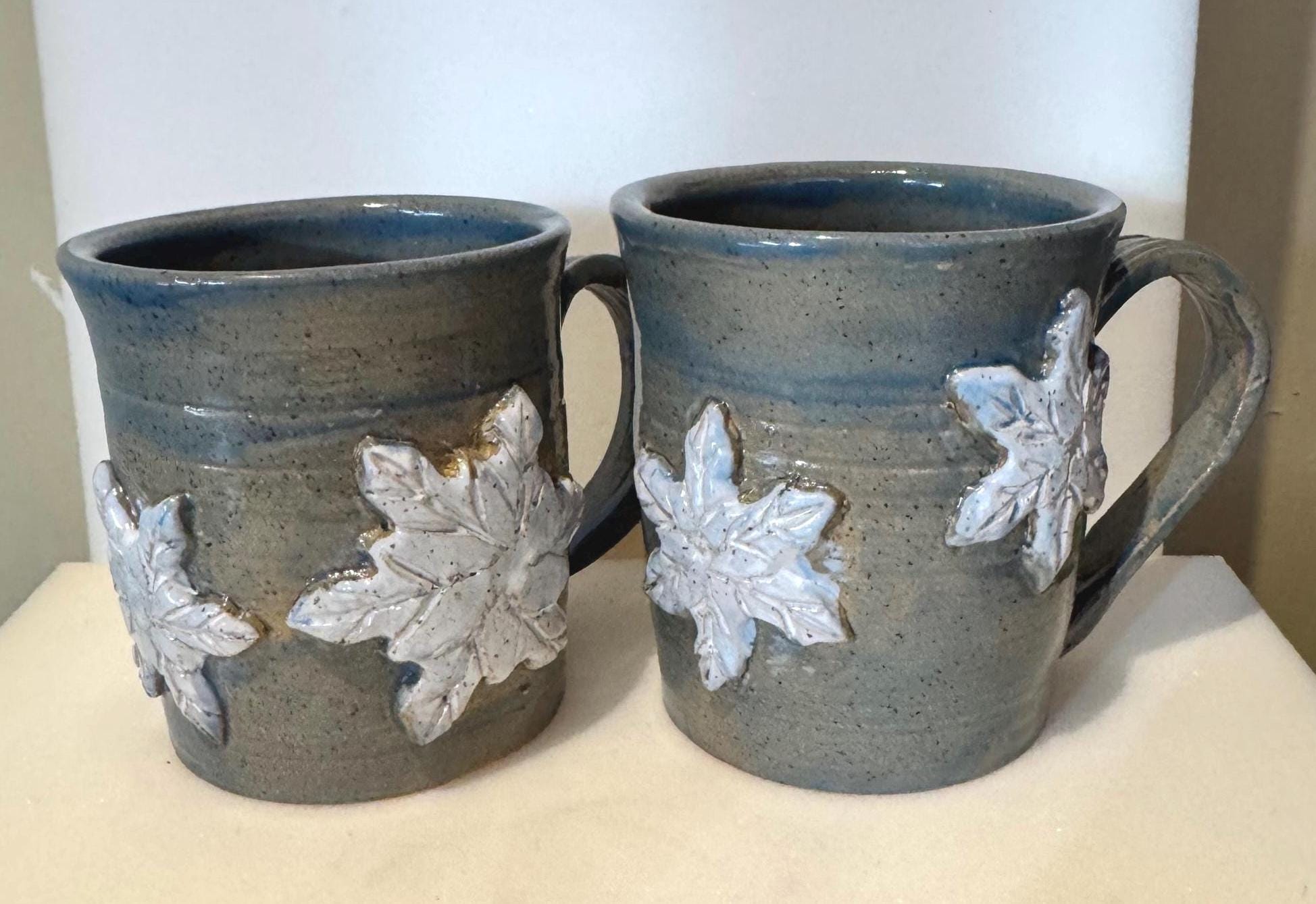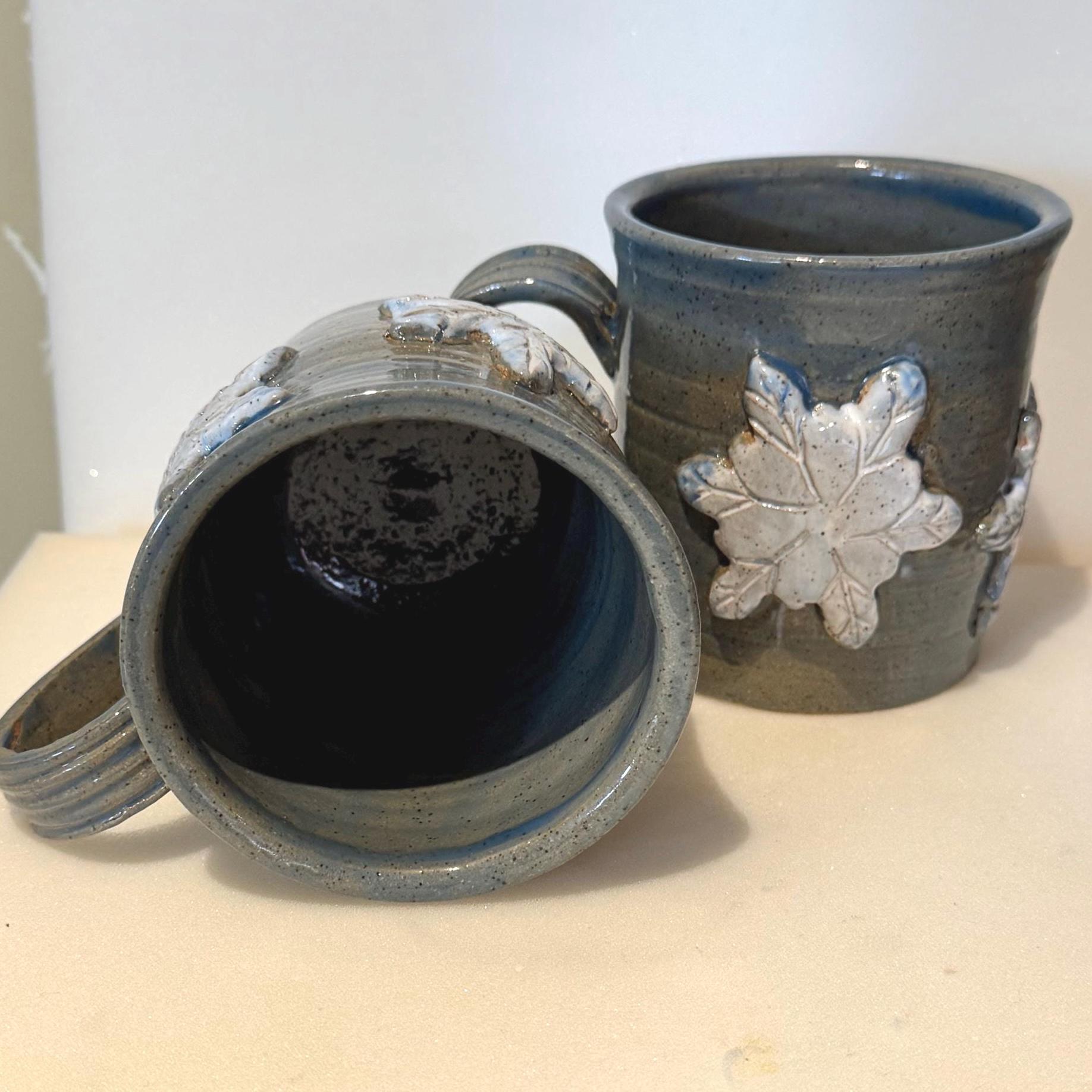 ✔ Capacity: 16 oz ✔ Size: 4” tall x 3.75” wide at the rim ✔ Clay: Speckled buff stoneware ✔ Glaze: Blue-gray body with glossy white snowflake appliqués ✔ Handle: Sturdy and curved – fits your hand comfortably ✔ Microwave & dishwasher safe (handwashing recommended)