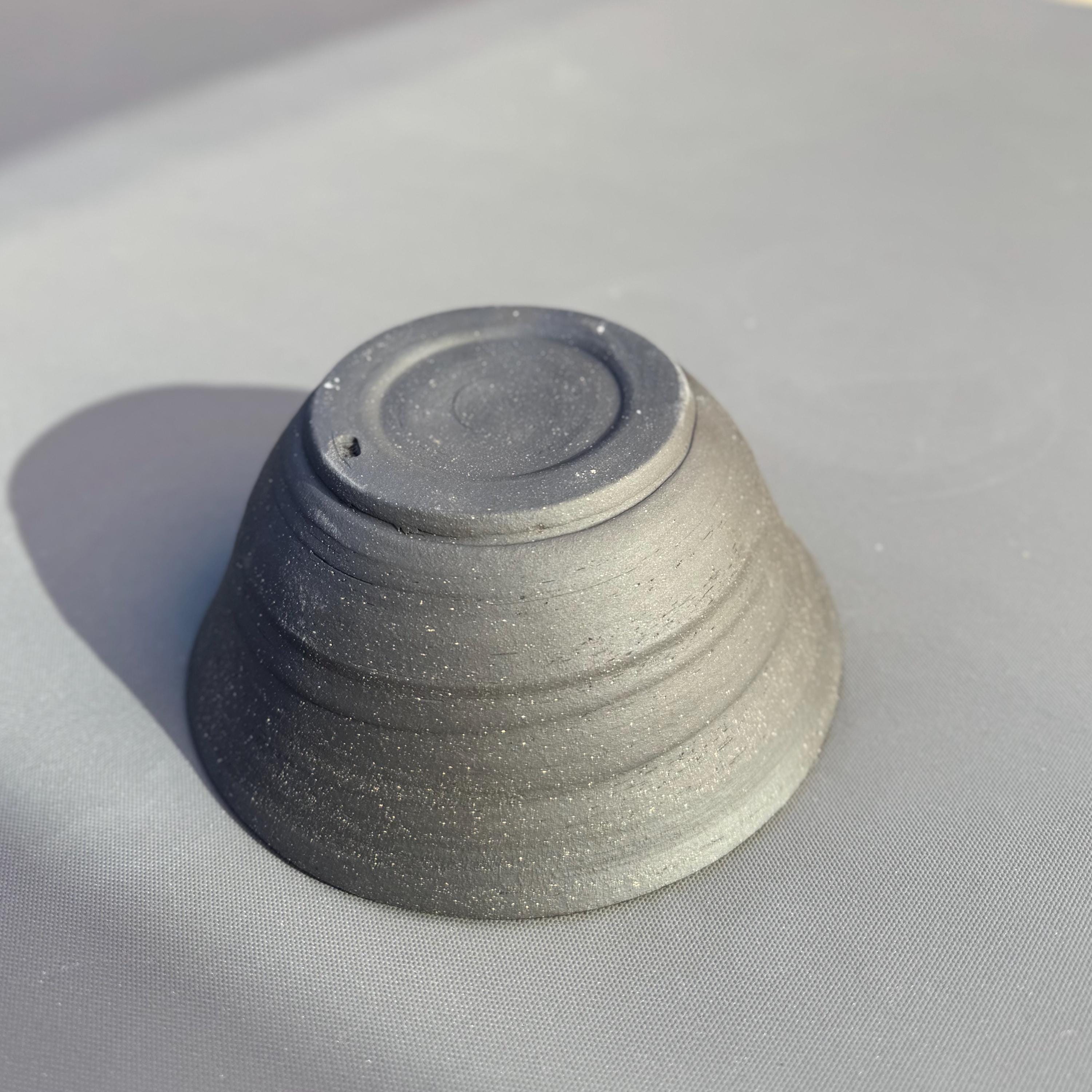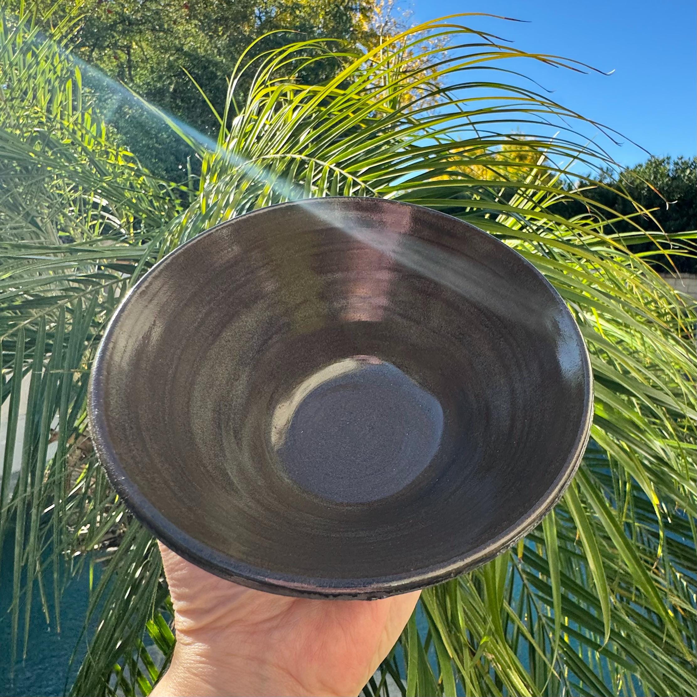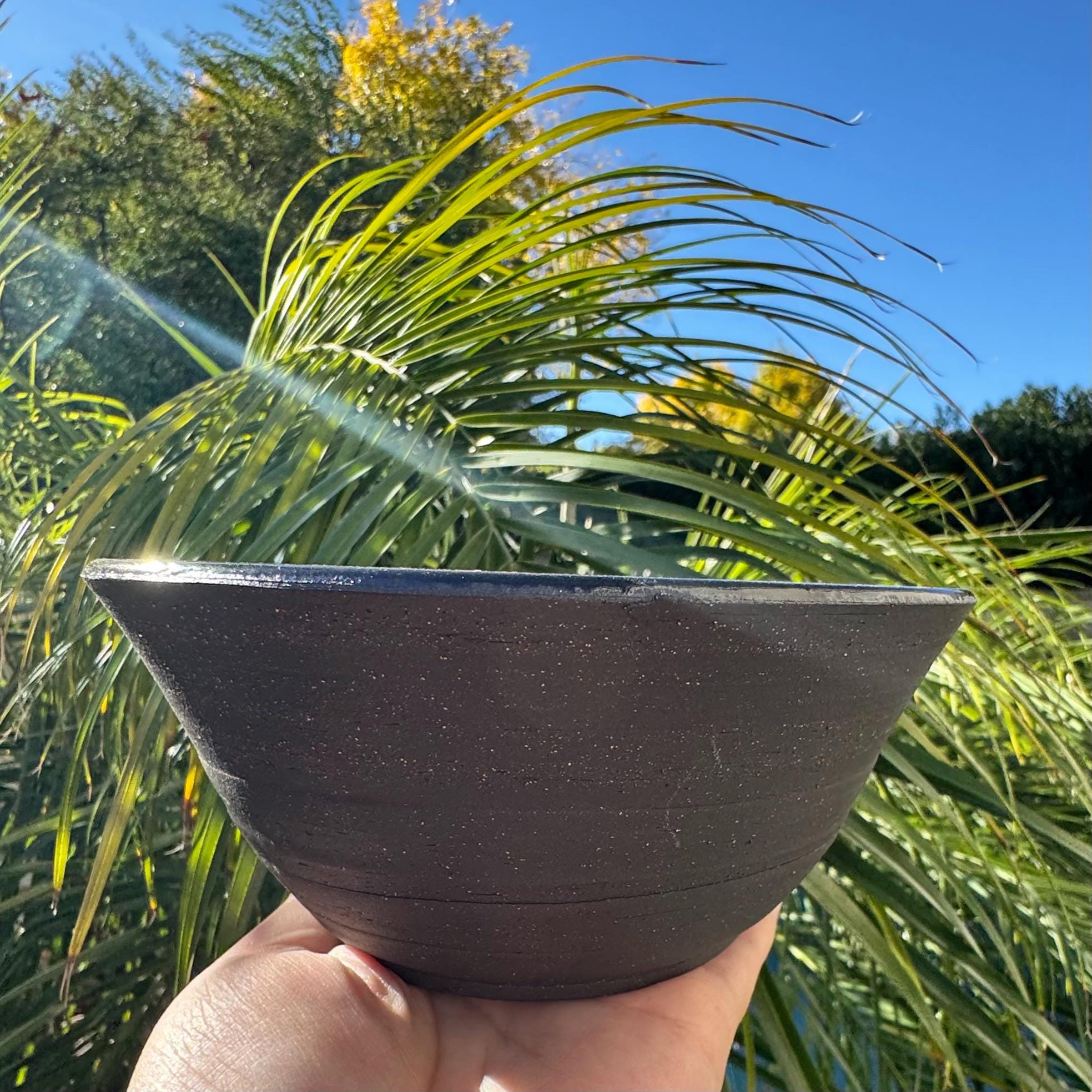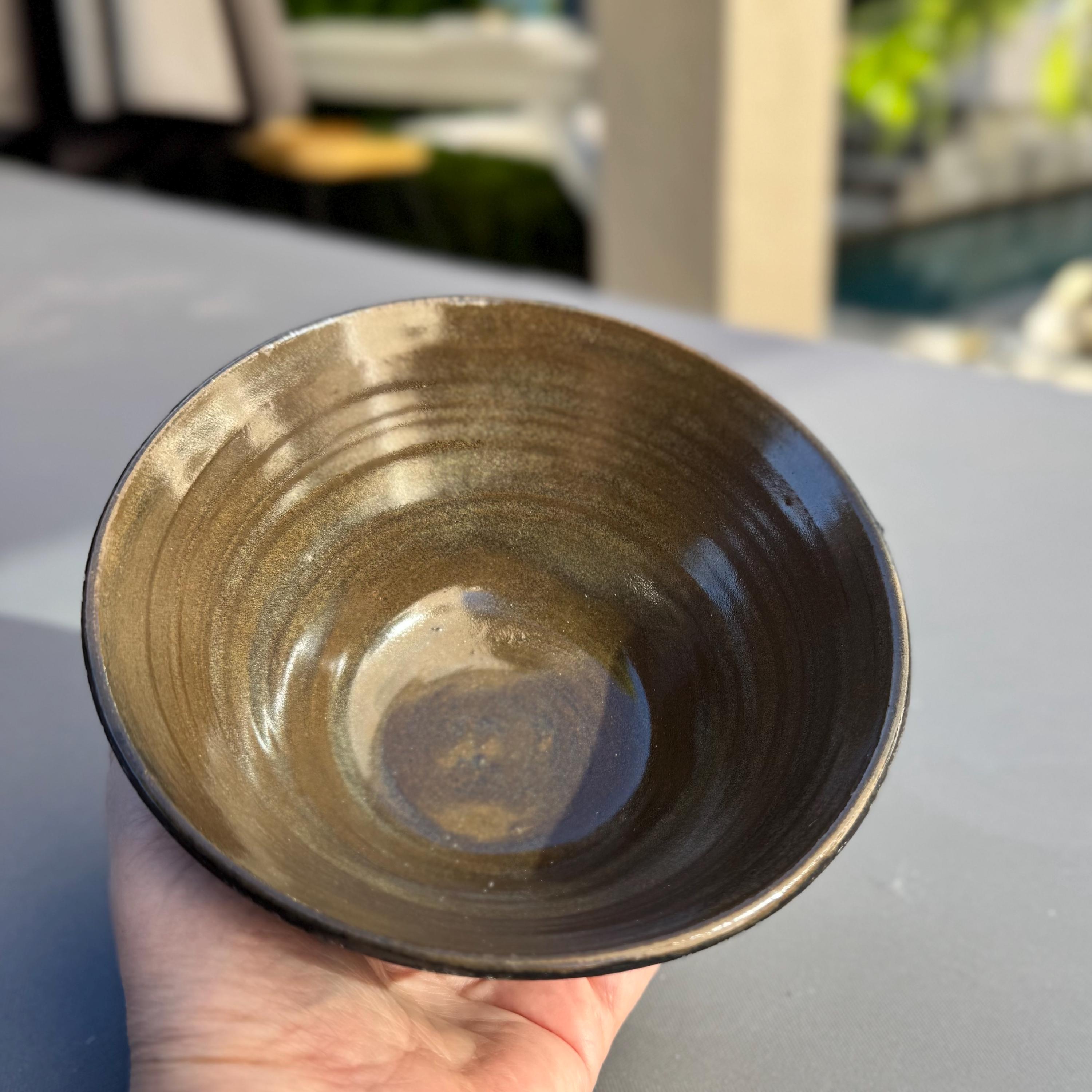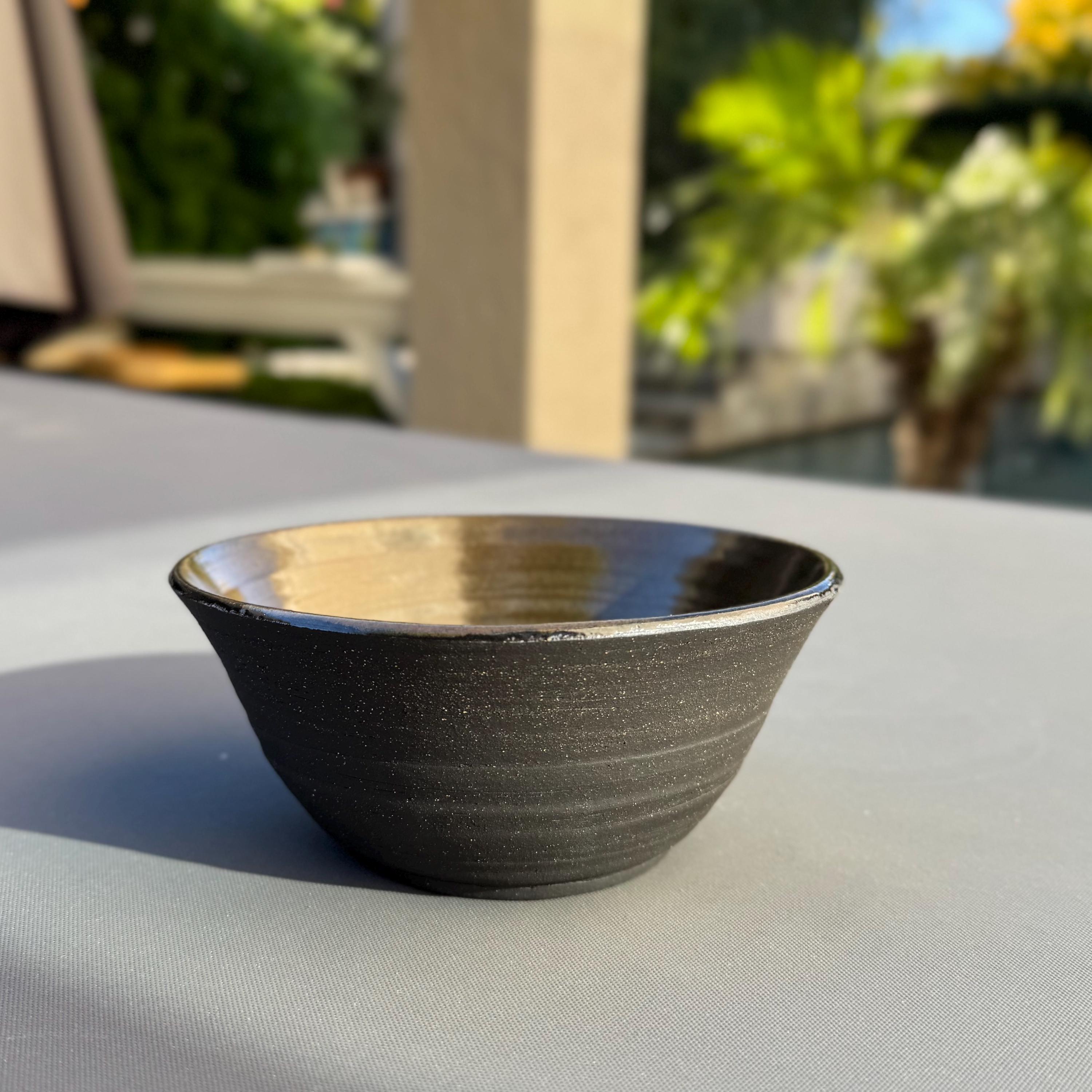 Wheel-thrown ceramic bowl crafted from dark brown/black stoneware clay, left raw on the exterior for a tactile, matte finish. The interior is finished in a glossy iron lustre glaze, shifting between earthy bronze and metallic charcoal tones depending on the light. This bowl comfortably holds 2 cups of liquid and is ideal for soups, snacks, or small salads. The minimalist form and natural texture make it a versatile piece for everyday use.
