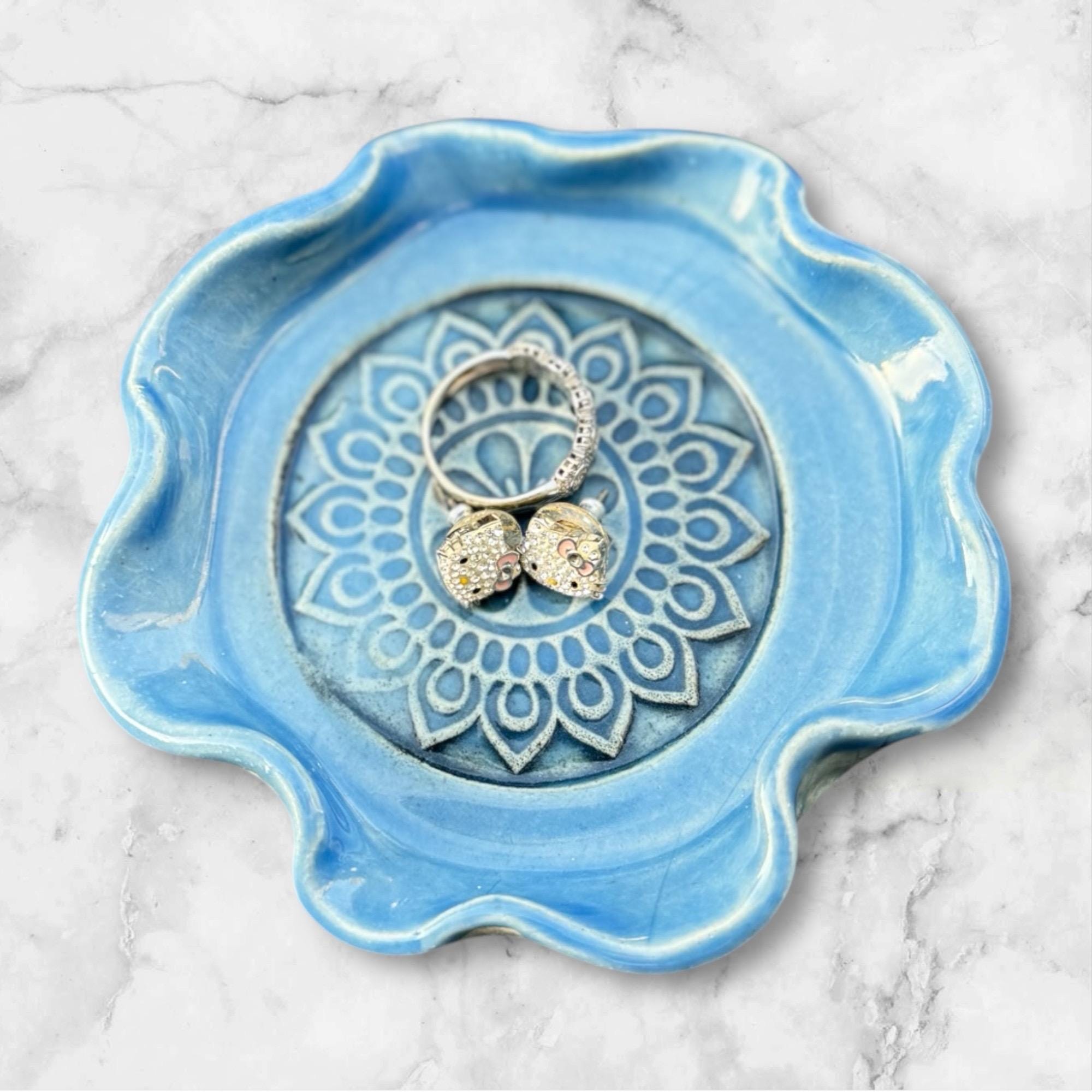 Beautiful Handmade Ceramic Dish – Organic Edges & Mandala Center A simple and elegant way to keep everyday items in one place. These small handmade dishes are shaped with soft, wavy edges and feature a detailed stamped mandala in the center for added texture and charm. Made from durable stoneware and finished in your choice of glossy blue or white speckled glaze, each dish is unique and full of character.