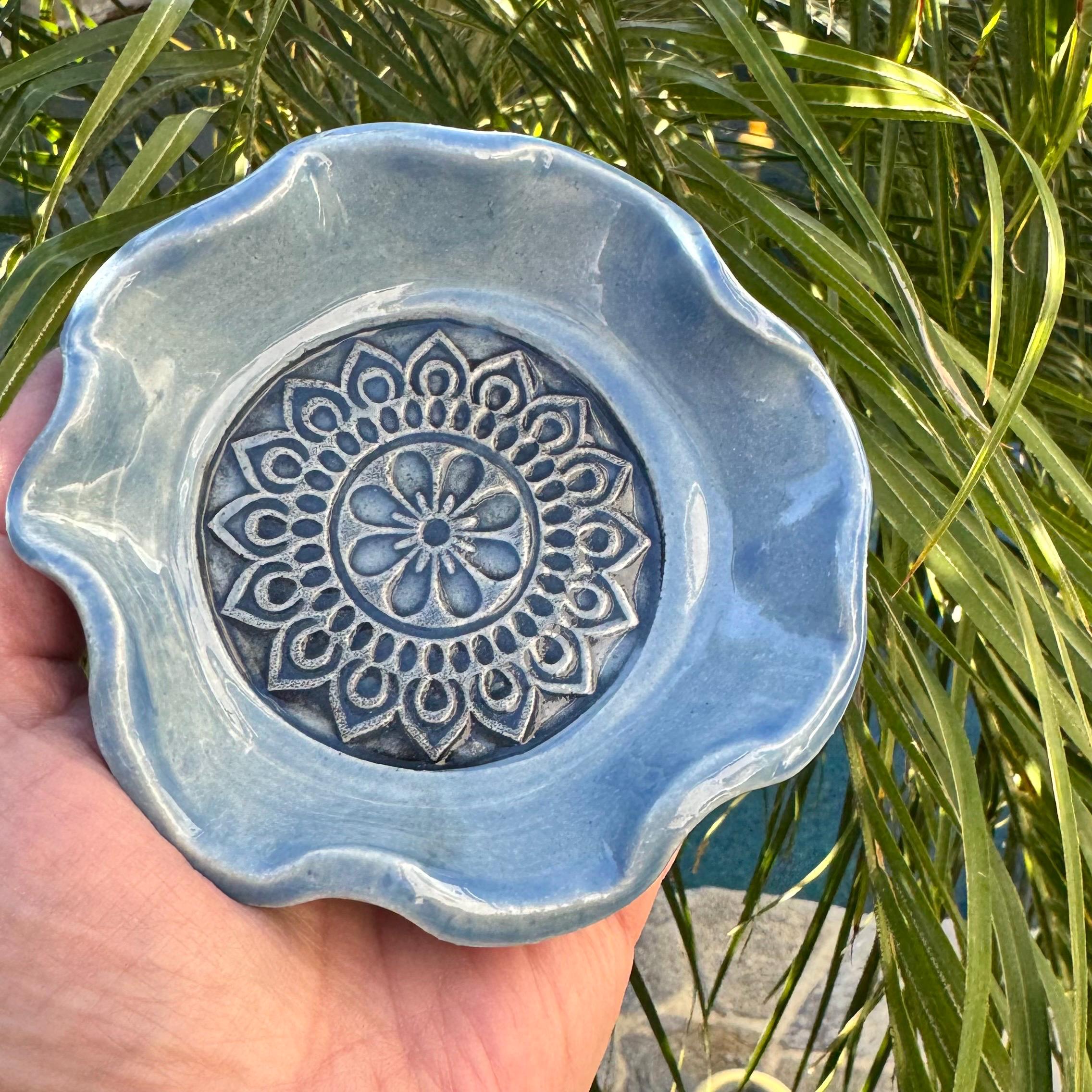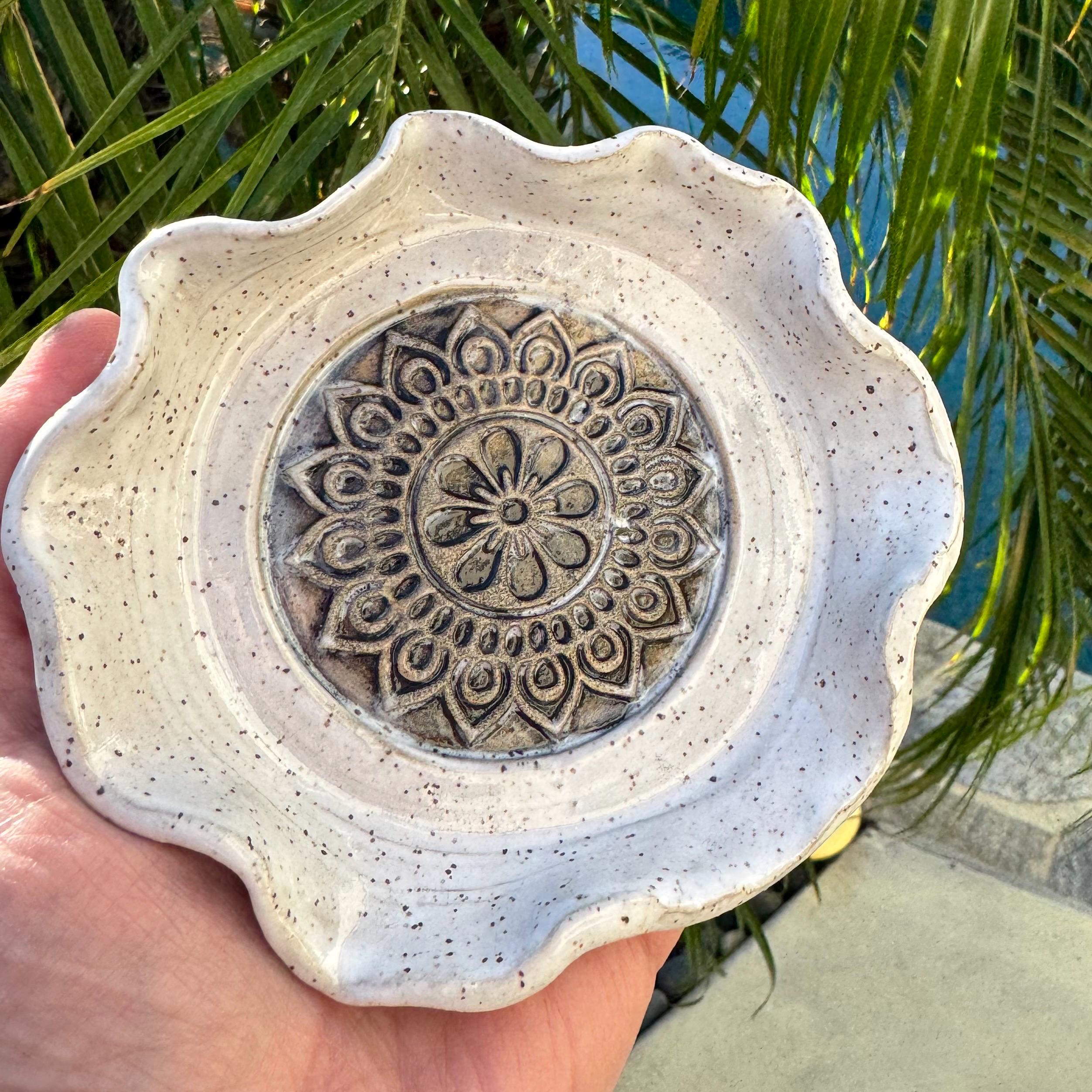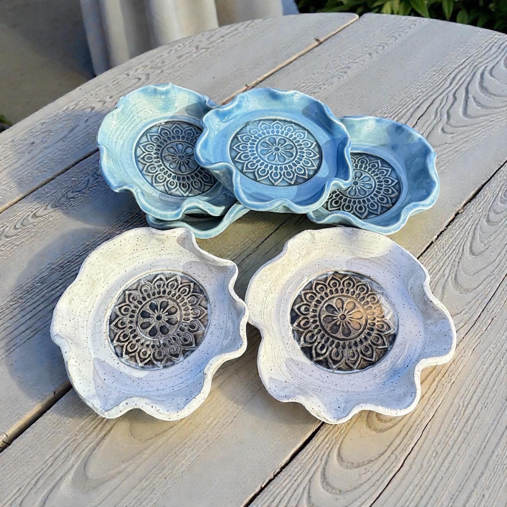 Dimensions & Features: ✔ Approx. 4” diameter × ½” tall ✔ Stoneware clay body ✔ Glaze options: Glossy blue or white speckled (choose at checkout) ✔ Stamped mandala center for visual detail and texture ✔ Wavy, hand-formed organic edges ✔ Food-safe glaze – safe for spoon or tea bag use