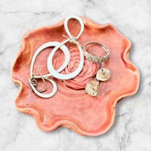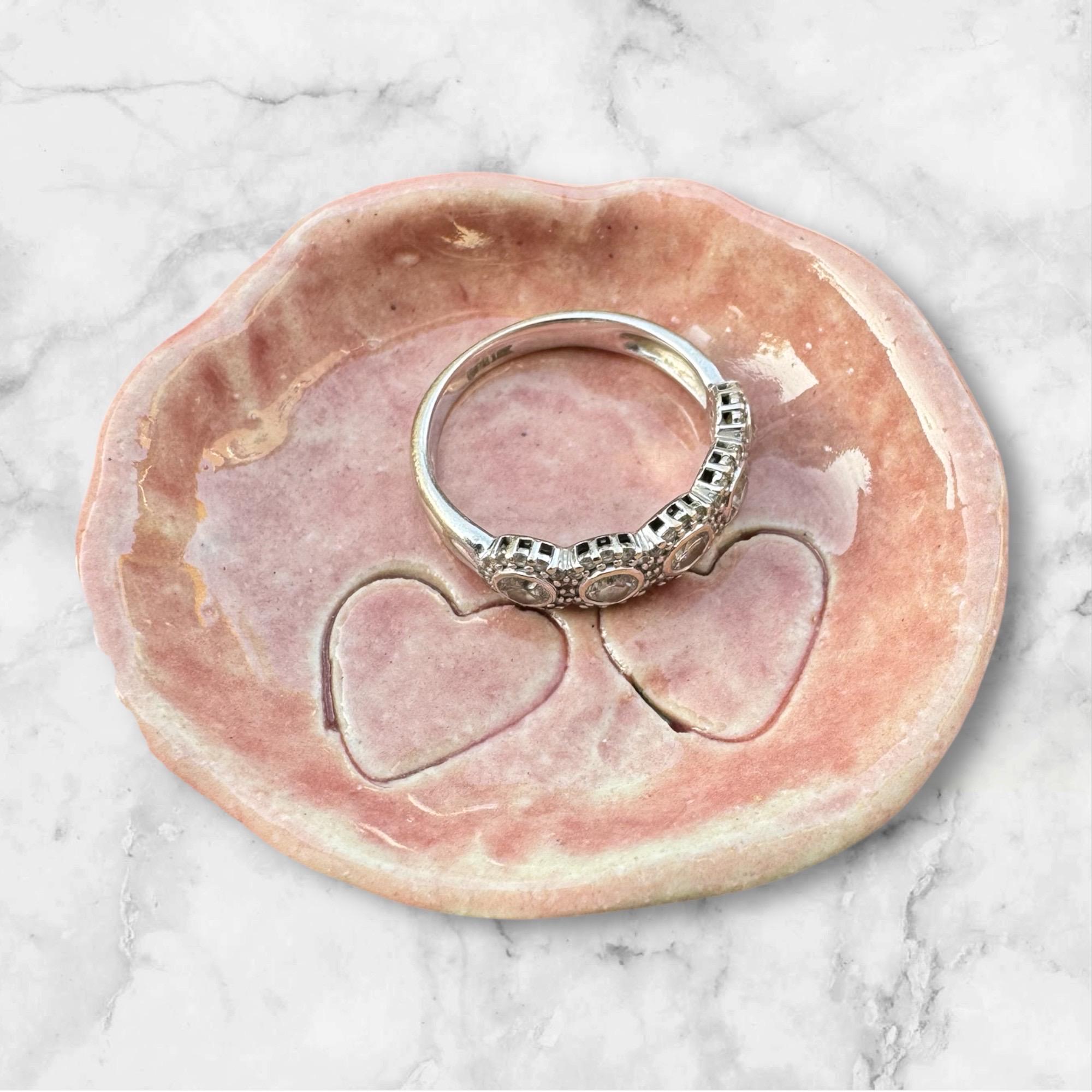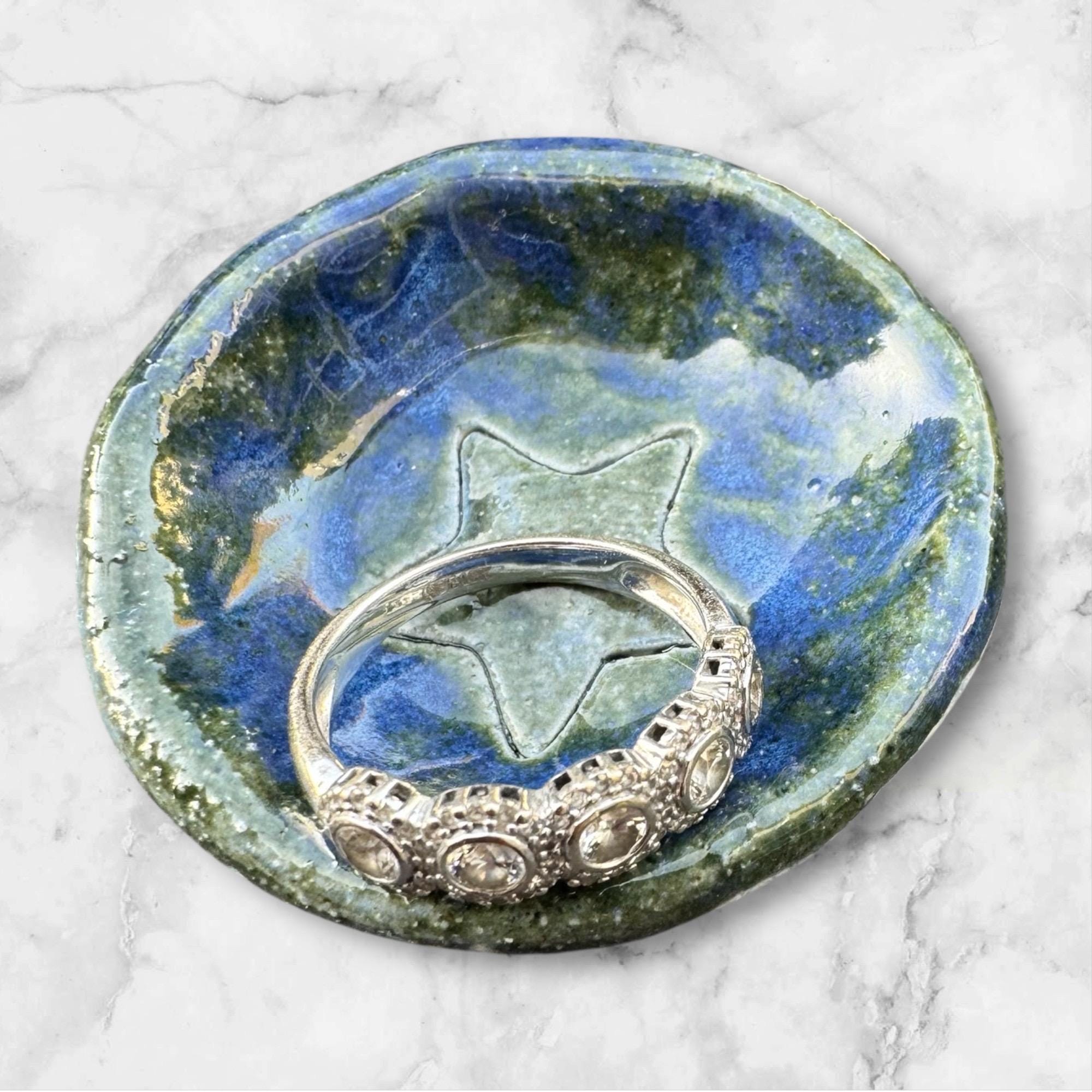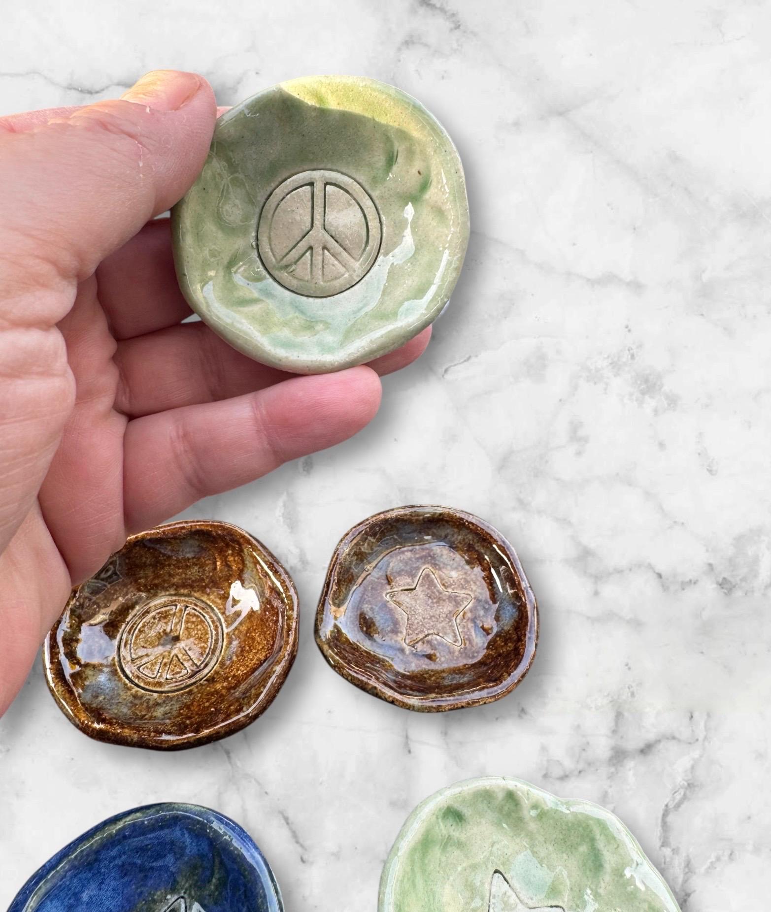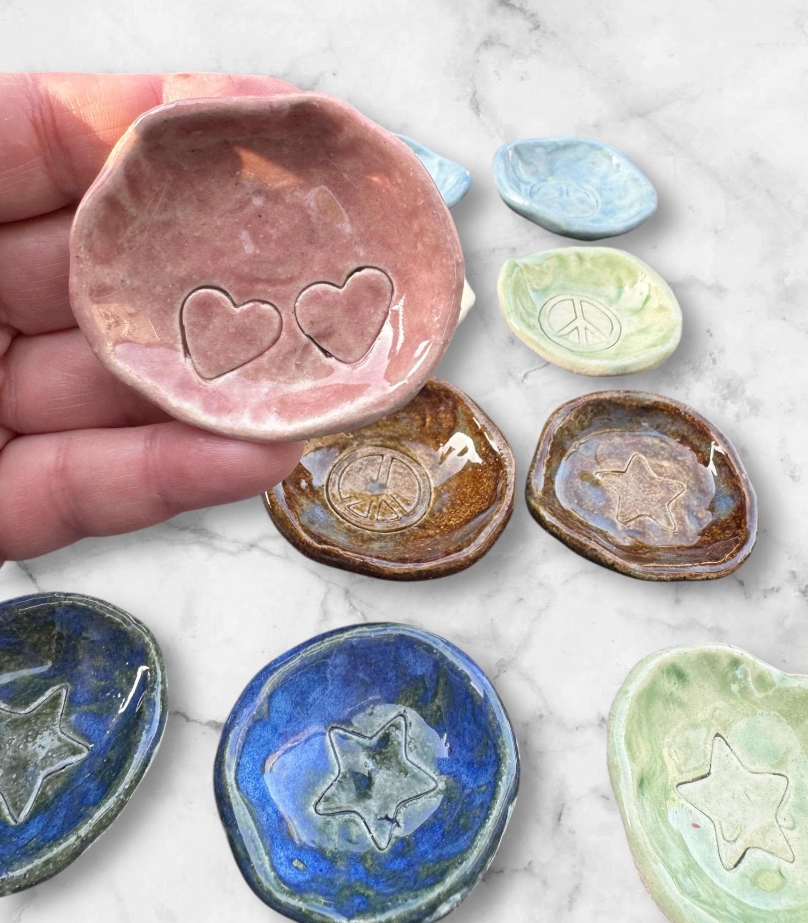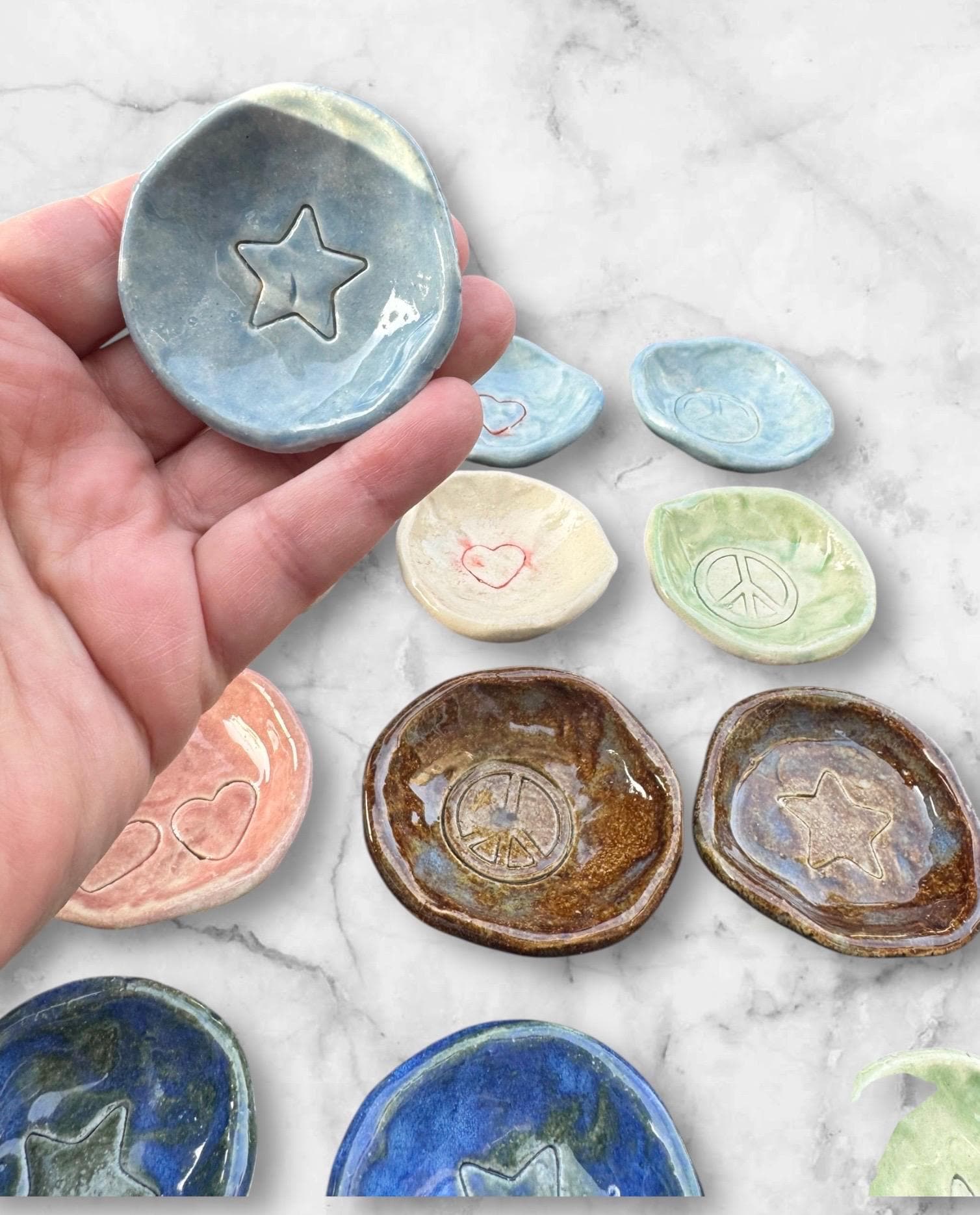 Tiny Handmade Trinket Dishes – Assorted Designs & Colors These mini ceramic dishes are the perfect little spot for your rings, earrings, or other small treasures. Each one is hand-formed from stoneware clay, glazed in a variety of beautiful tones, and stamped with a peace sign, heart, or star motif. No two are ever the same — each dish has its own unique charm in both shape and glaze.
