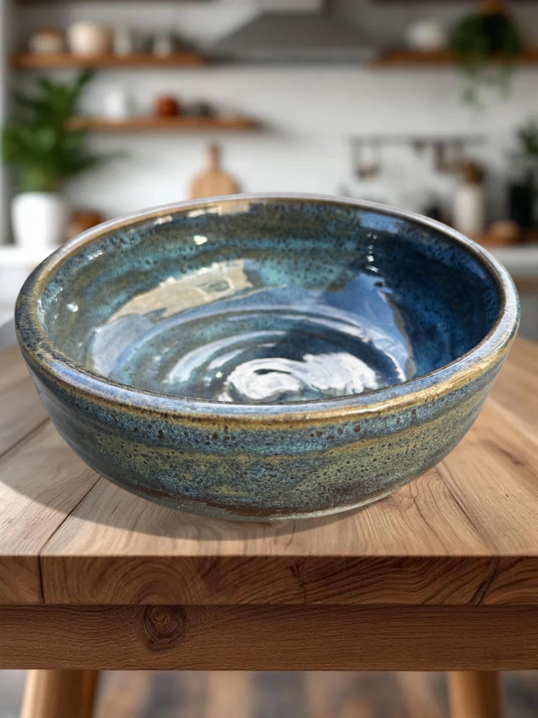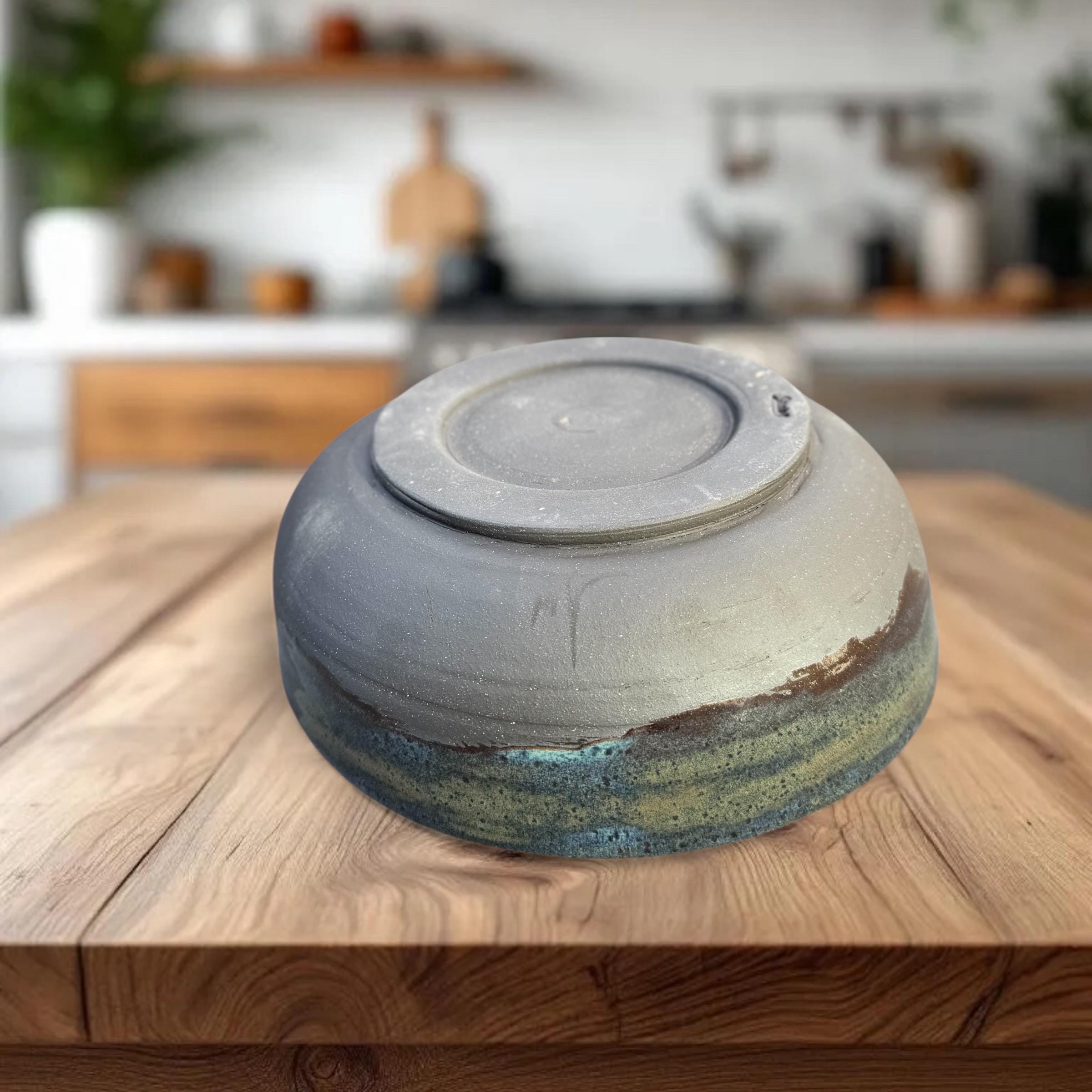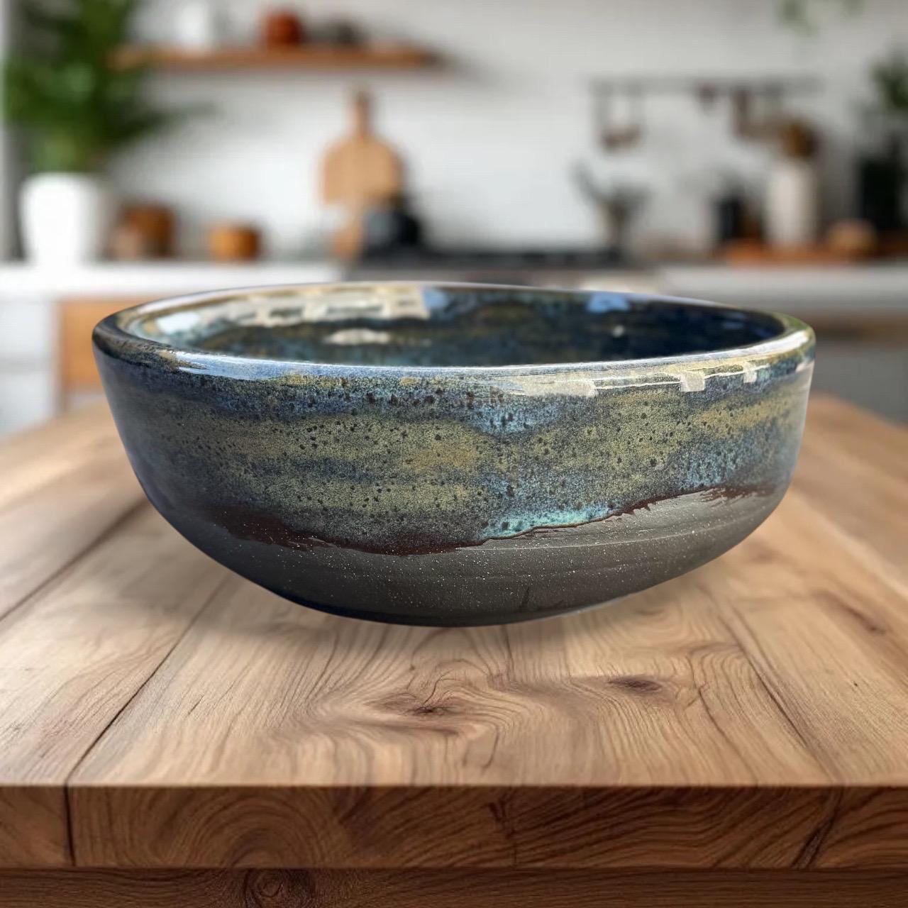 Wheel-thrown ceramic bowl crafted from dark stoneware clay and finished in a layered blend of deep blue, teal, and earthy tones. The exterior shows soft transitions of color and raw clay texture, while the interior features a glossy swirling glaze reminiscent of moving water. Spacious, sturdy, and artfully textured — perfect for serving salads, pasta, fruit, side dishes, or as a functional centerpiece.