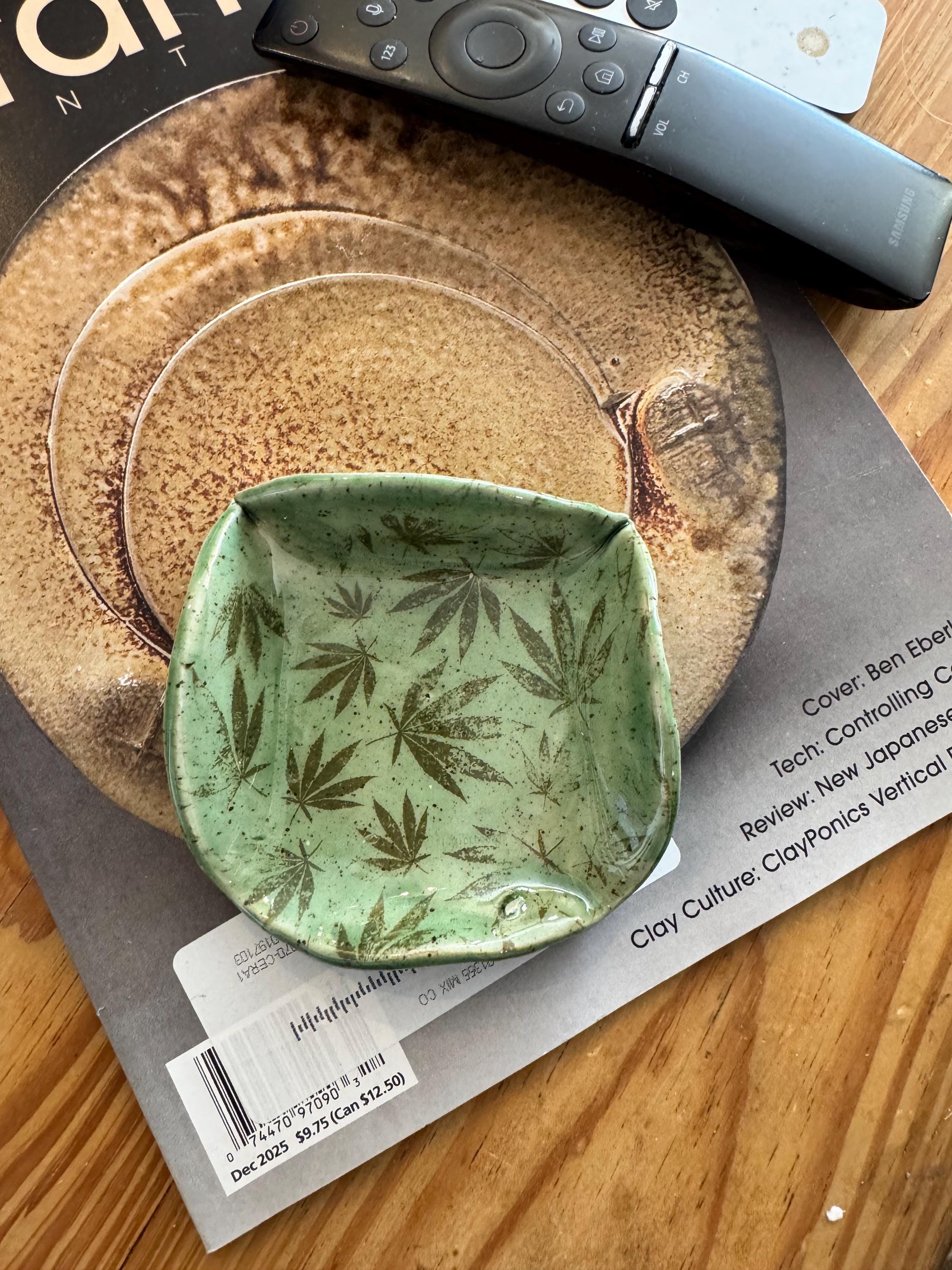 A bold little trinket dish with a perfectly imperfect, organic shape—finished in a soft green glaze and layered with leaf impressions. Use it for jewelry, cones, keys, spices, or anything you don’t feel like explaining. Handmade, earthy, and unapologetically fun.