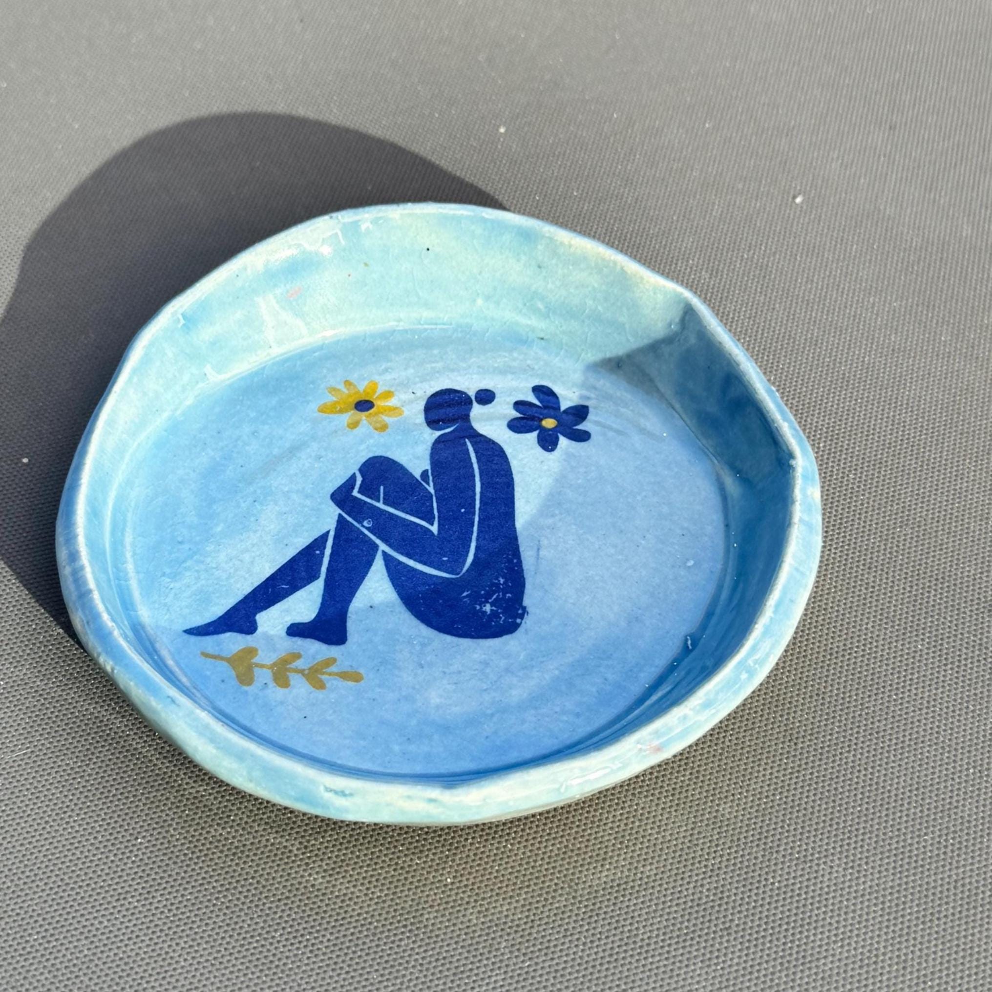 A small handbuilt trinket dish made from white stoneware and finished in a soft blue glaze. The minimalist blue figure and yellow flower design adds a gentle, artistic touch. Its perfectly imperfect organic rim comes from the handbuilding process, giving each dish a natural feel and truly one-of-a-kind character. Lovely on a nightstand, dresser, coffee table, or anywhere you like to set down your everyday essentials.