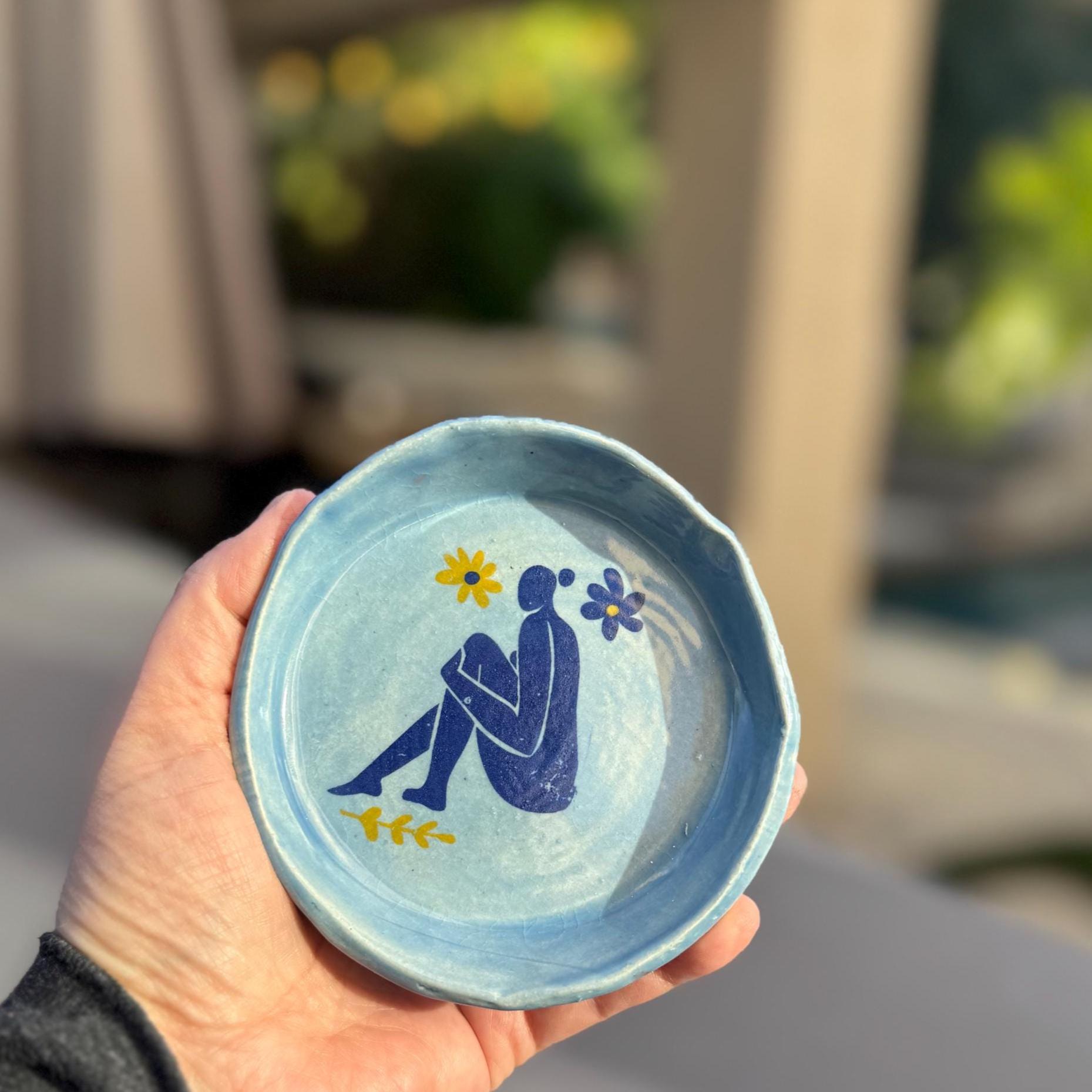 Dimensions & Features ✔ Handbuilt from white stoneware ✔ Blue figure motif with yellow flower accent ✔ Soft blue glaze interior ✔ Perfectly imperfect organic rim ✔ Approx. 4” diameter x ½” tall ✔ Ideal for jewelry, keys, tea bags, or everyday catch-all use