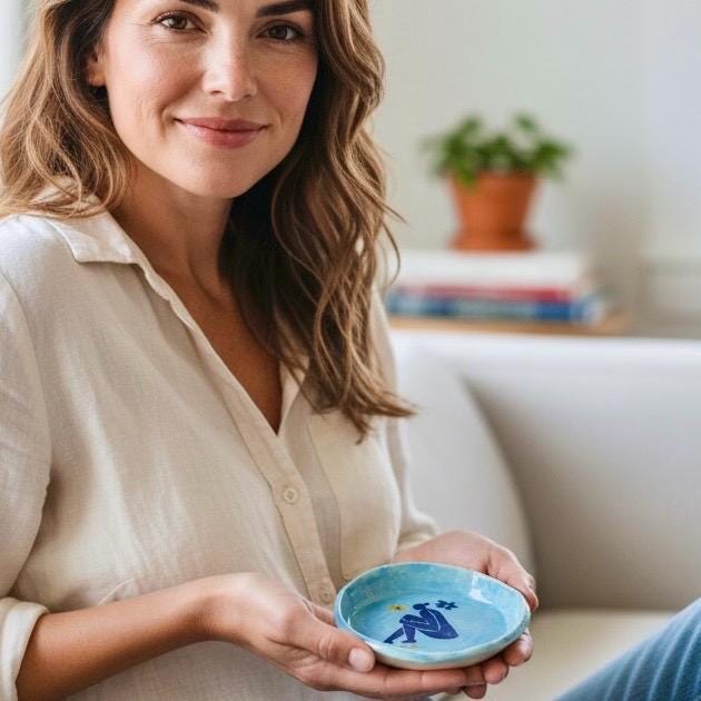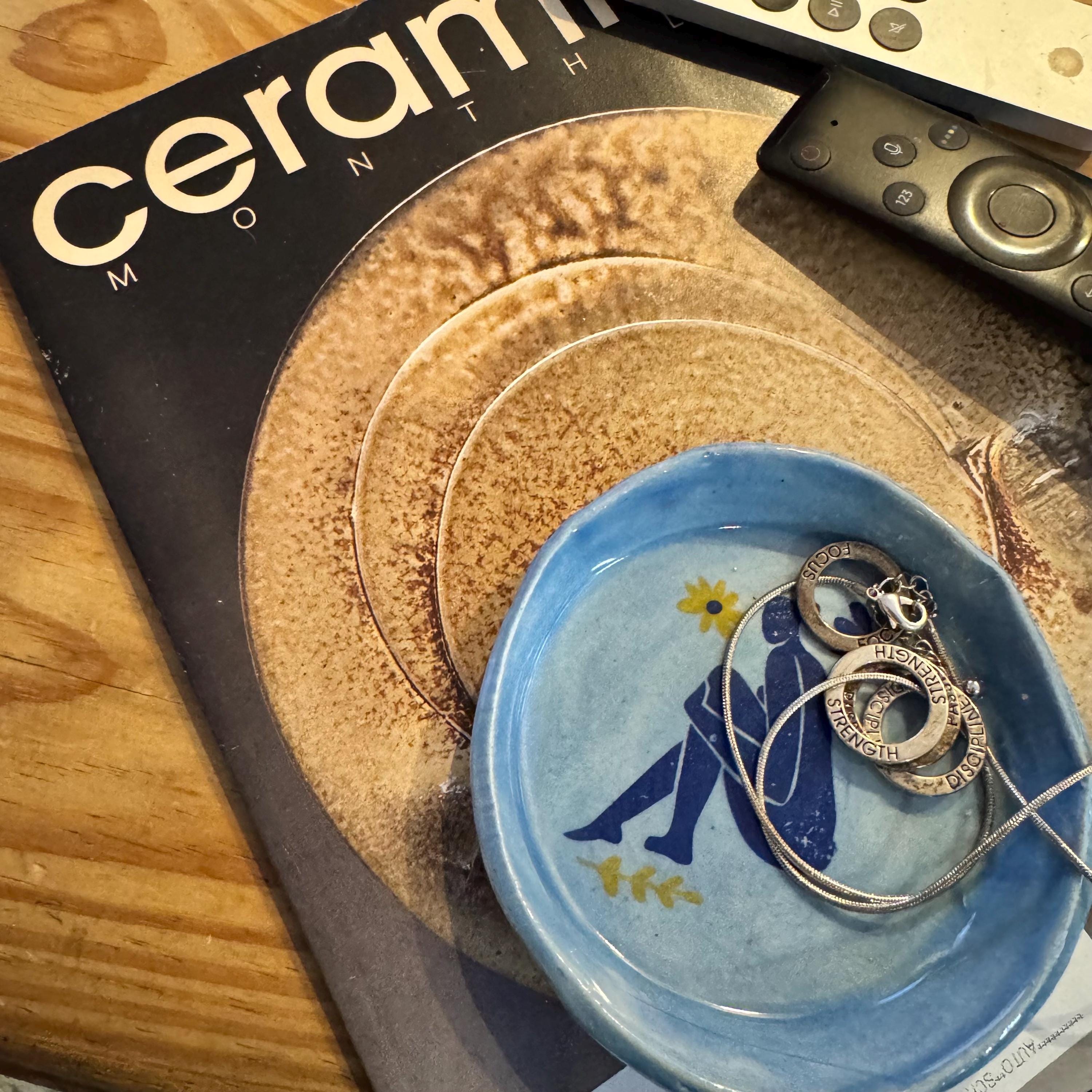 Dimensions & Features ✔ Handbuilt from white stoneware ✔ Blue figure motif with yellow flower accent ✔ Soft blue glaze interior ✔ Perfectly imperfect organic rim ✔ Approx. 4” diameter x ½” tall ✔ Ideal for jewelry, keys, tea bags, or everyday catch-all use