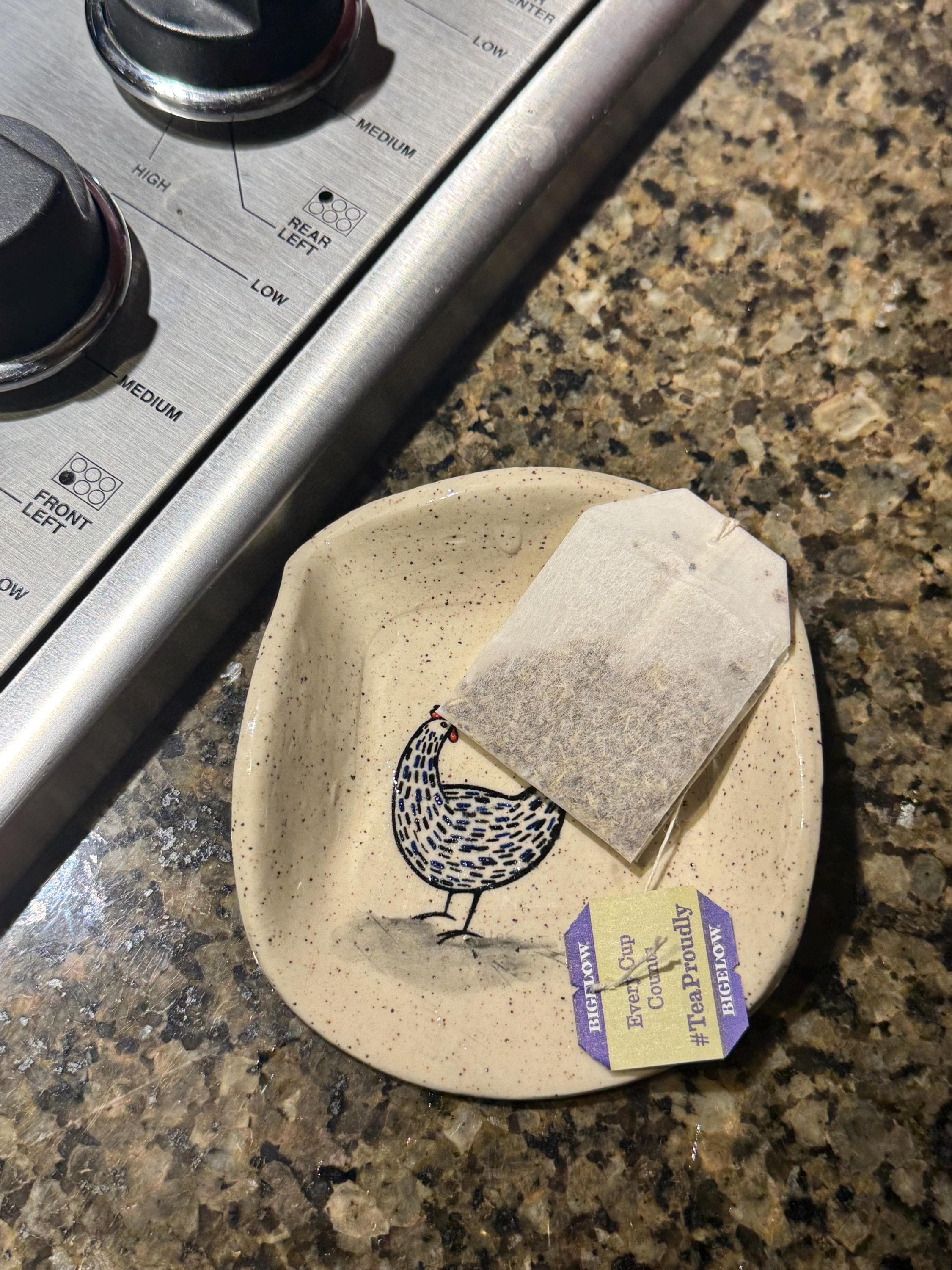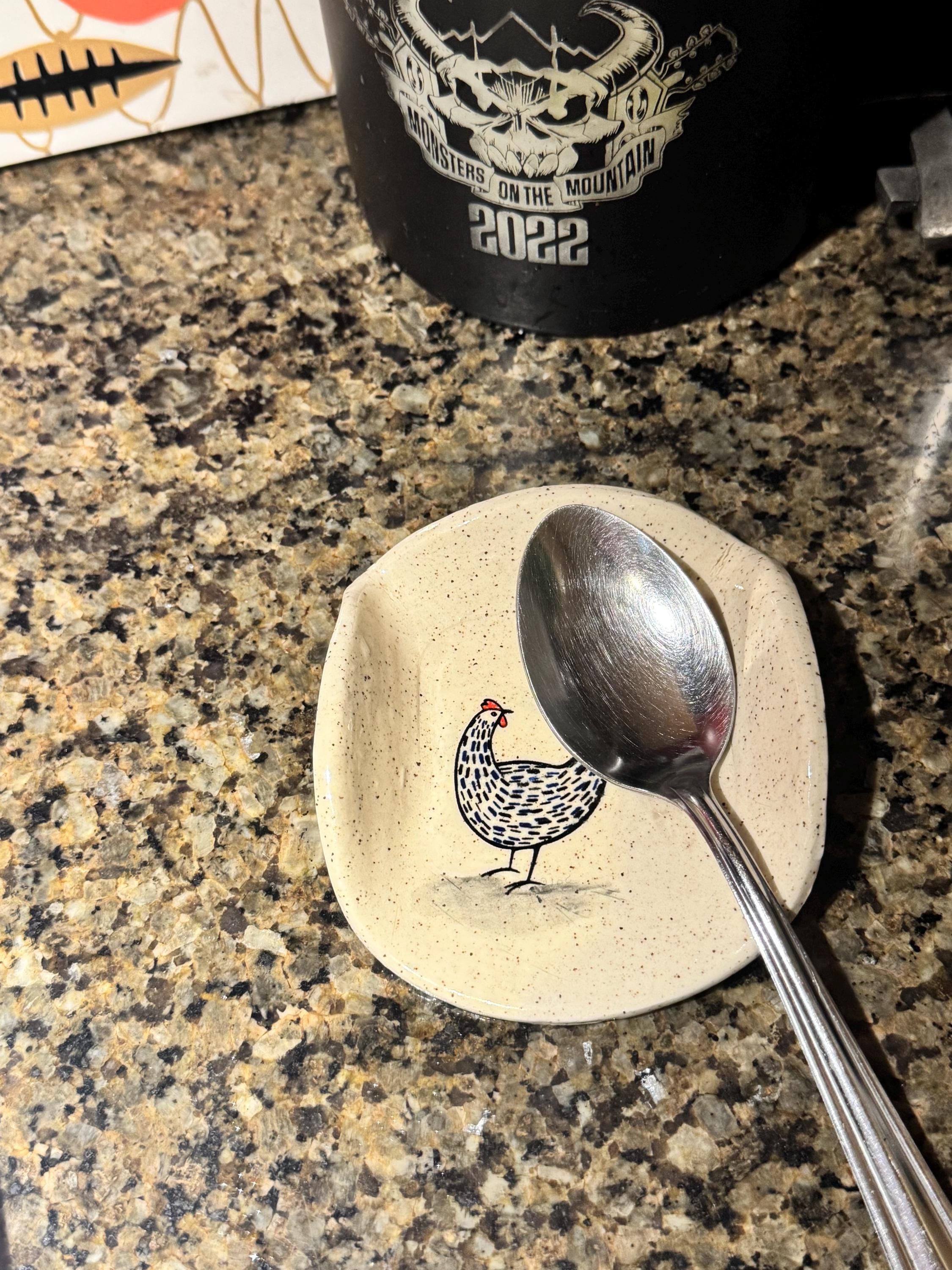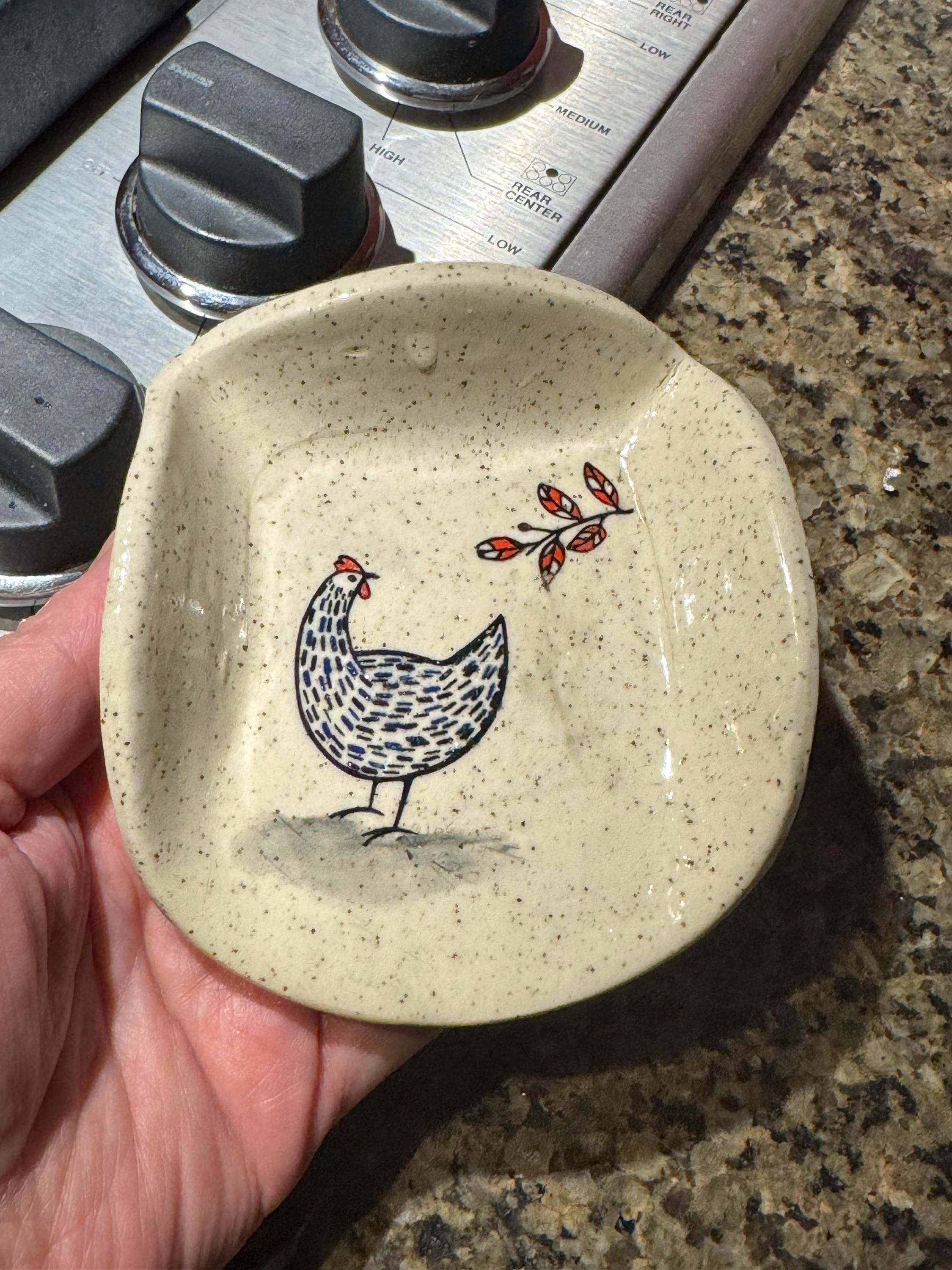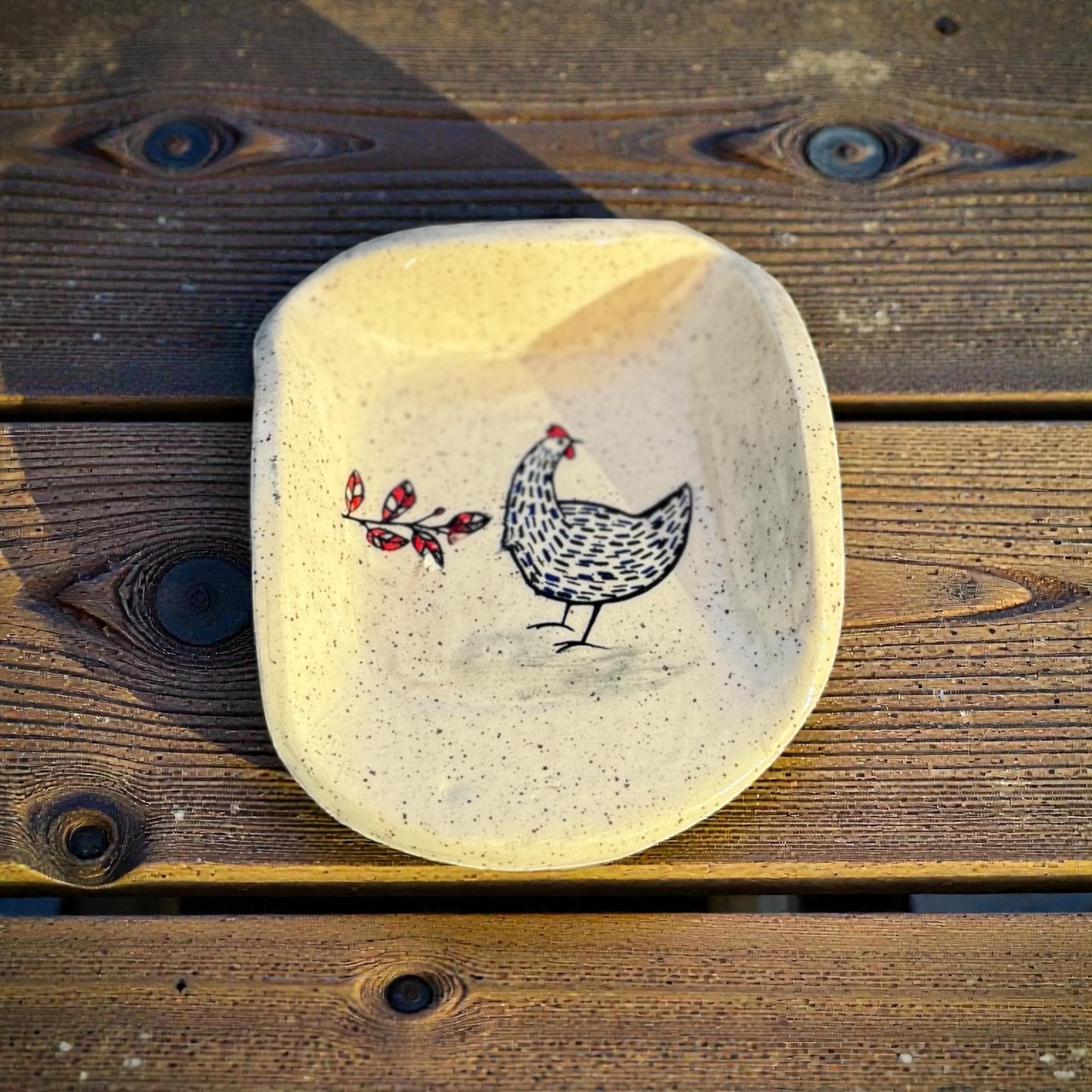 Dimensions & Features ✔ Handbuilt from sparkle stoneware ✔ Illustrated chicken and red leaf design ✔ Organic, perfectly imperfect shape ✔ Approx. 3” wide x 4” deep ✔ Great as a spoon rest, tea bag holder, or small countertop dish ✔ Food safe; microwave & dishwasher safe (hand washing recommended)