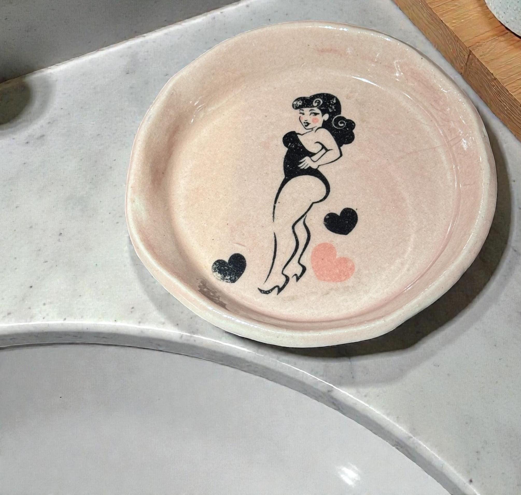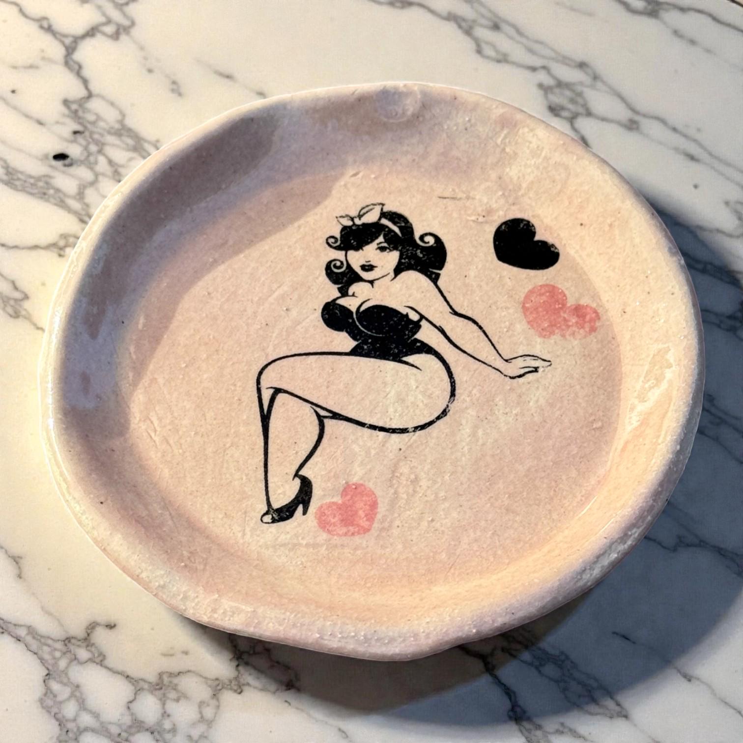 A handbuilt ceramic ring dish crafted from white stoneware and finished in a soft blush-pink glaze. Featuring a retro pin-up illustration with delicate heart accents, this piece blends vintage charm with playful femininity.