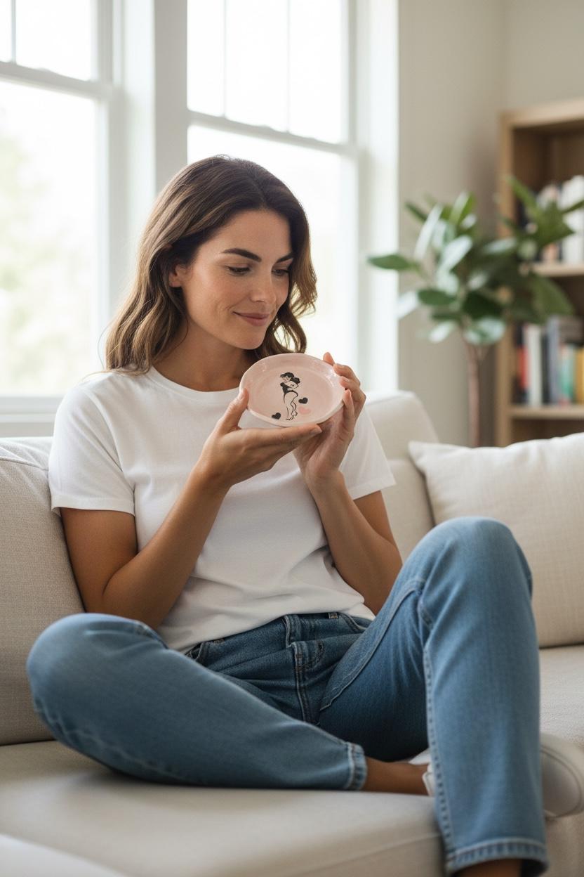 Dimensions & Features ✔ Handbuilt from white stoneware ✔ Pink glaze with retro pin-up and heart details ✔ Perfectly imperfect organic rim ✔ Approx. 4” diameter ✔ Ideal for jewelry, keys, coins, or bedside catch-all use ✔ Food safe; microwave & dishwasher safe (hand washing recommended)