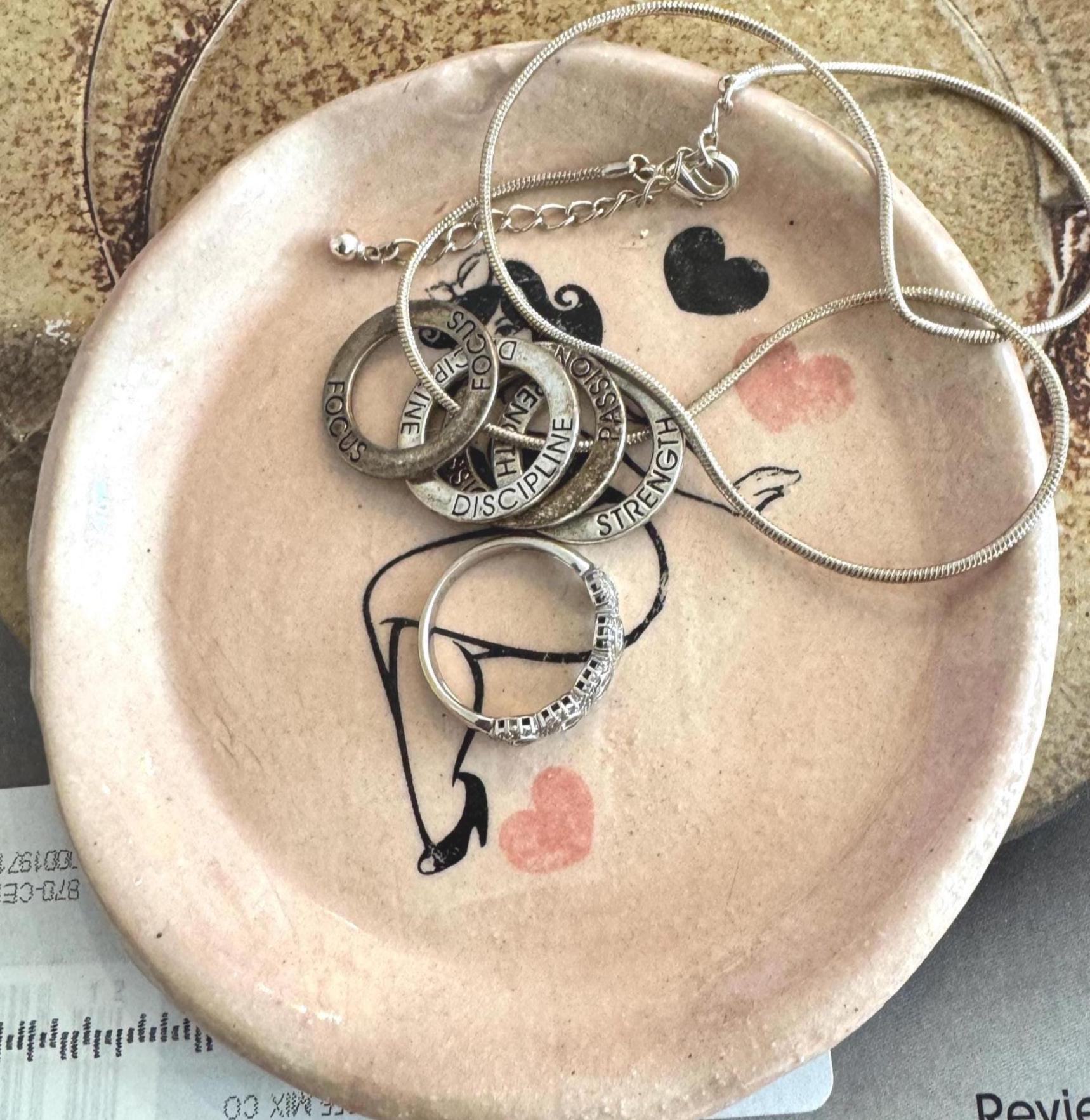 ✔ Handbuilt from white stoneware ✔ Soft pink glaze with retro pin-up + heart detail ✔ Slightly organic, hand-formed rim ✔ Approx. 4” diameter ✔ Ideal for rings, earrings, necklaces, keys, or small keepsakes ✔ Food safe; microwave & dishwasher safe (hand washing recommended)