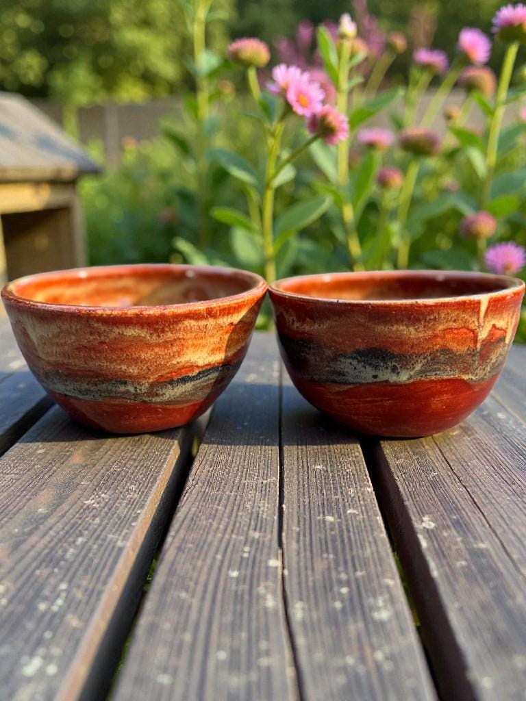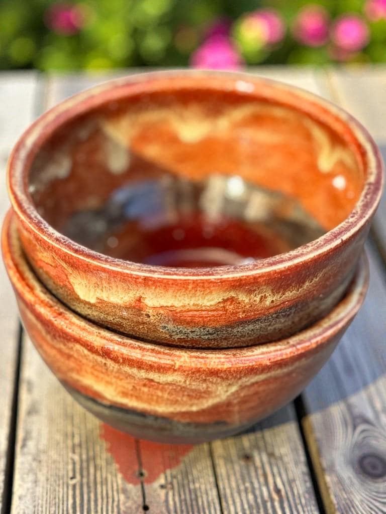Wheel-thrown ceramic bowl set crafted from stoneware clay and finished in rich, layered red, rust, and earthy tones. Each bowl is made as a matching pair but finished individually, making them true “sisters, not twins.” The glaze breaks and flows naturally across the surface, creating depth, texture, and subtle variation that highlights the handmade process. Ideal for snacks, dips, desserts, prep bowls, or small servings — functional, sturdy, and full of character.