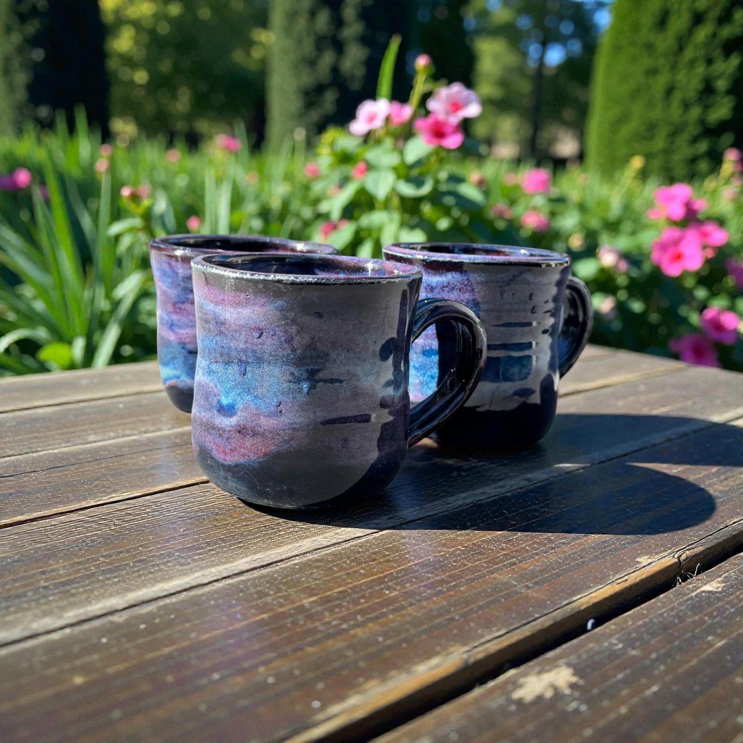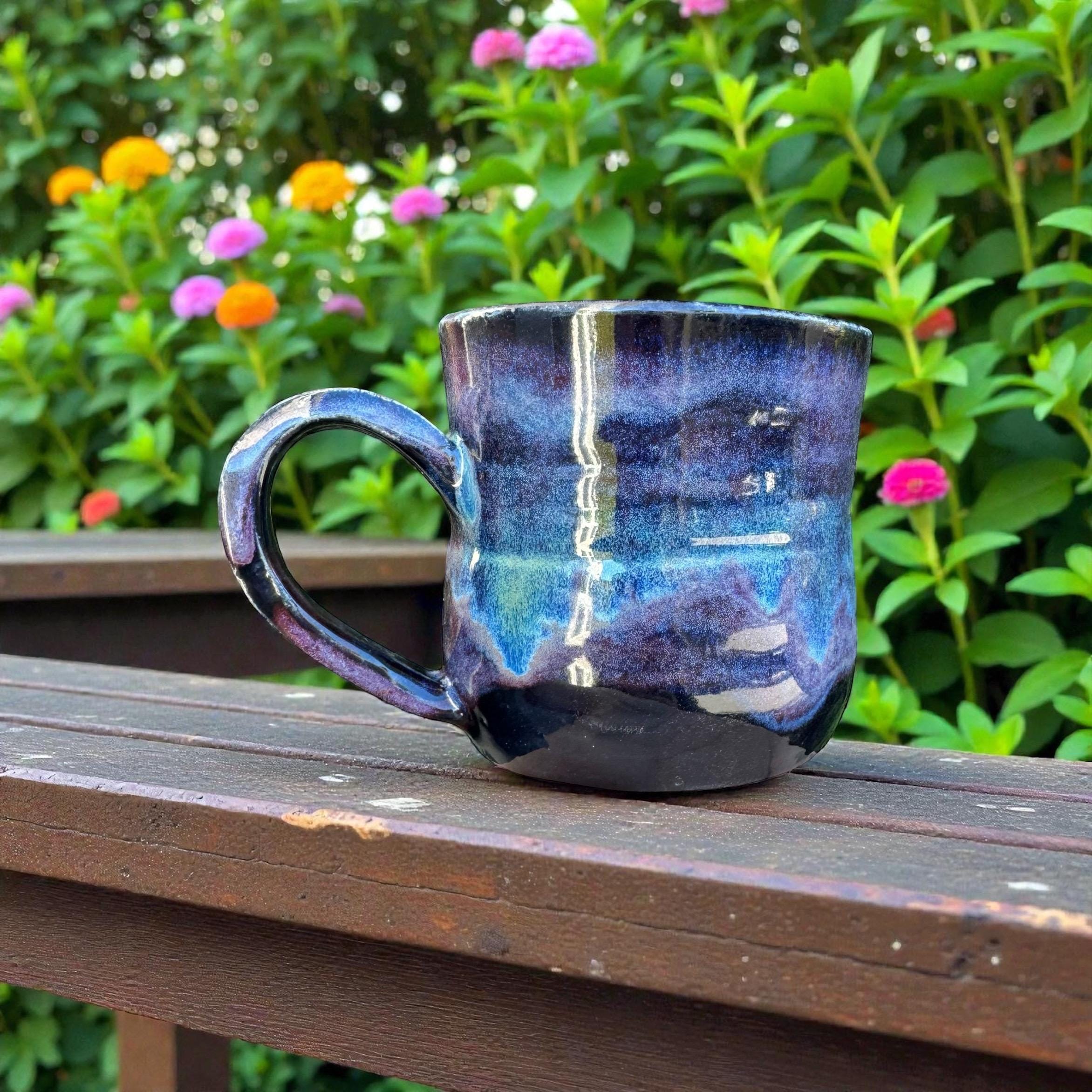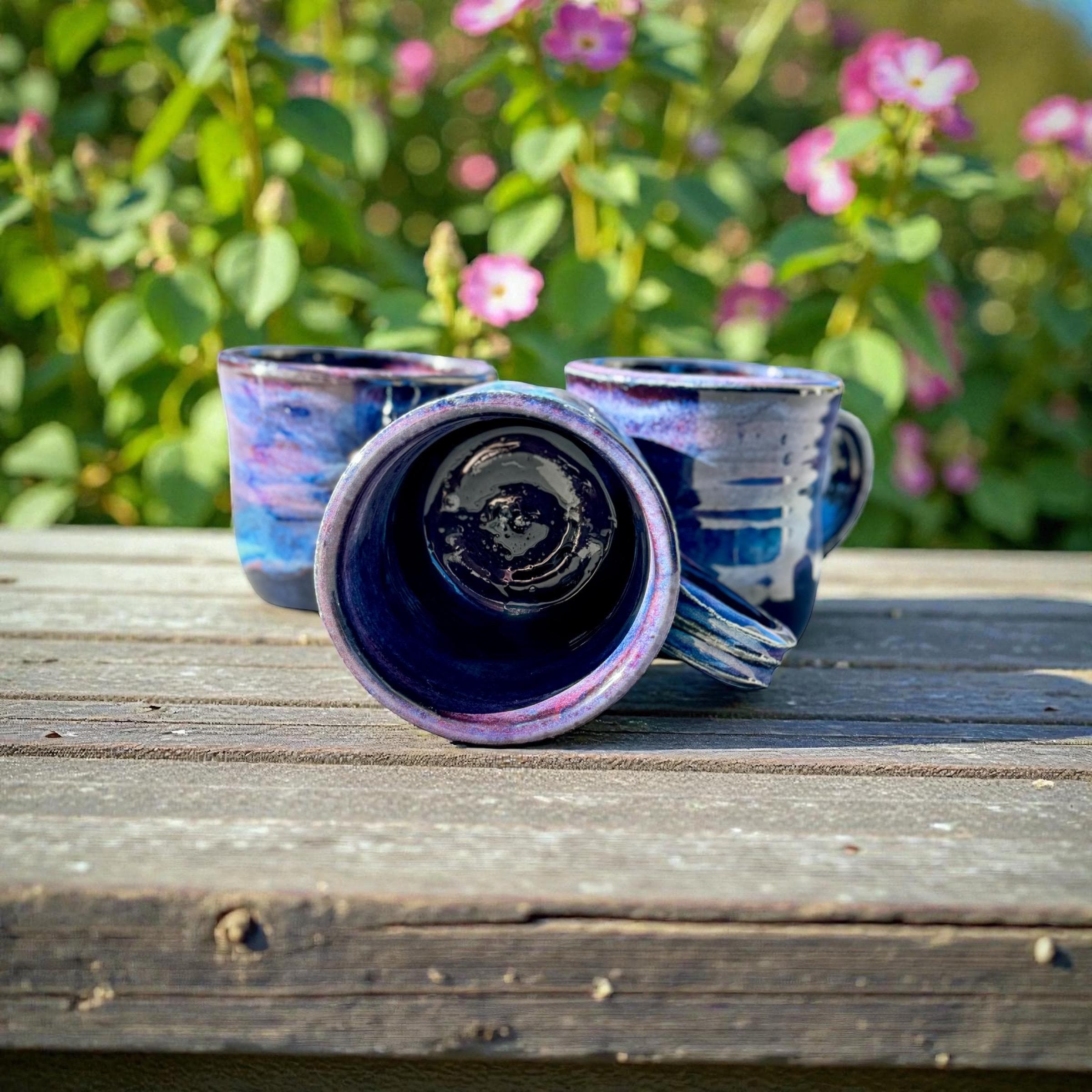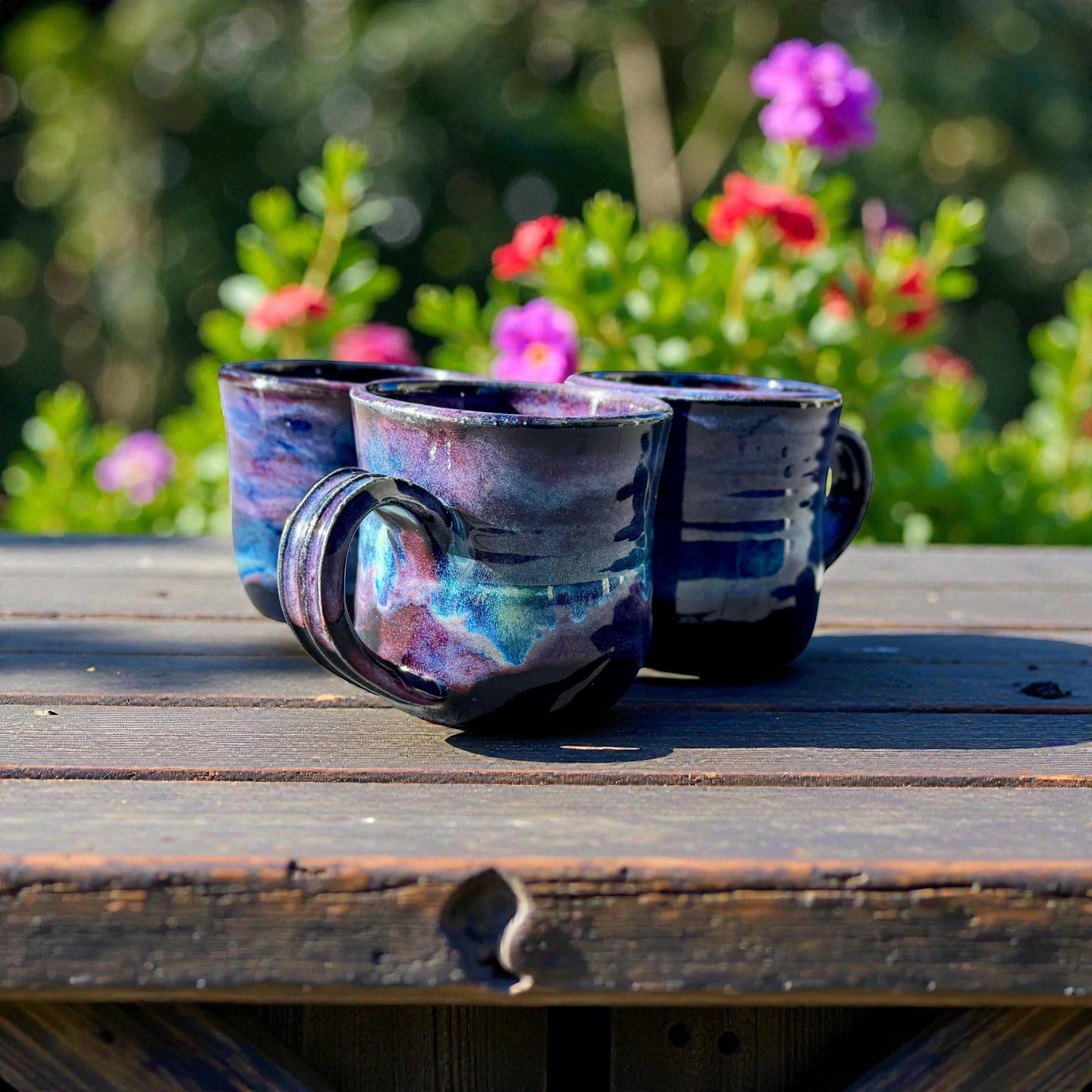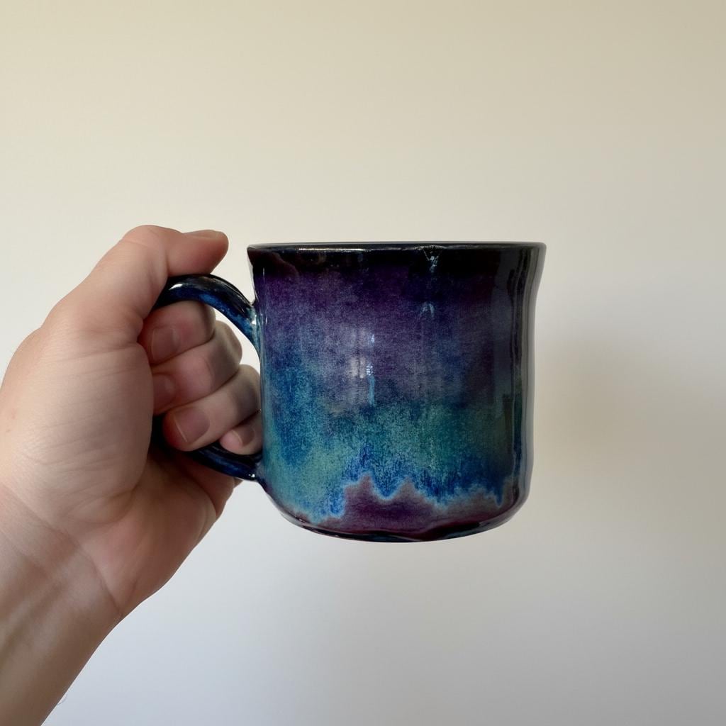 This stunning mug features our Northern Lights glaze technique, blending deep midnight blues, vibrant purples, and shimmering aqua tones. The swirling colors mimic the beauty of the aurora borealis, making each mug a small work of art.