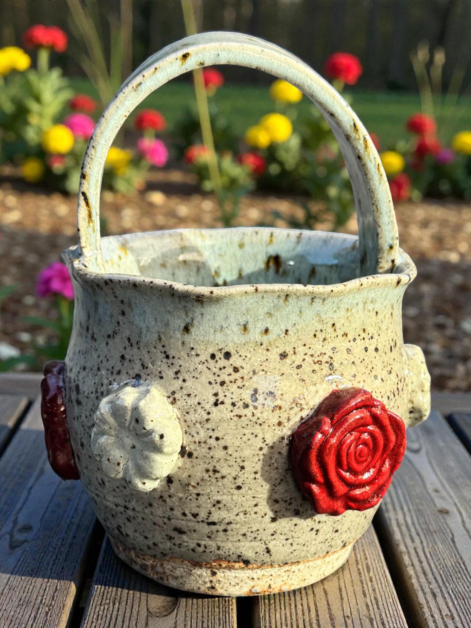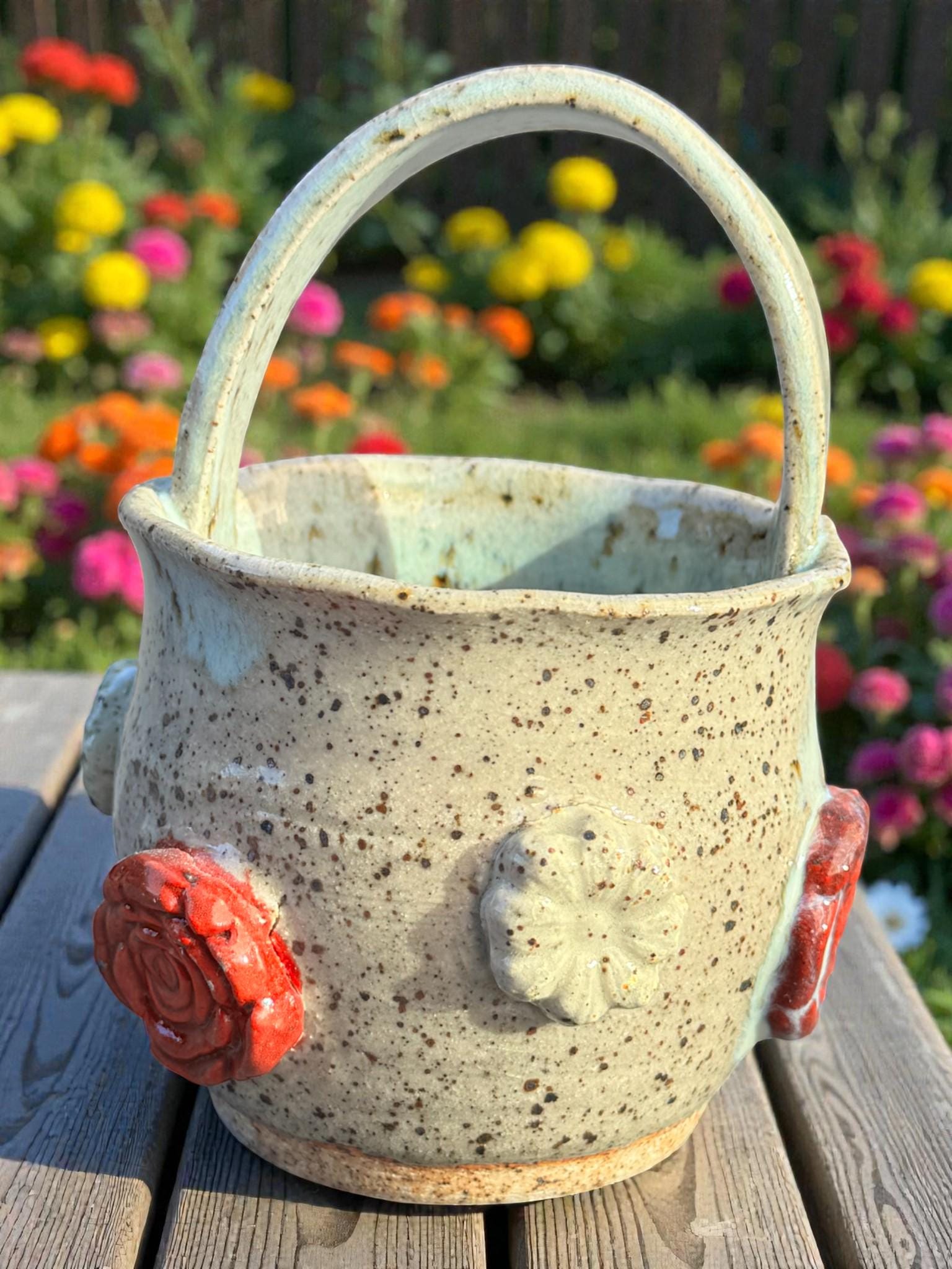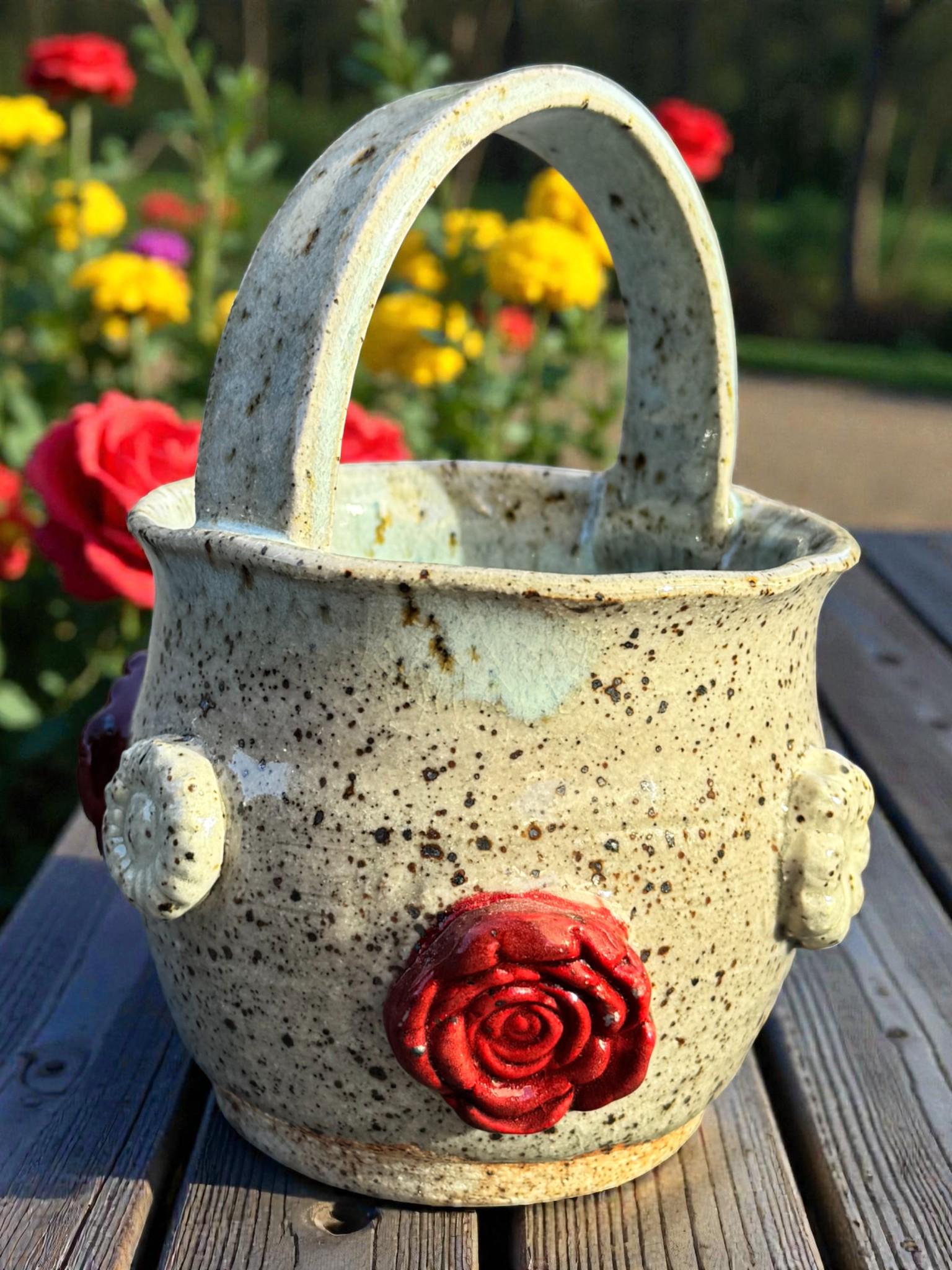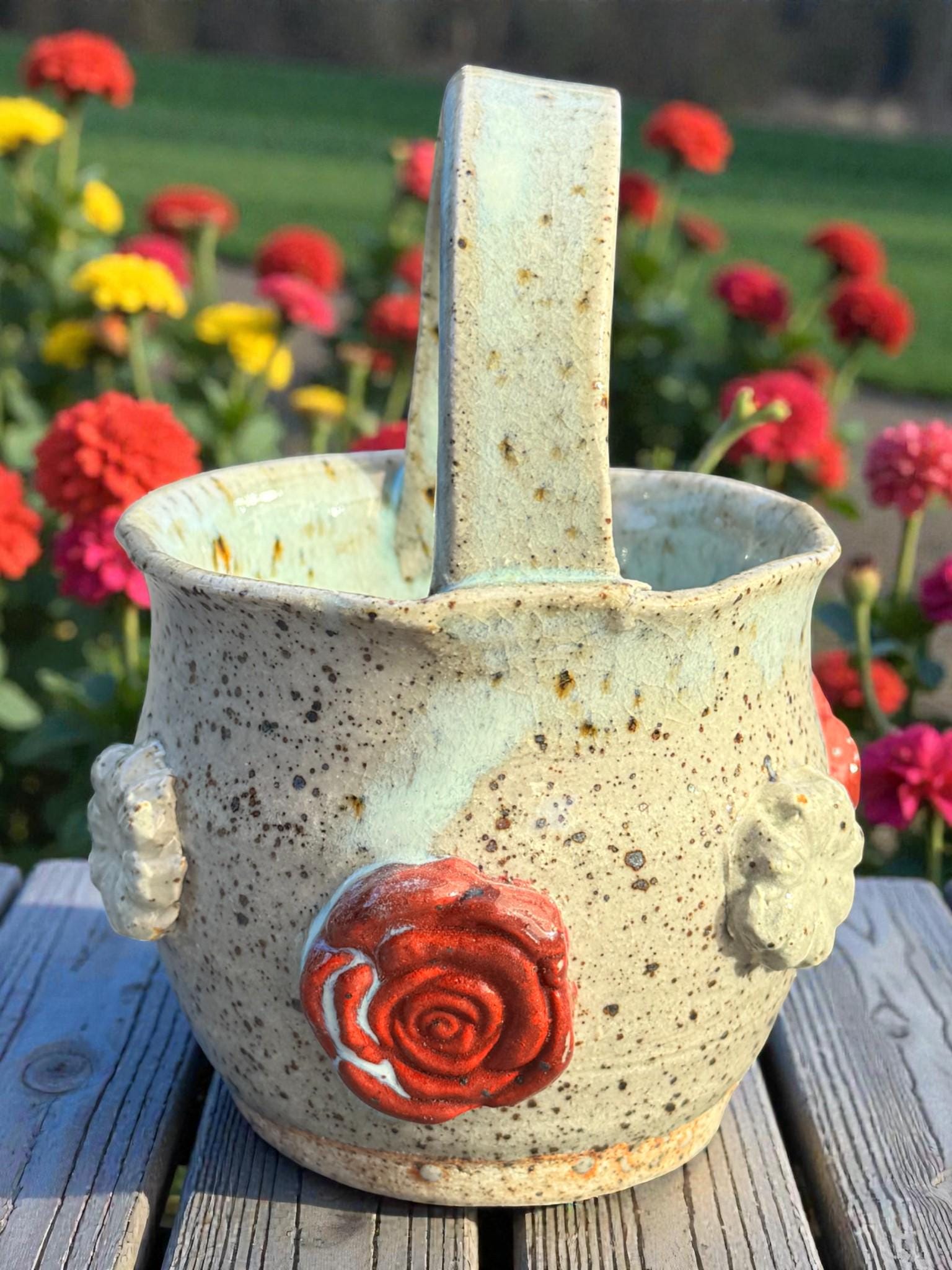 Dimensions & Features • Basket body: approx. 3” tall • Width at lip: 4” • Total height (with handle): 5” • Stoneware clay, wheel-thrown and hand-finished