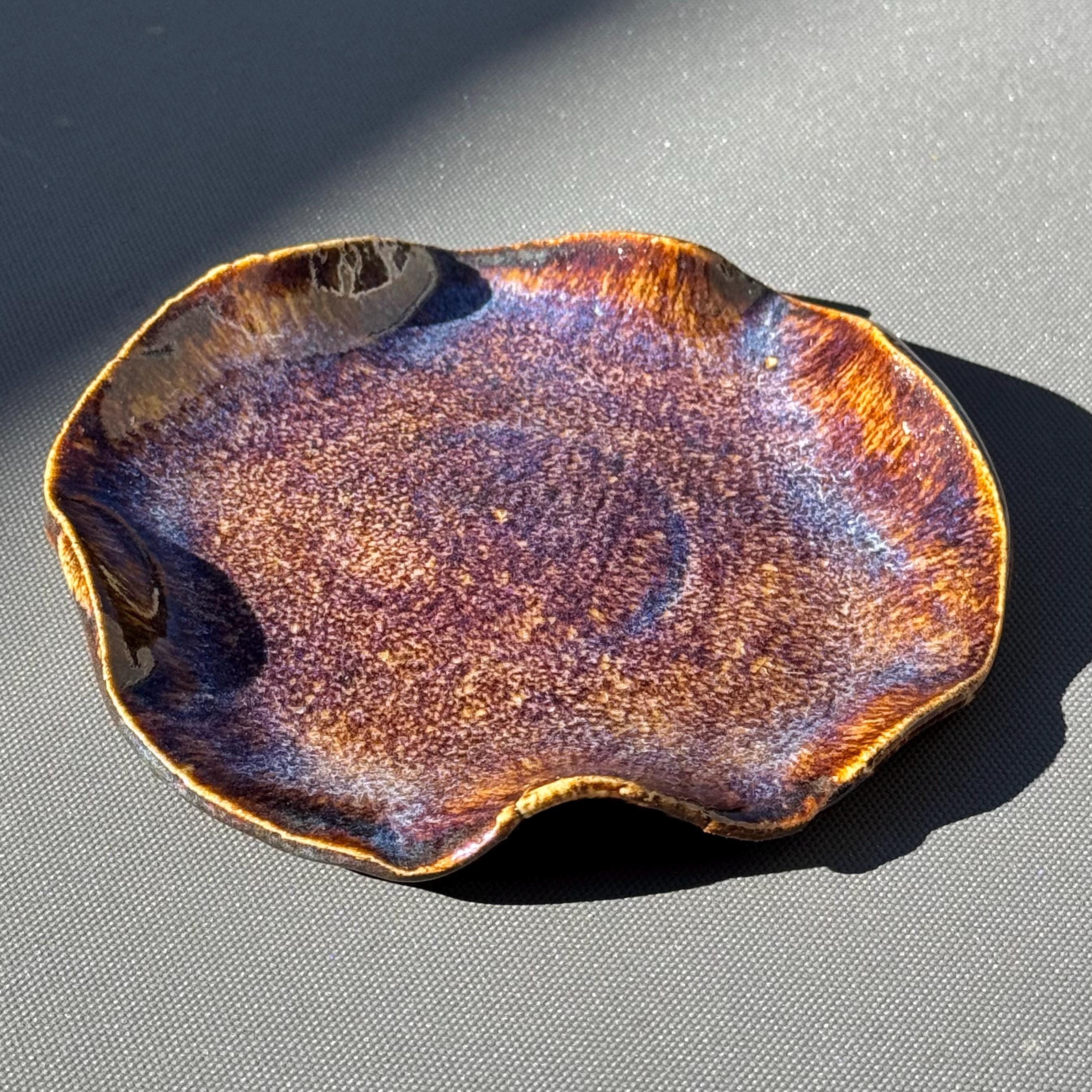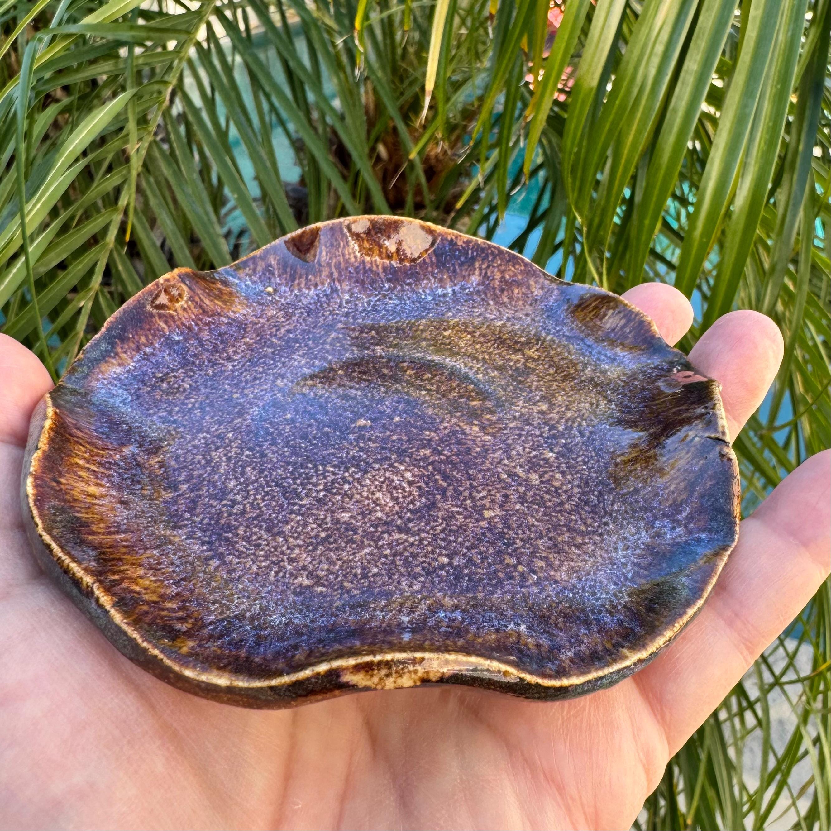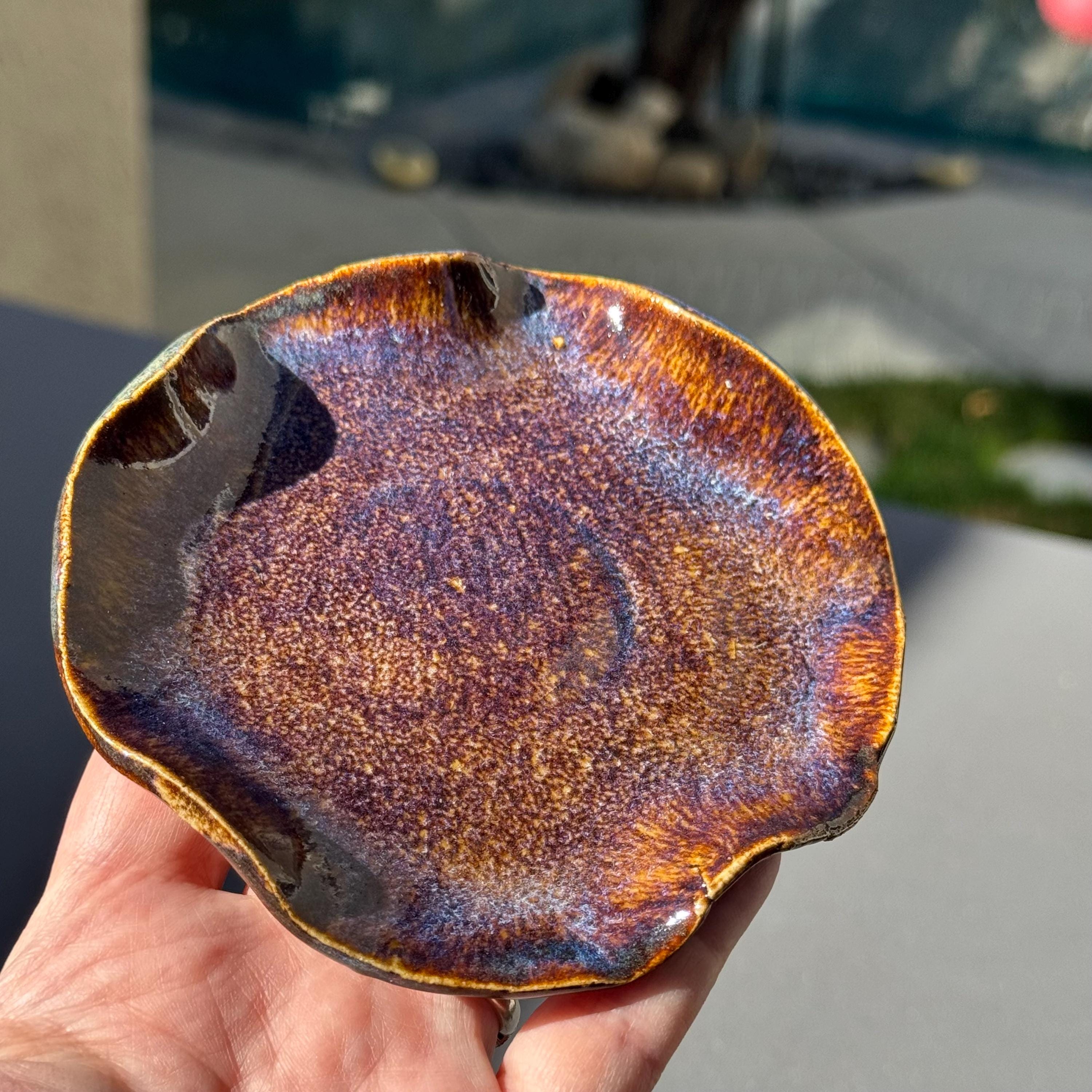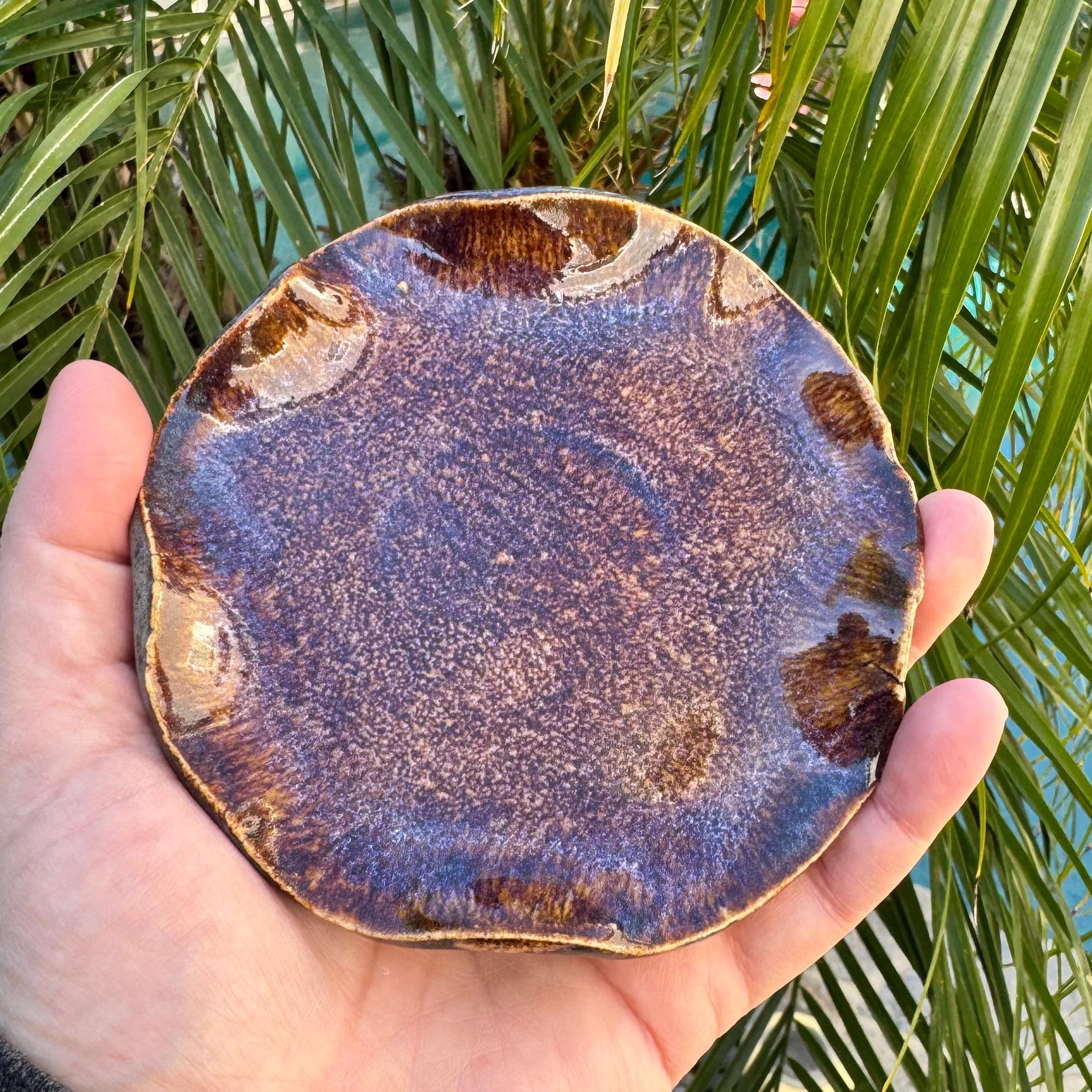 Dimensions & Features * Approx. 4” wide x 4” long x 0.5” tall * Handbuilt trinket dish with organic, wavy edges * Earthy glaze palette with deep plum, indigo, and warm brown tones * Made from mixed stoneware clays * Ideal for jewelry, keys, tea bags, candles, or small desk items * One-of-a-kind — each dish has its own shape and glaze pattern